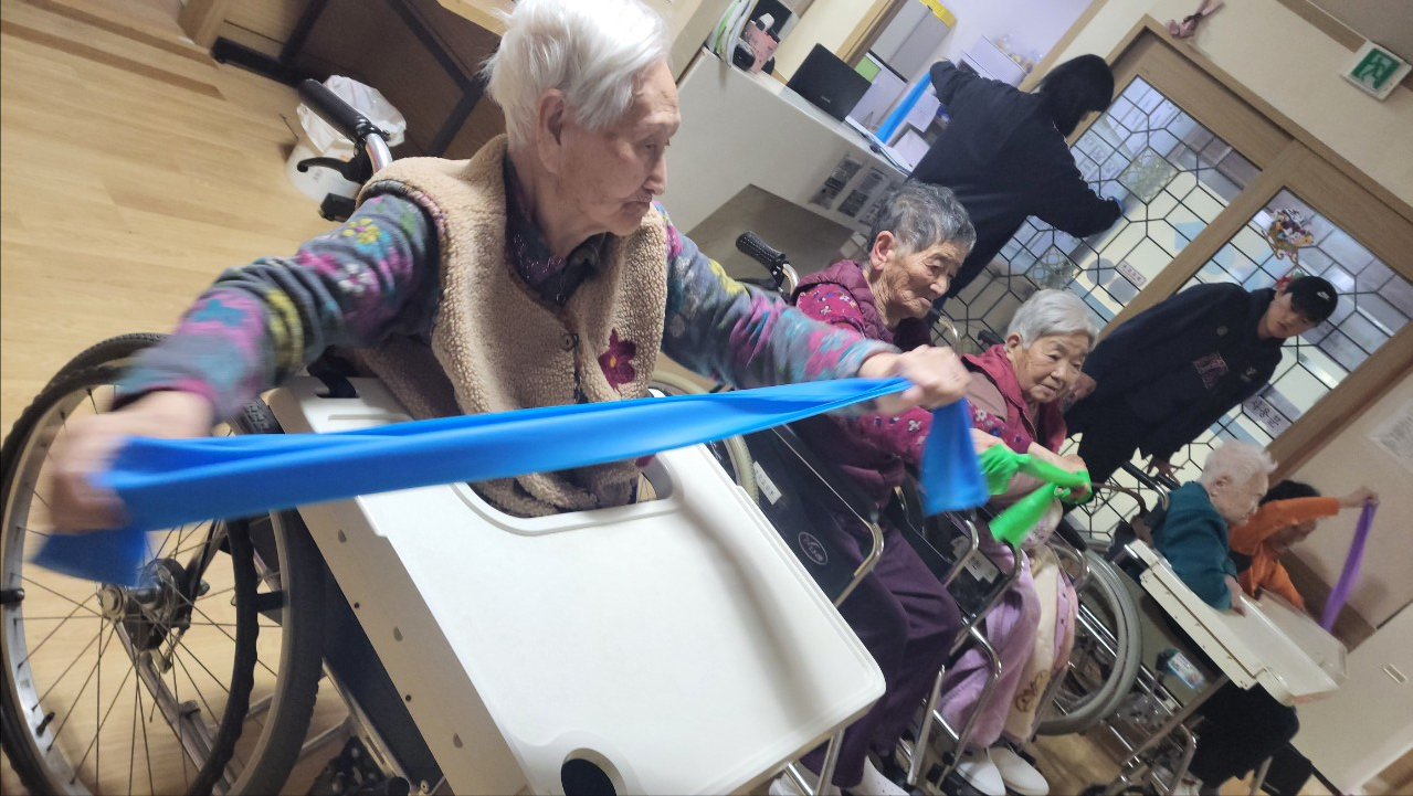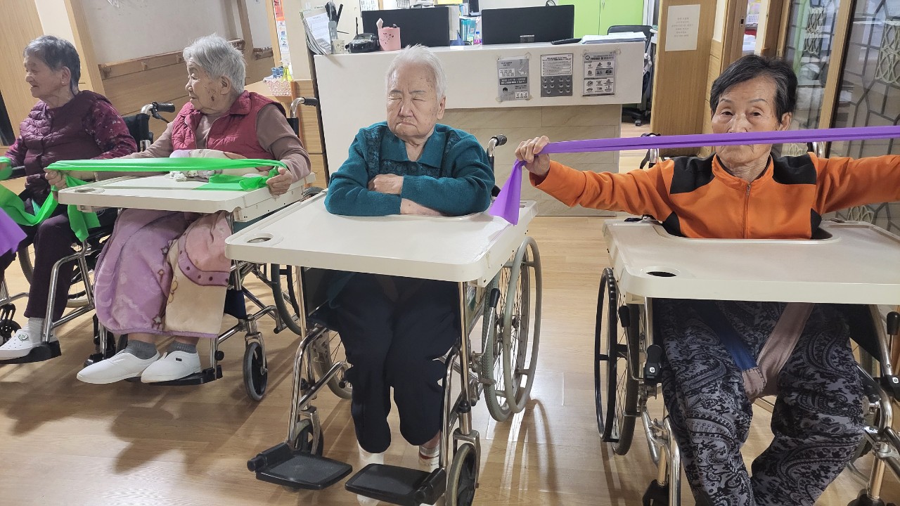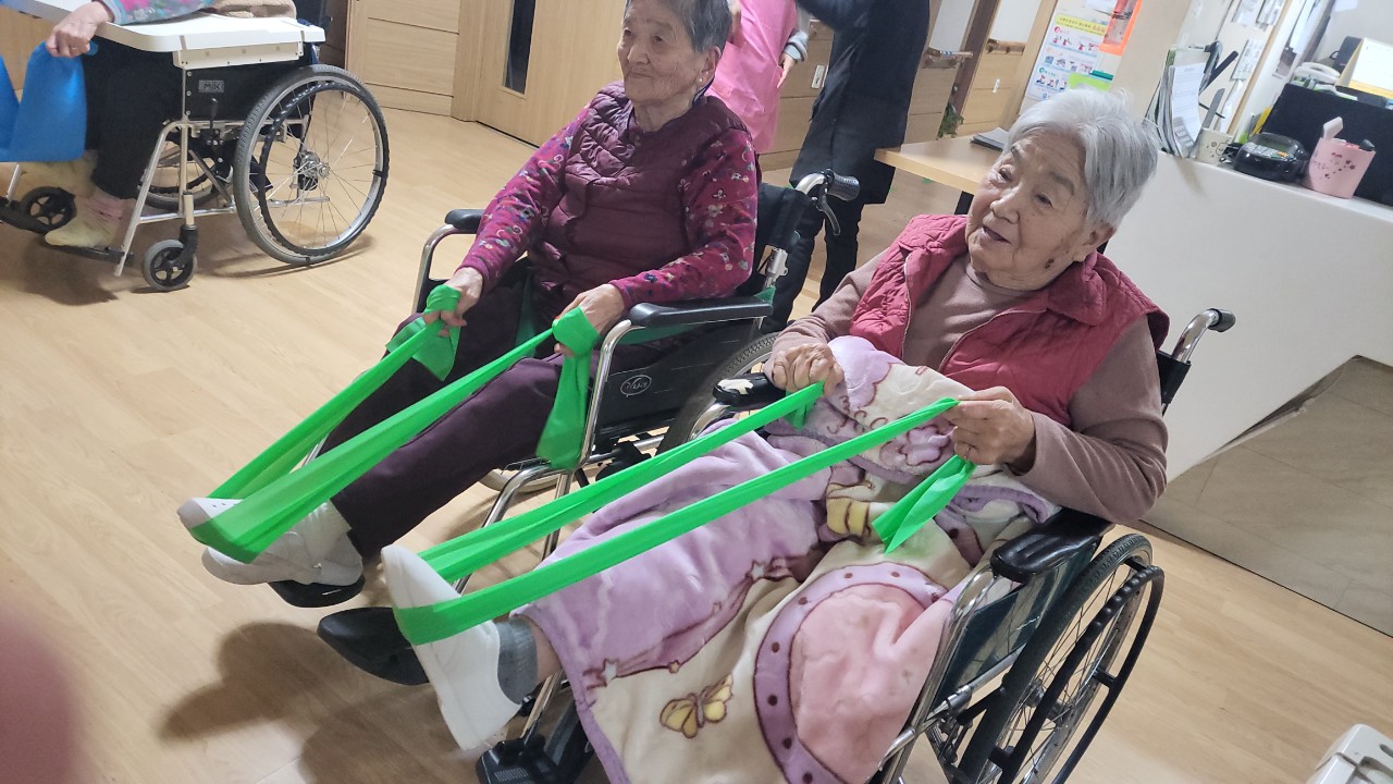 ② 어르신들에게 탄성밴드를 배분해 드린다.