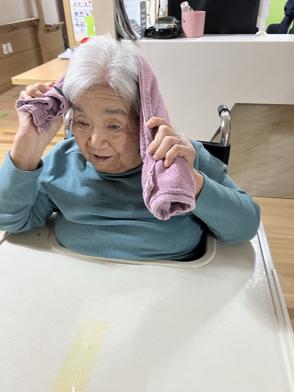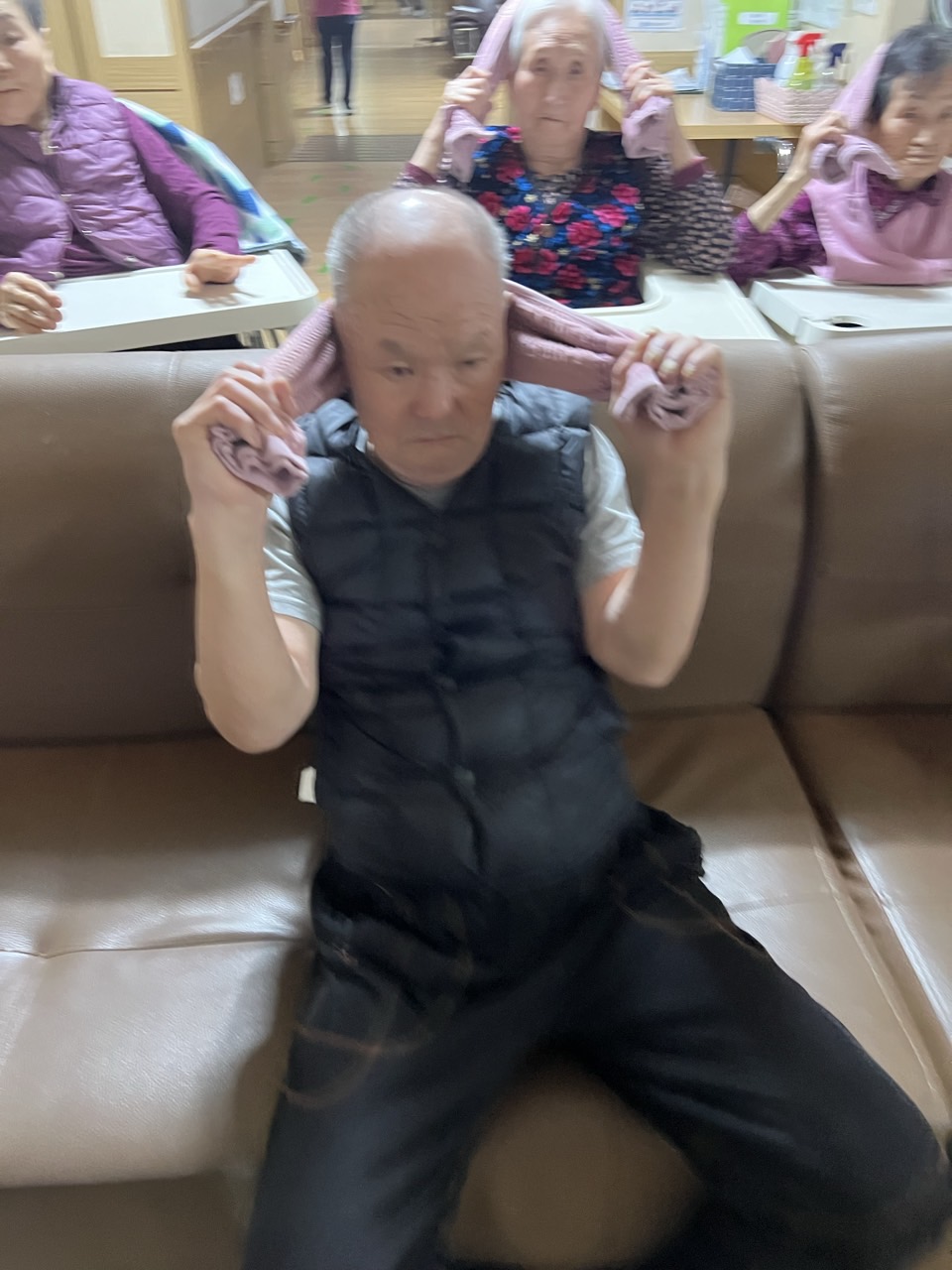 앉거나 누운 자세에서 부분 도움을 받아 타월을 이용하여 상체 운동을 해본다.
