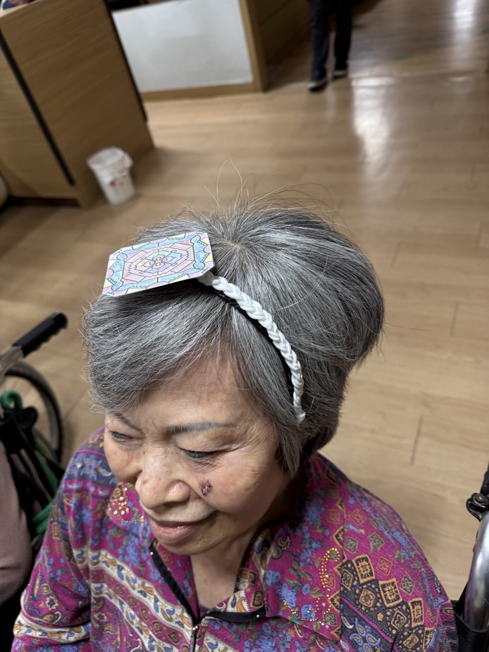 도움을 받아 고무줄로 머리를 땋아보고 머리띠에 붙여서 꾸며 볼 수 있습니다.