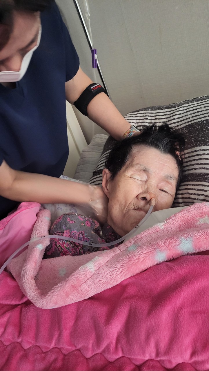 ② 진행 : 앉은자세에서 코에 오일냄새를 맡게 하고, 목 뒤쪽 후두하부를 롤링기법으로 마사지를 해준다