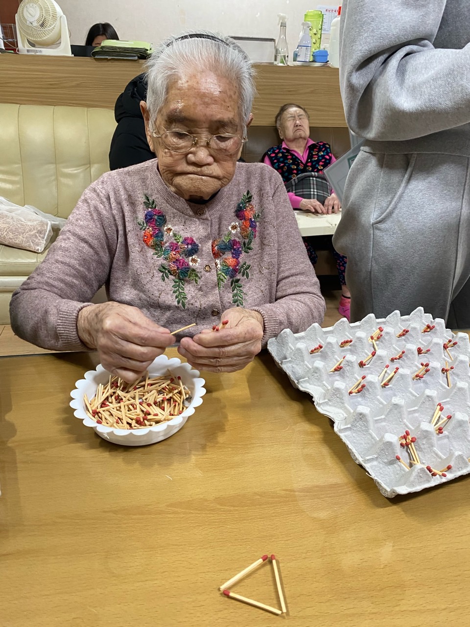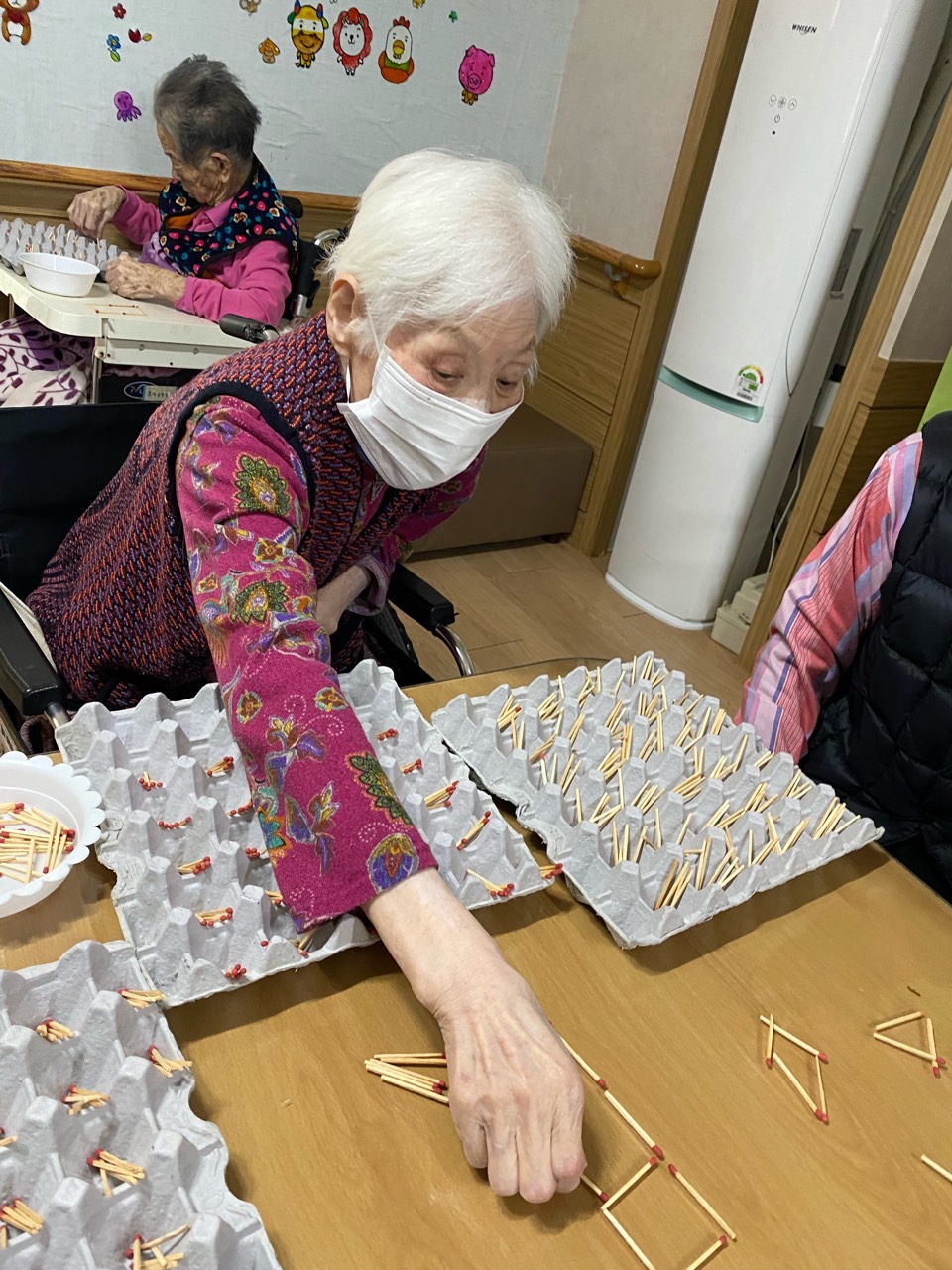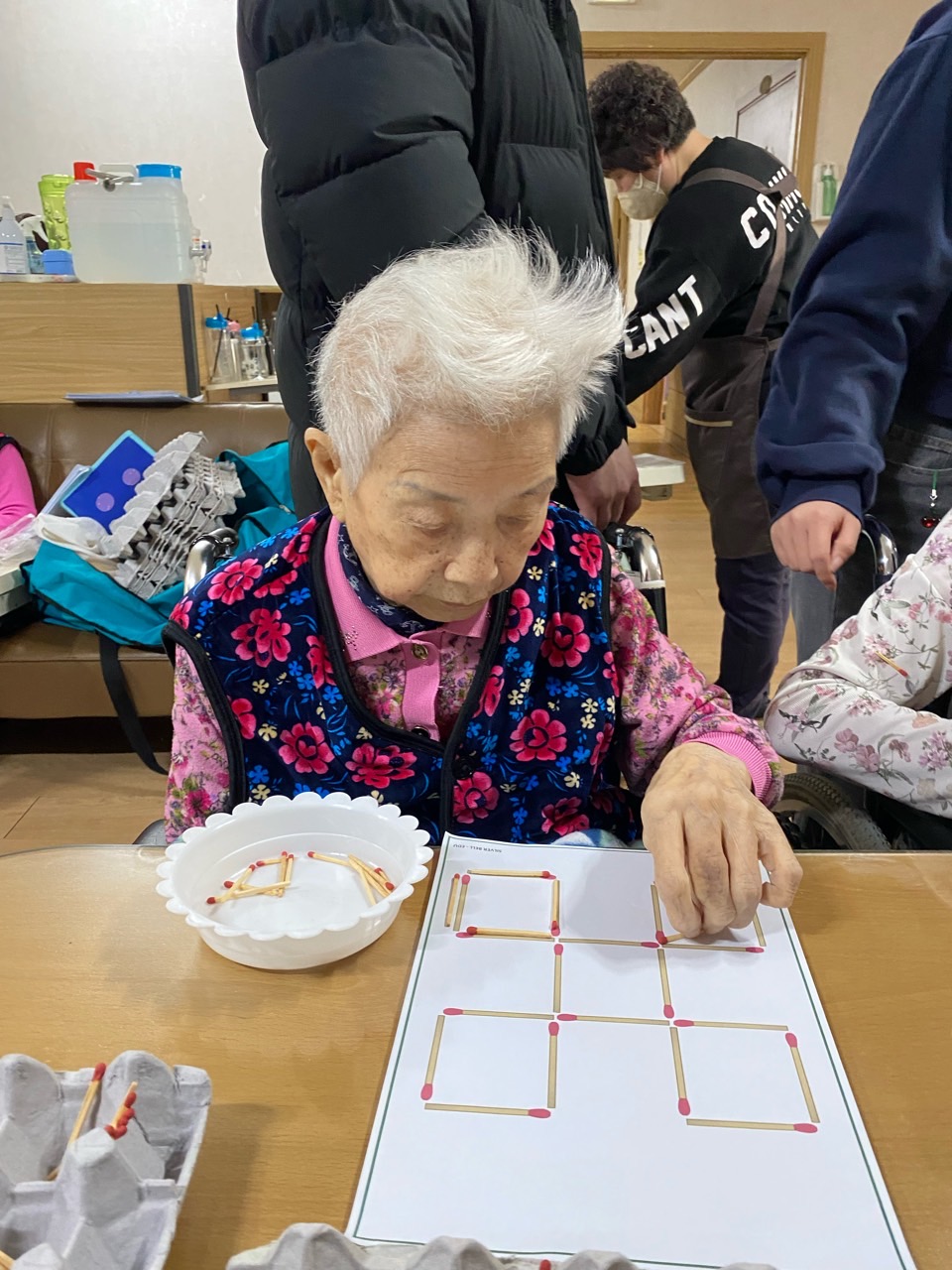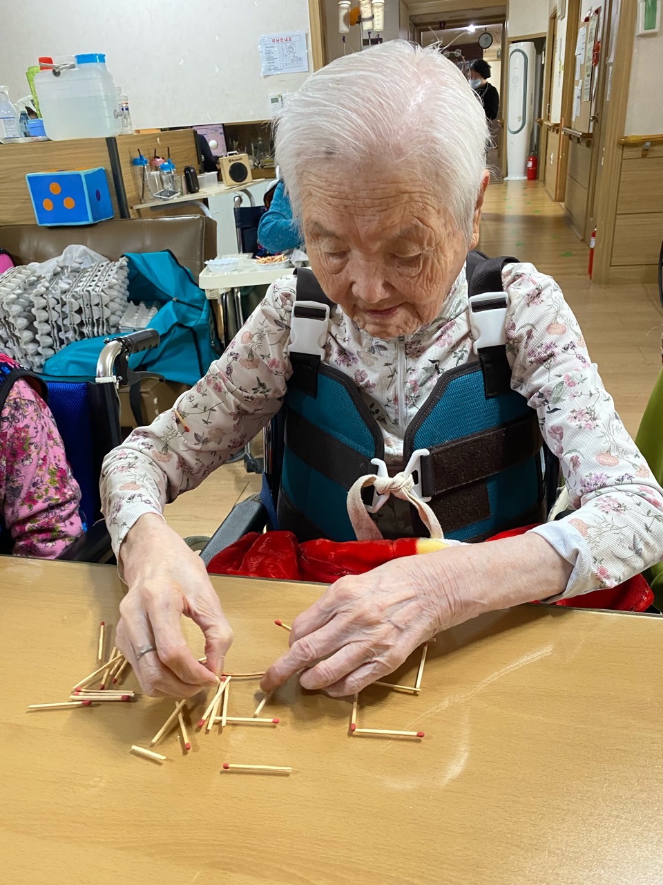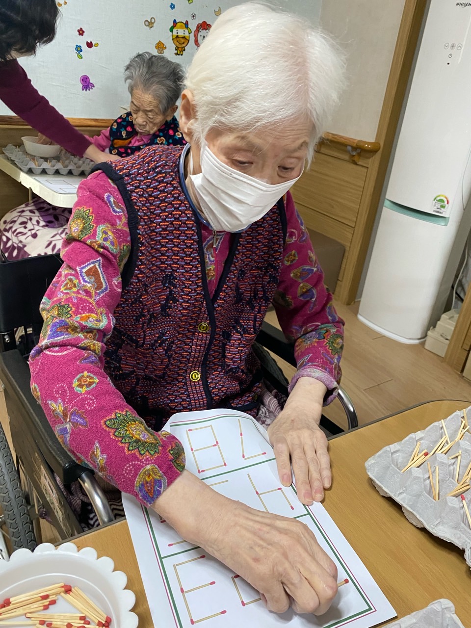 성냥으로 다양한 구성물을 완성해보도록 하여 대상자의 성취감을 충족시키고 손의 근육조직을 발달시킨다.