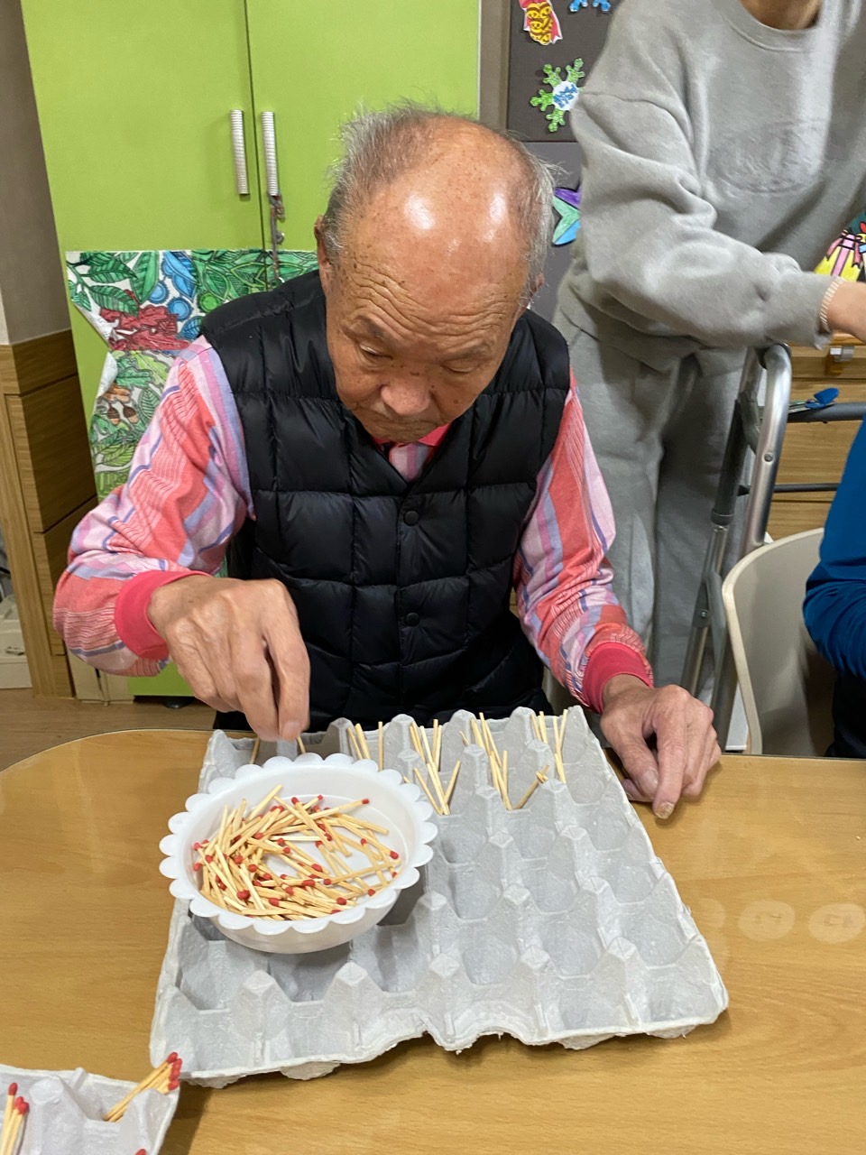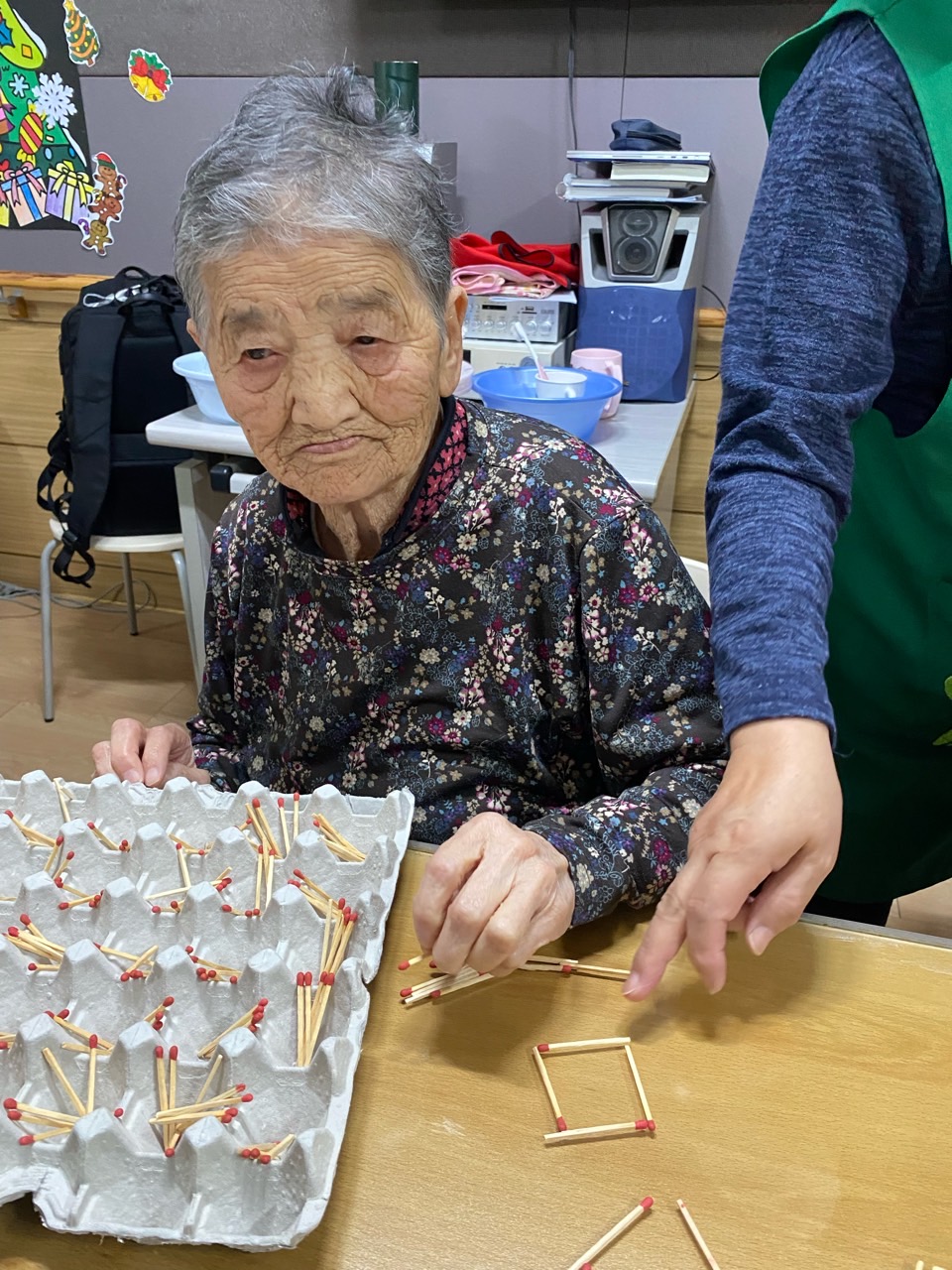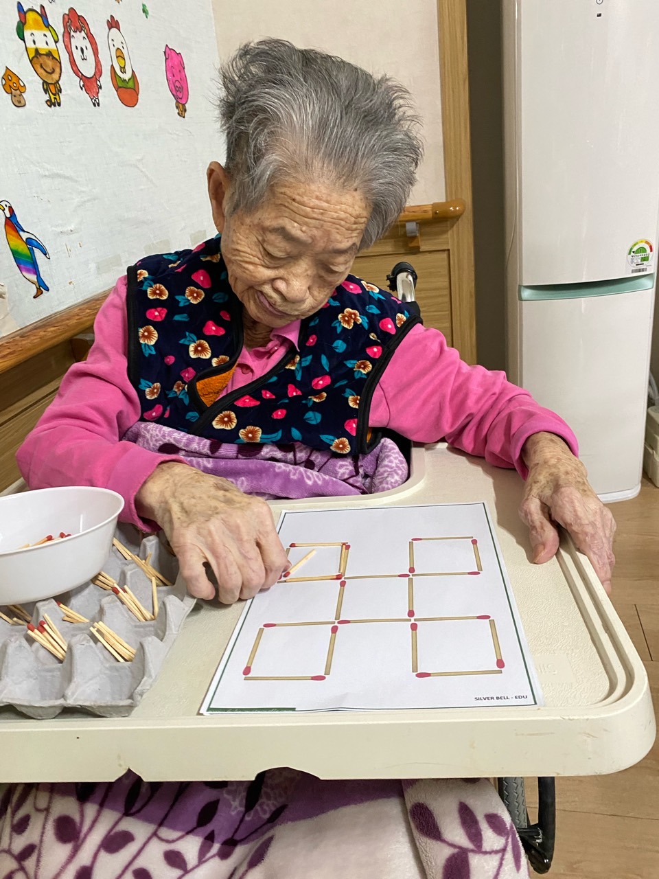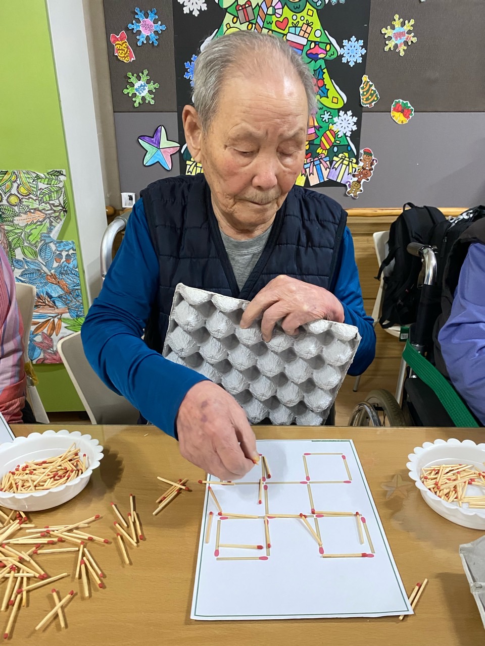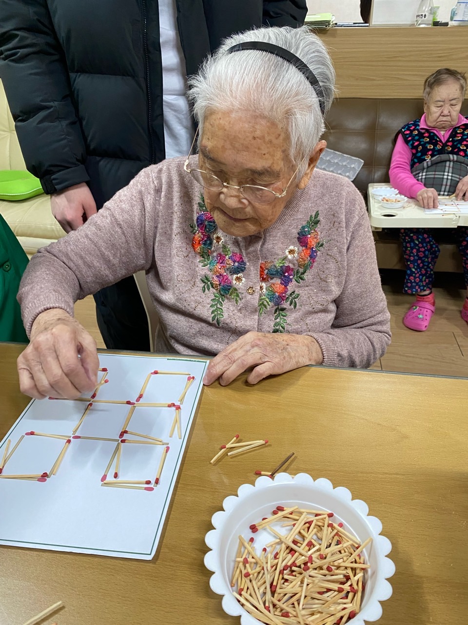 성냥으로 다양한 구성물을 완성해보도록 하여 대상자의 성취감을 충족시키고 손의 근육조직을 발달시킨다.