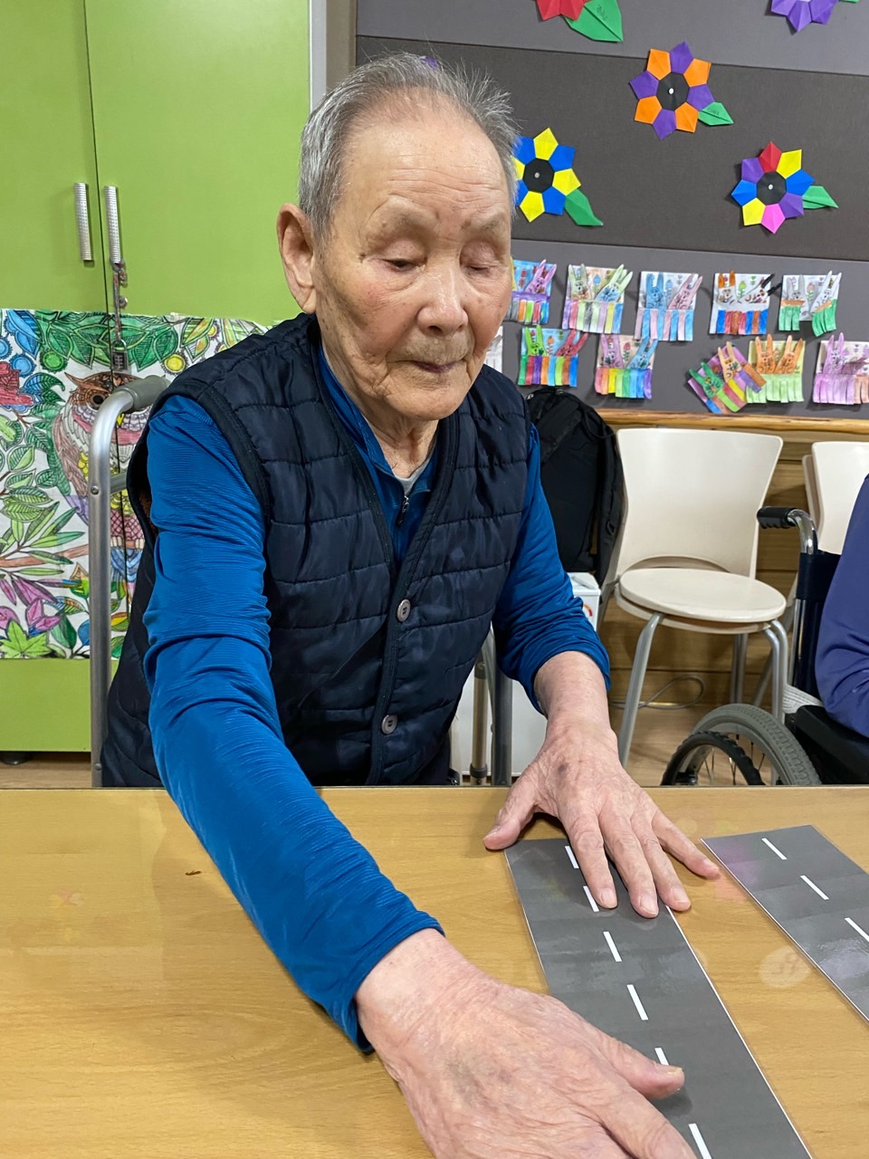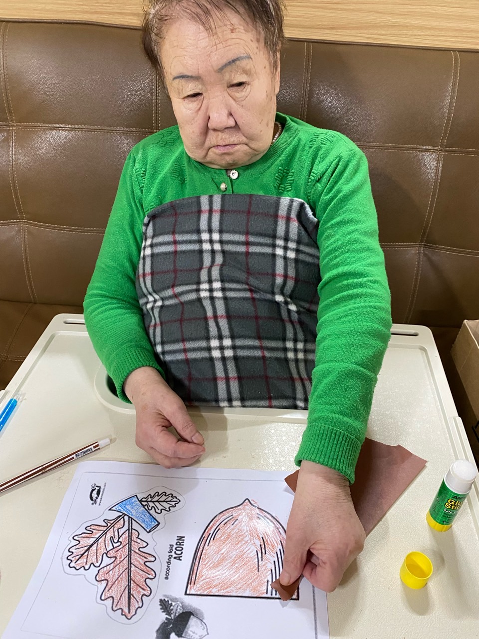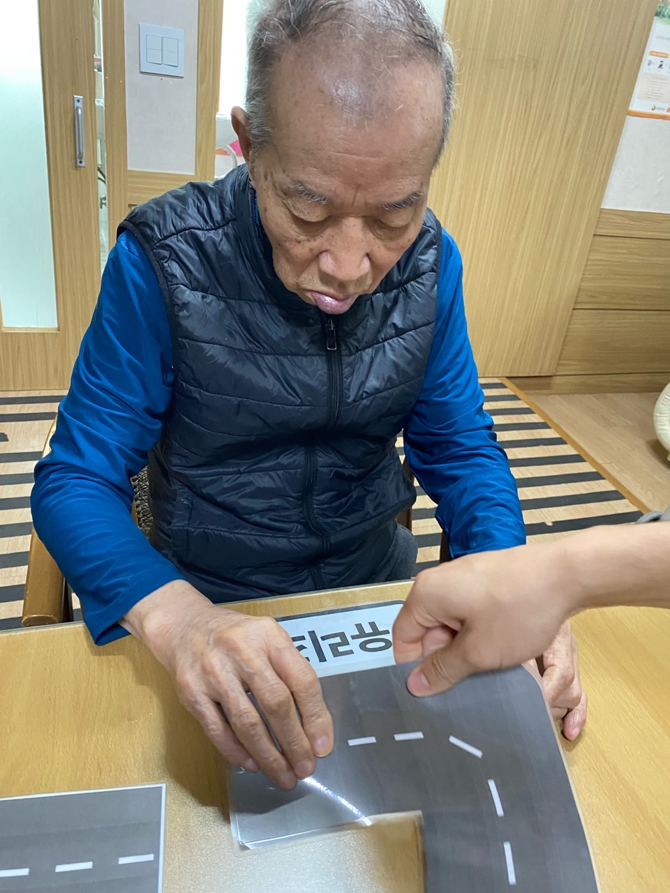 2. 준비된 그림도안과 색연필을 어르신께서 만져보게 한다.