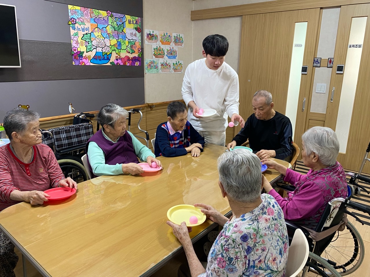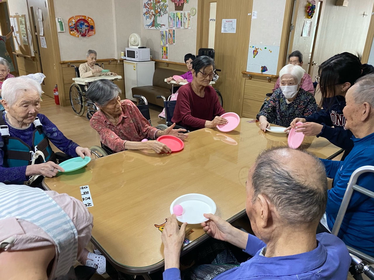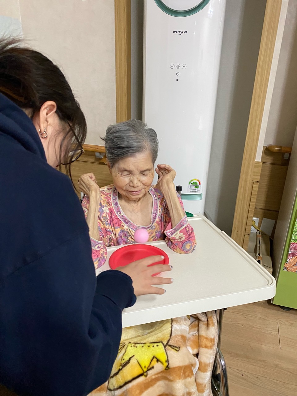어르신들이 이제 탁구공 놀이를 제법 잘 하십니다.