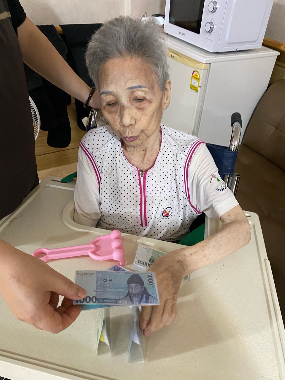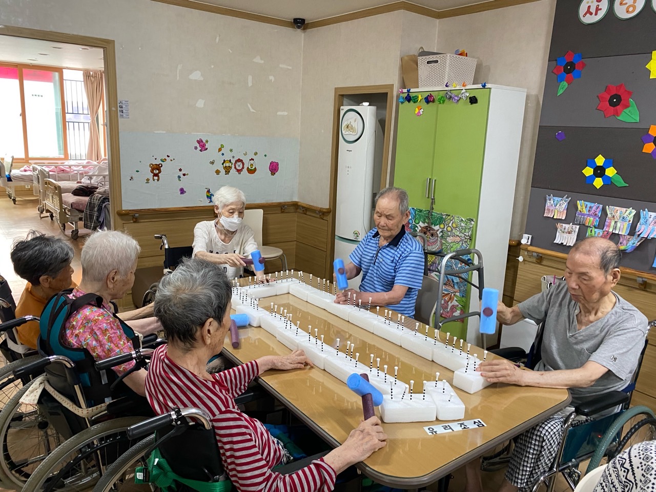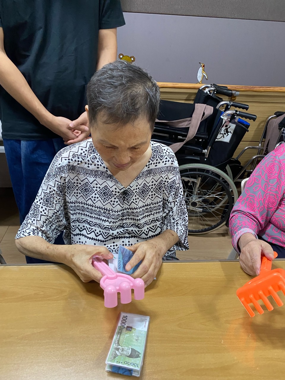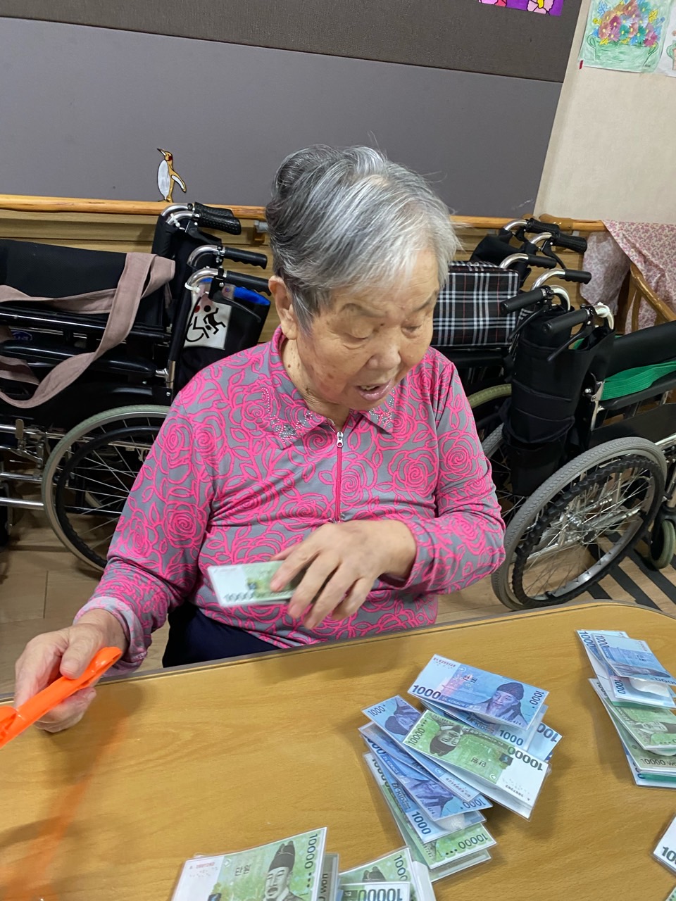 공 또는 고리를 굴려 돈을 잡아 부자가 되는 활동을 통해 집중력과 관절건강에 도움을 주는 운동을 하시며 갈퀴로 돈 쓸어담기 아주 좋아하시고 돈으로 탑 쌓기도 집중력 있게 잘하심 도미노로 멋지게 완성하셔 쓰러지는 멋진모습 연출하셨습니다.