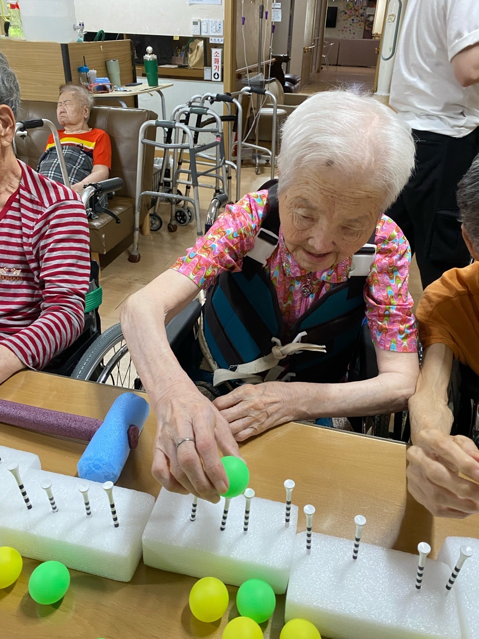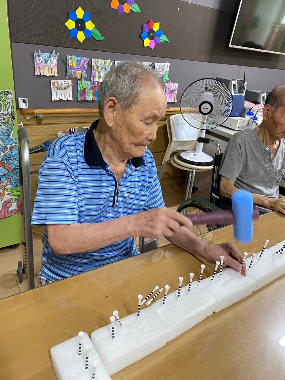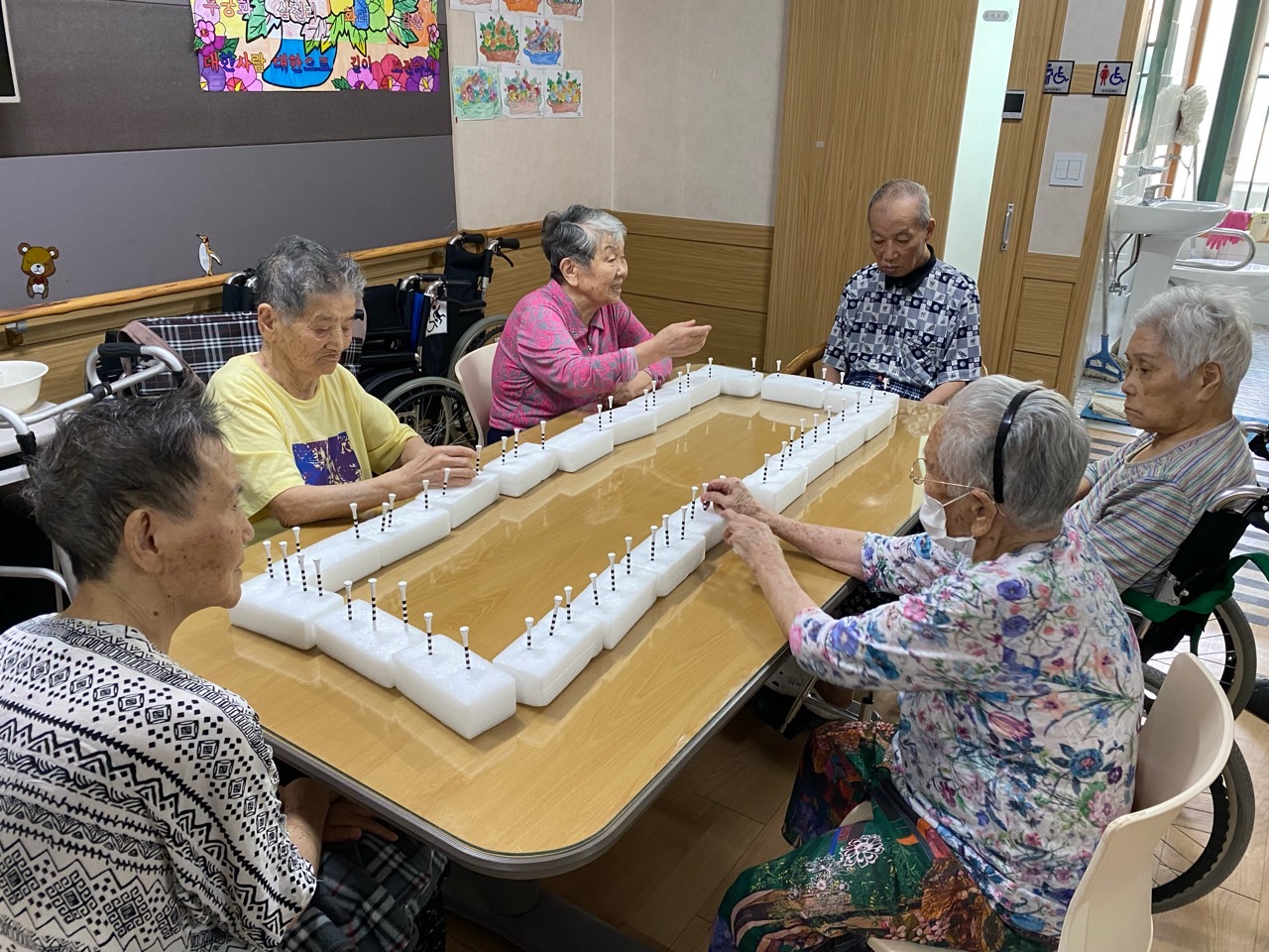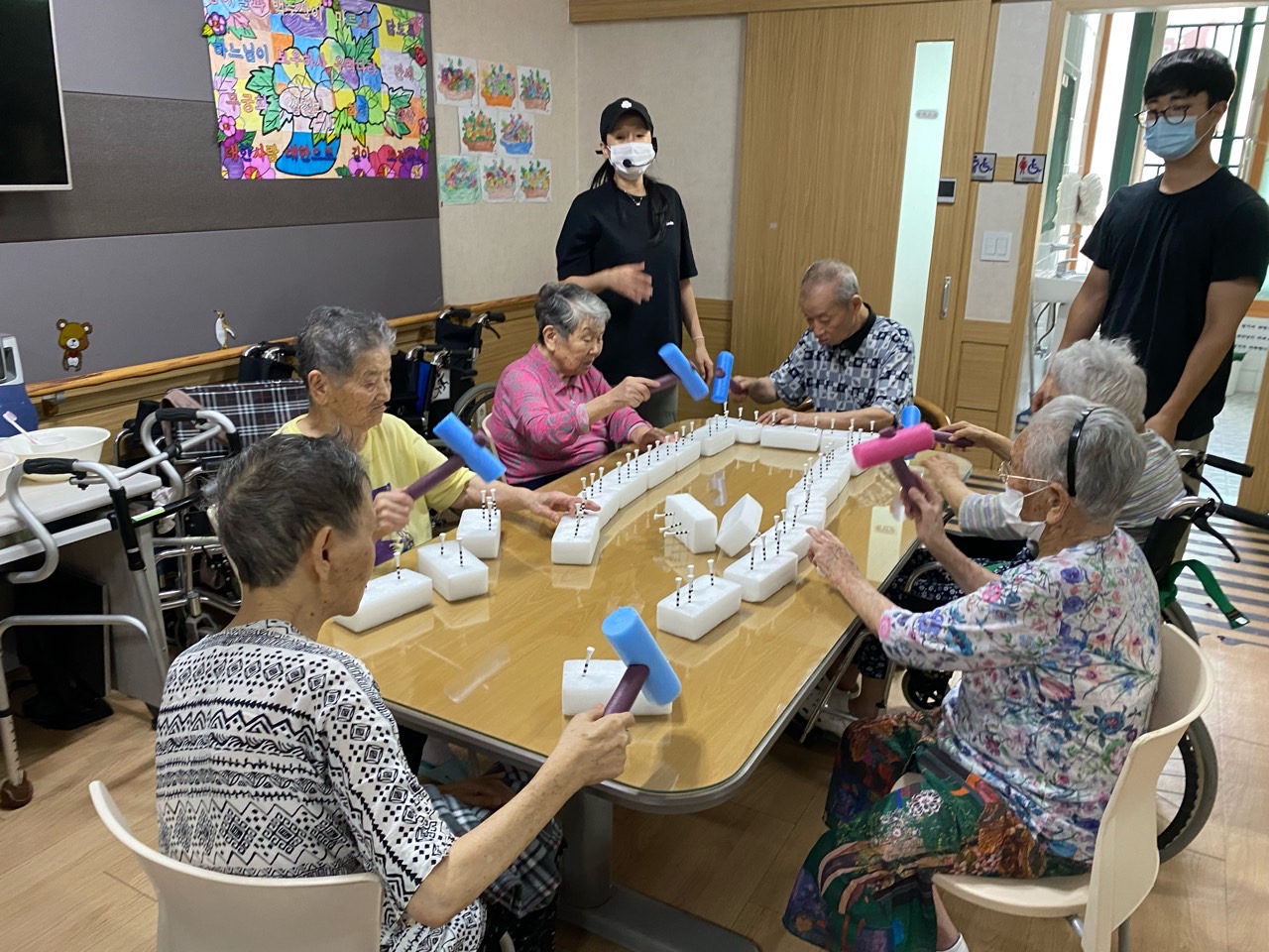 공 또는 고리를 굴려 돈을 잡아 부자가 되는 활동을 통해 집중력과 관절건강에 도움을 주는 운동을 하시며 갈퀴로 돈 쓸어담기 아주 좋아하시고 돈으로 탑 쌓기도 집중력 있게 잘하심 도미노로 멋지게 완성하셔 쓰러지는 멋진모습 연출하셨습니다.