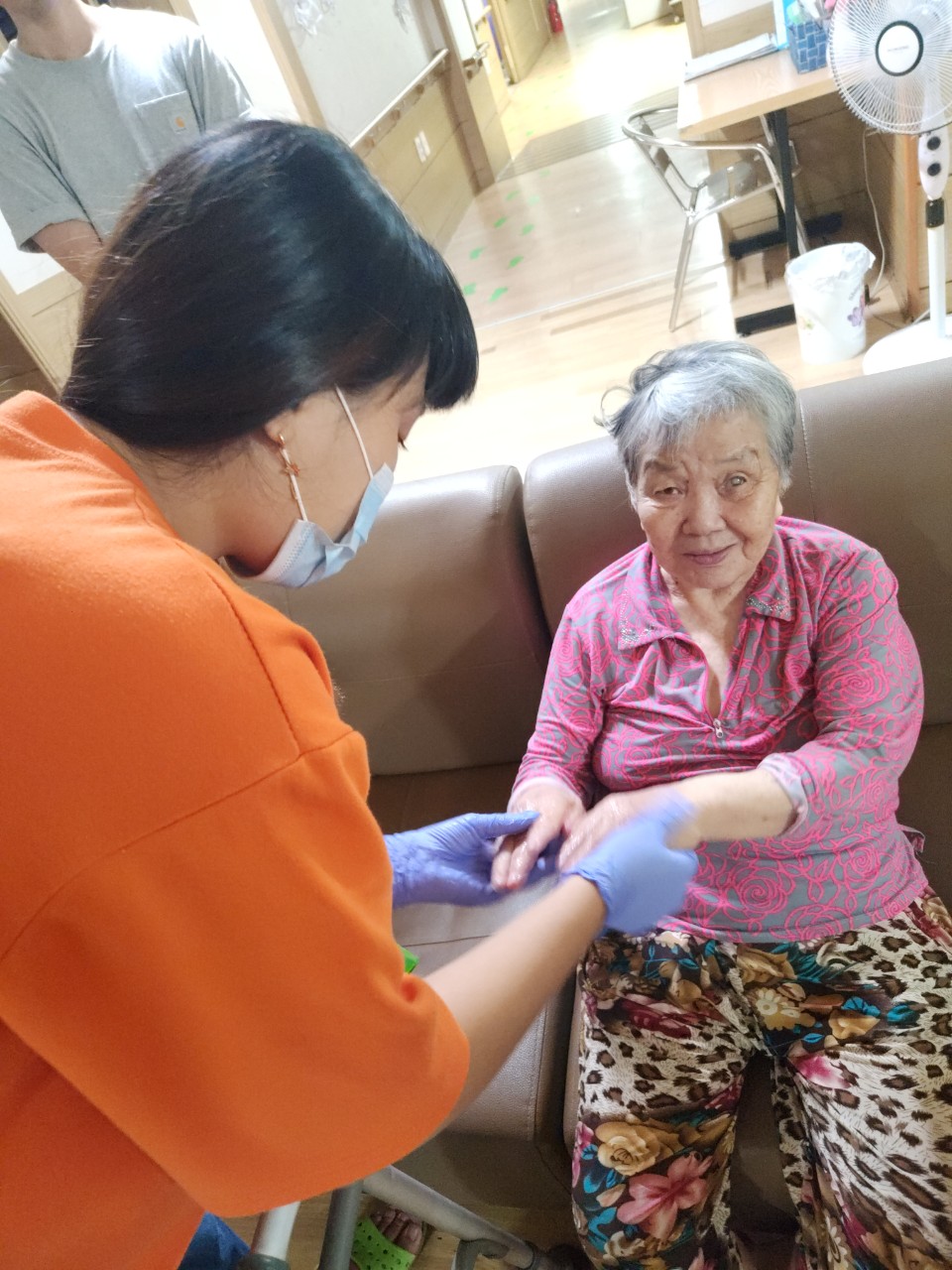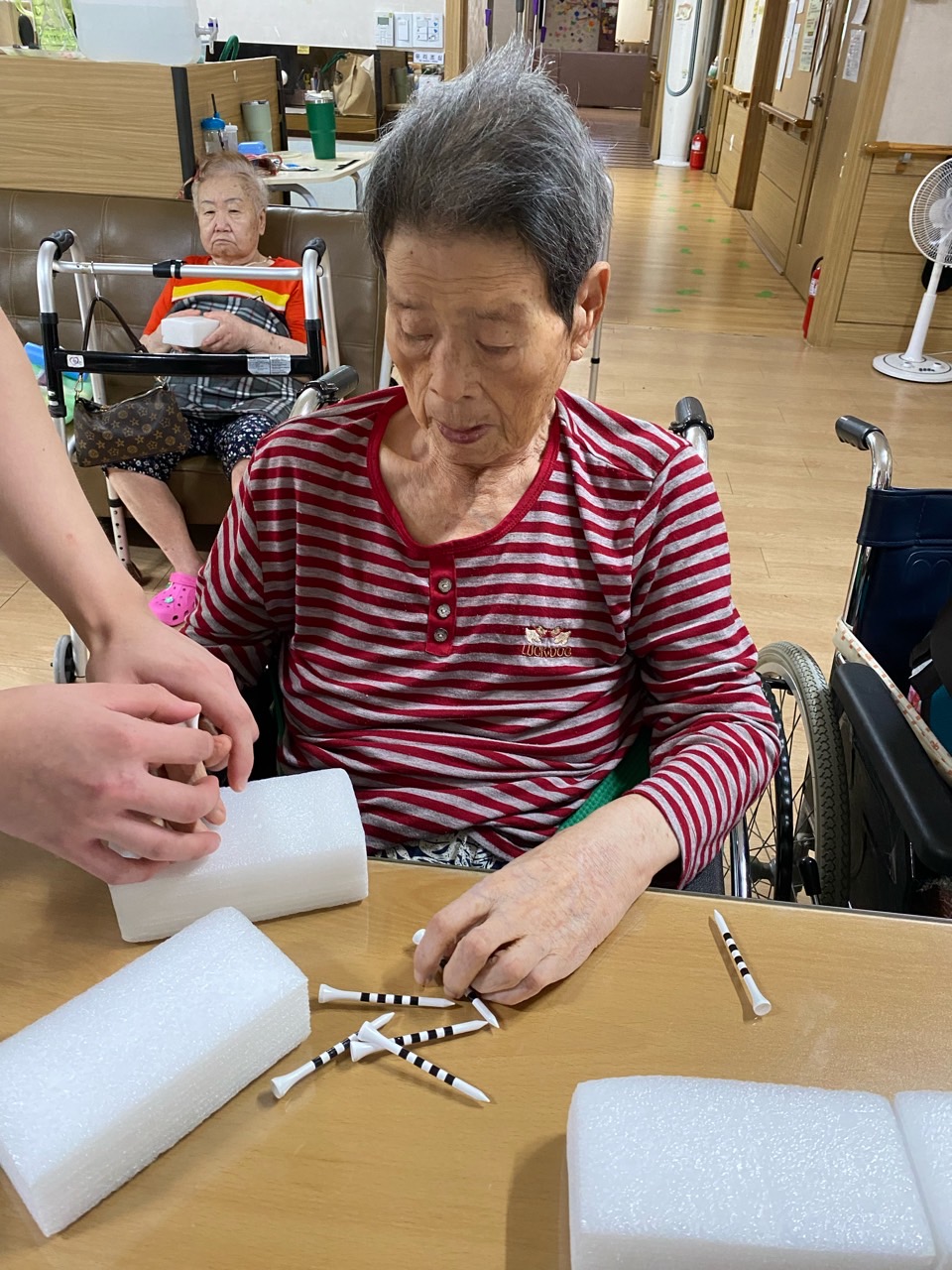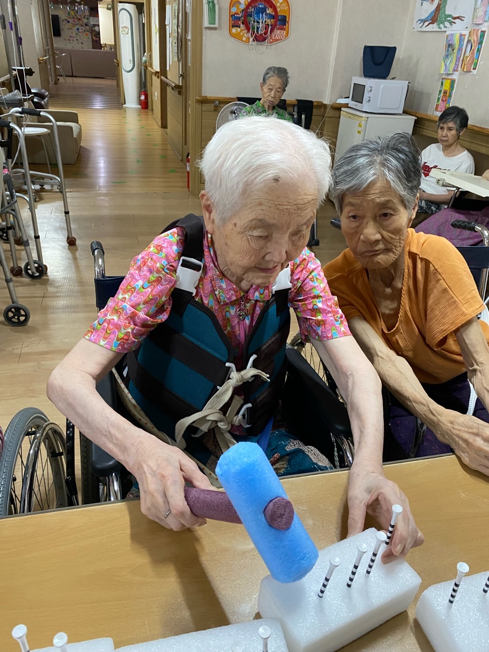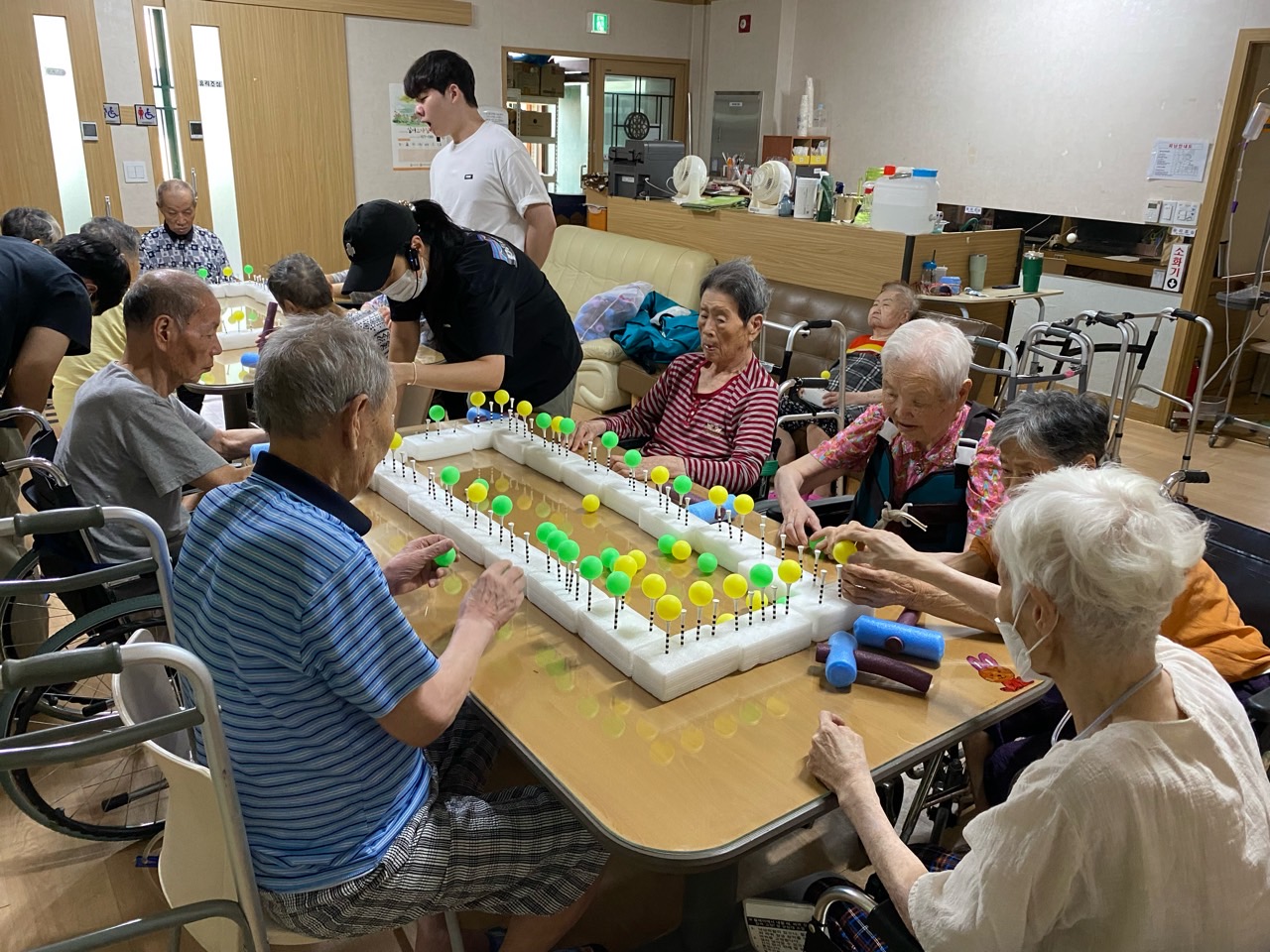 공 또는 고리를 굴려 돈을 잡아 부자가 되는 활동을 통해 집중력과 관절건강에 도움을 주는 운동을 하시며 갈퀴로 돈 쓸어담기 아주 좋아하시고 돈으로 탑 쌓기도 집중력 있게 잘하심 도미노로 멋지게 완성하셔 쓰러지는 멋진모습 연출하셨습니다.