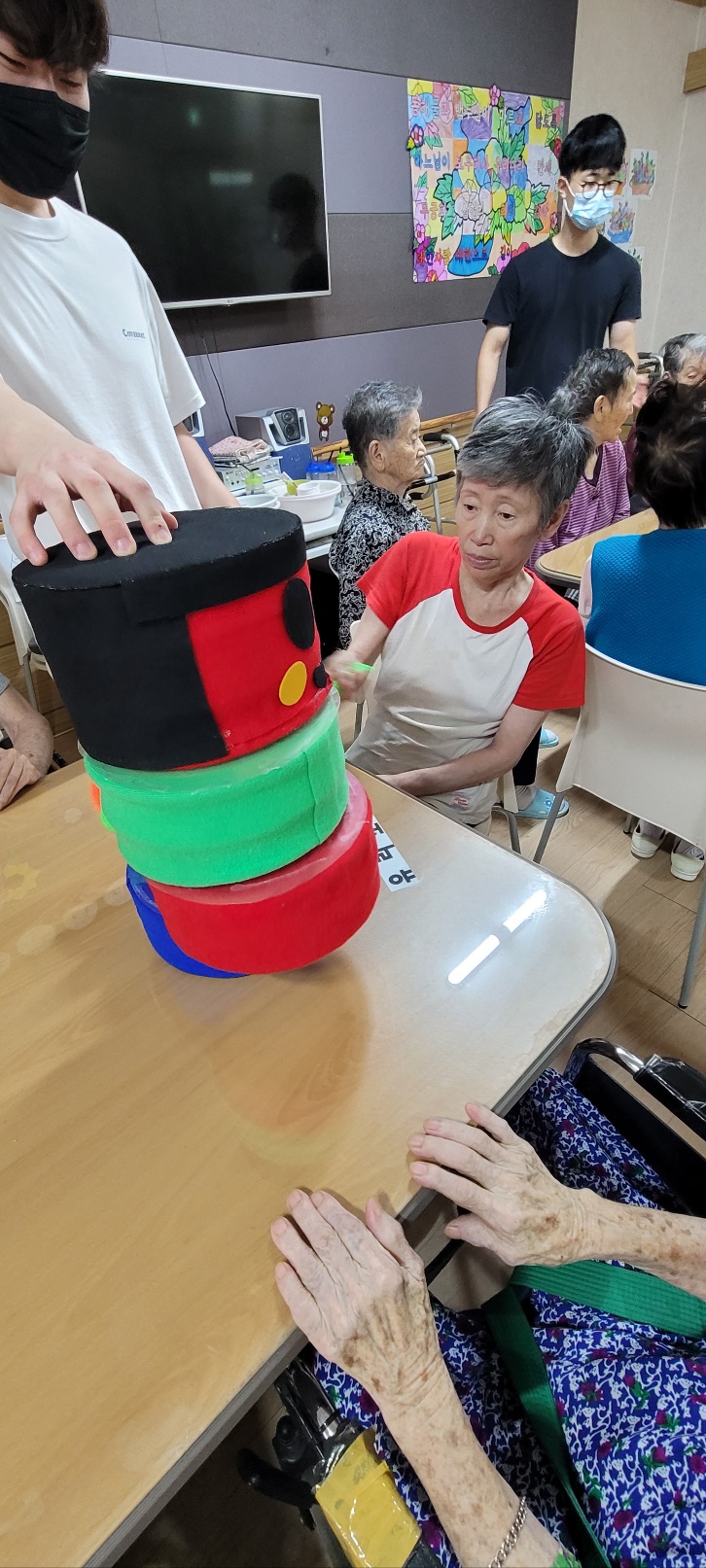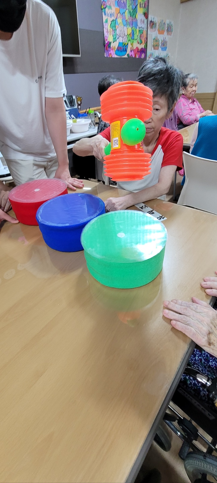 스펀지로 맞은 편 어르신들과 굴려보시며 협동심을 기르시고 다루마오토시를 뿅망치로 맞추어 쓰러뜨려 보셨습니다.^^