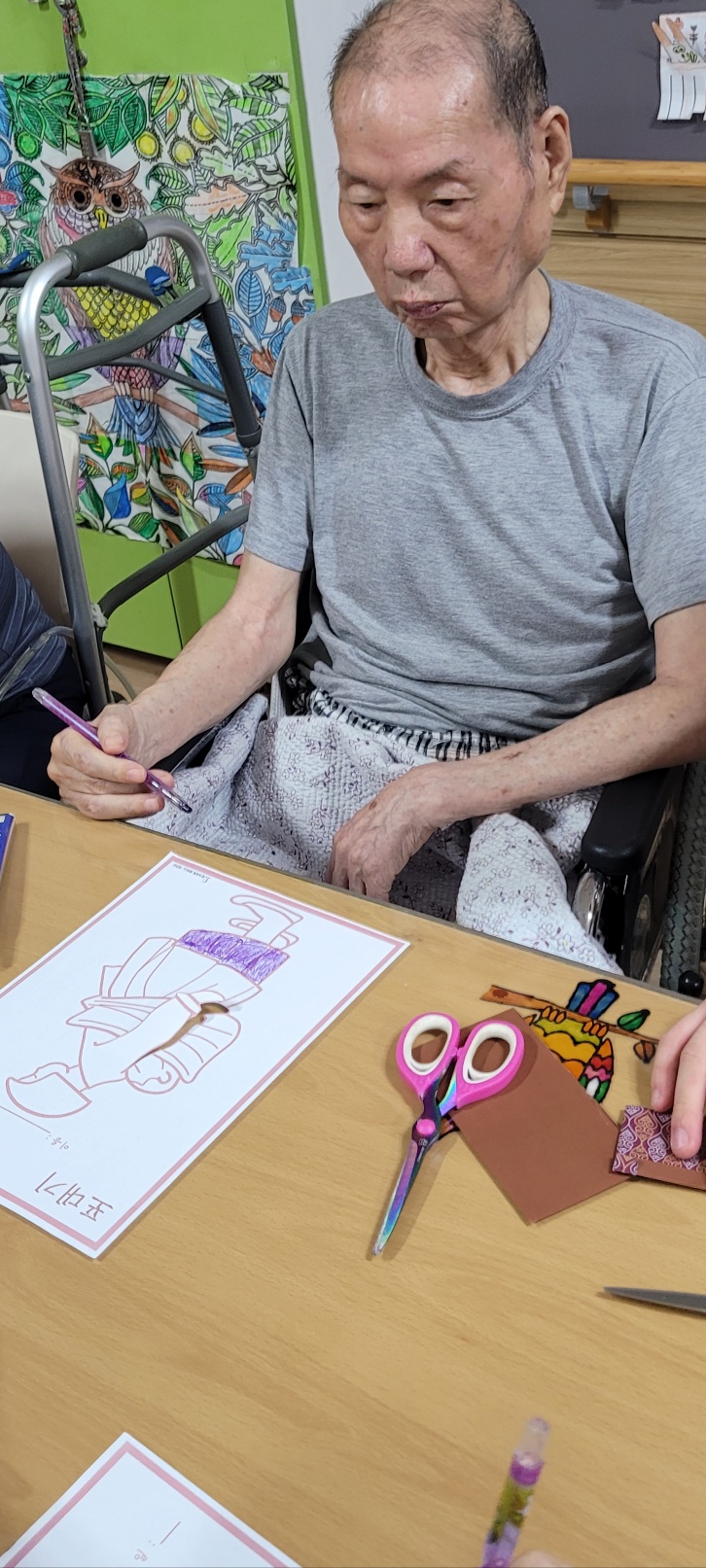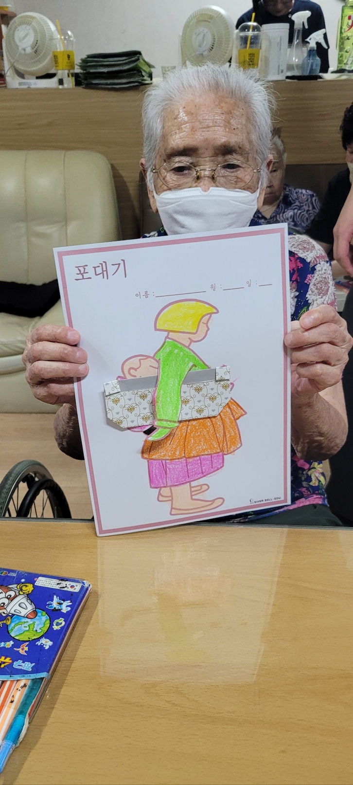옛날을 회상하며 포대기로 아이를 키웠던 이야기를 나누고 색칠하고 오려붙이면서 구성력이 좋아집니다 ^^