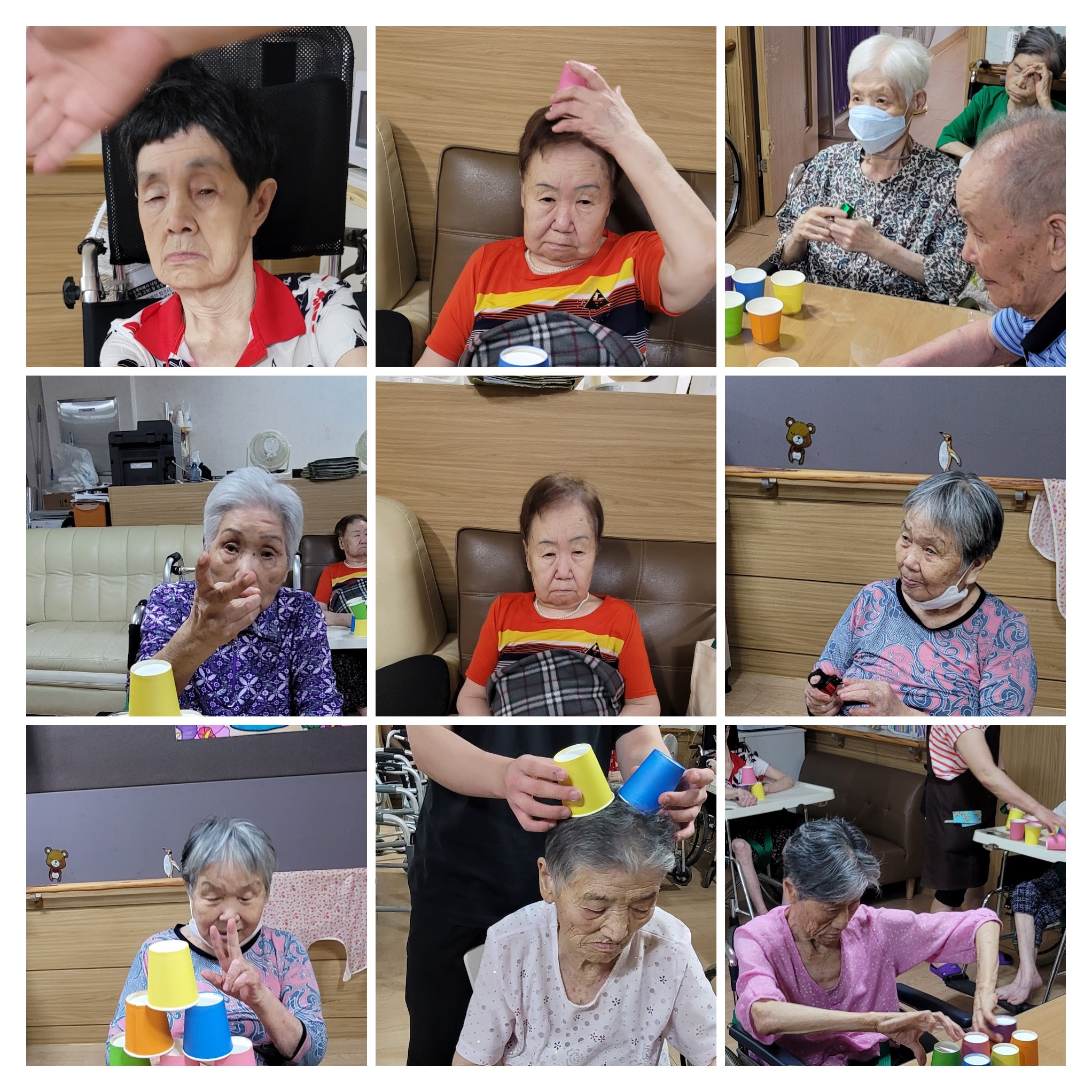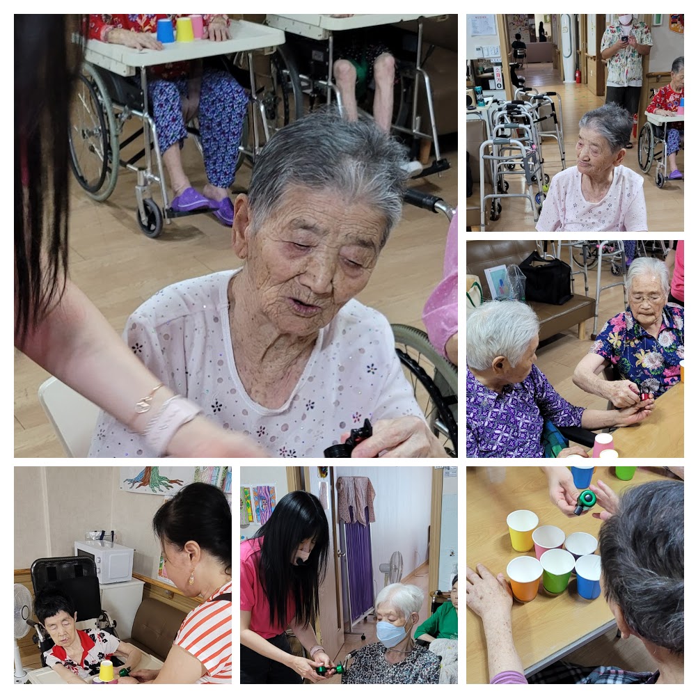 자전거 벨소리를 신기해하셨으며 컵 쌓기를 하시며 운동하고 그림에 맞게 쌓기 보다는 스피디하게 컵 돌리기를 더 좋아하셨습니다. ^^