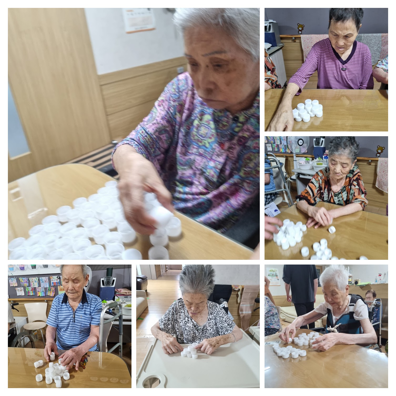 어르신들께서 지관으로 마사지를 시원하게 하시고, 롤링하며 요리 흉내도 내시고 병뚜껑을 밀고 쌓으시면서 즐겁게 수업하셨습니다. ^^