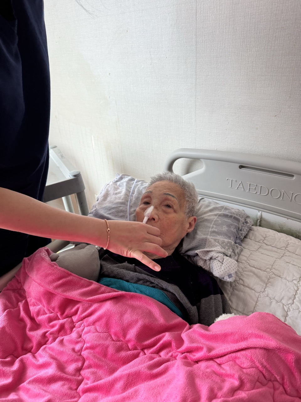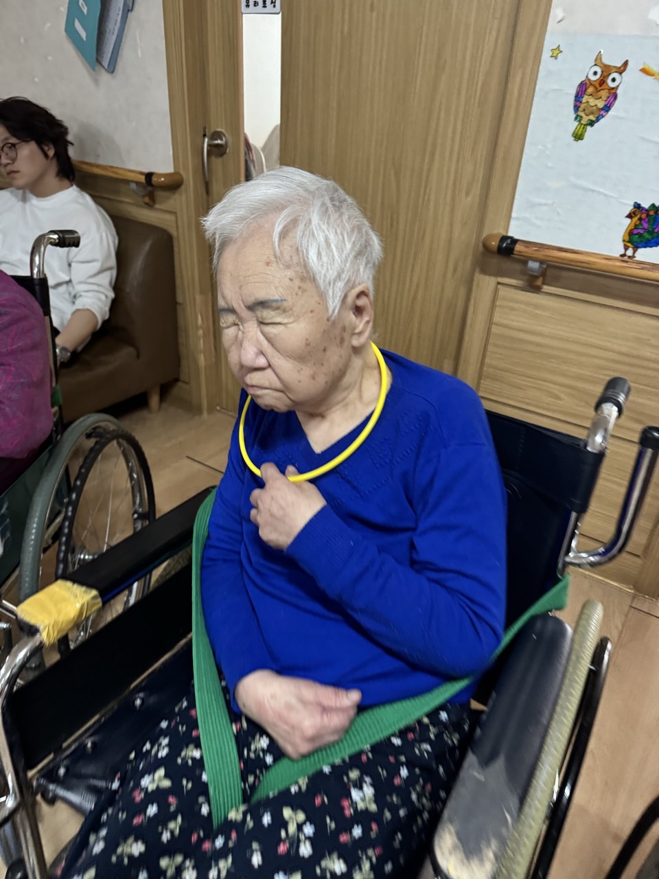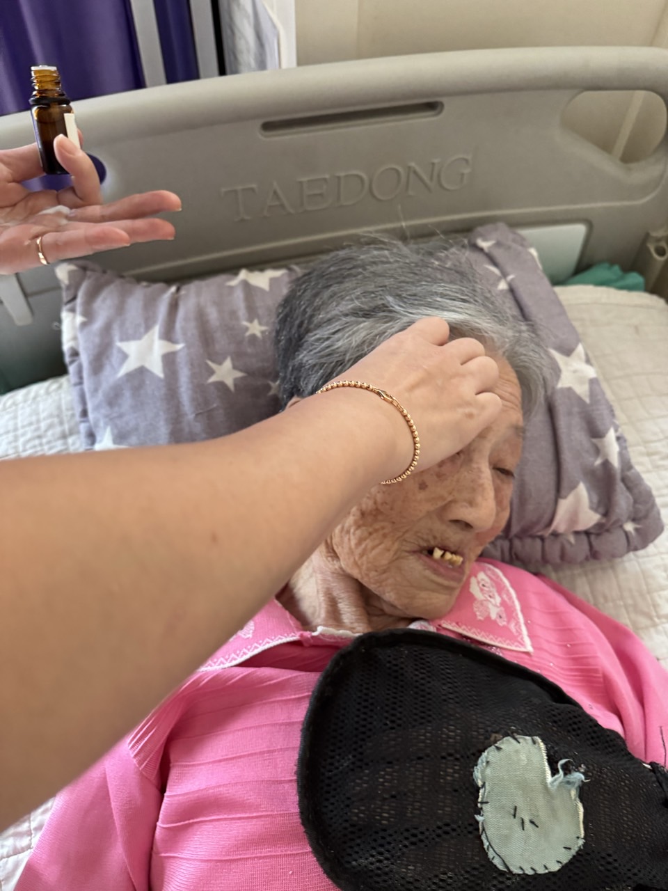 ② 진행 : 코에 오일 냄새를 맡게 하고, 관자놀이에 롤링기법으로 마사지를 해준다.