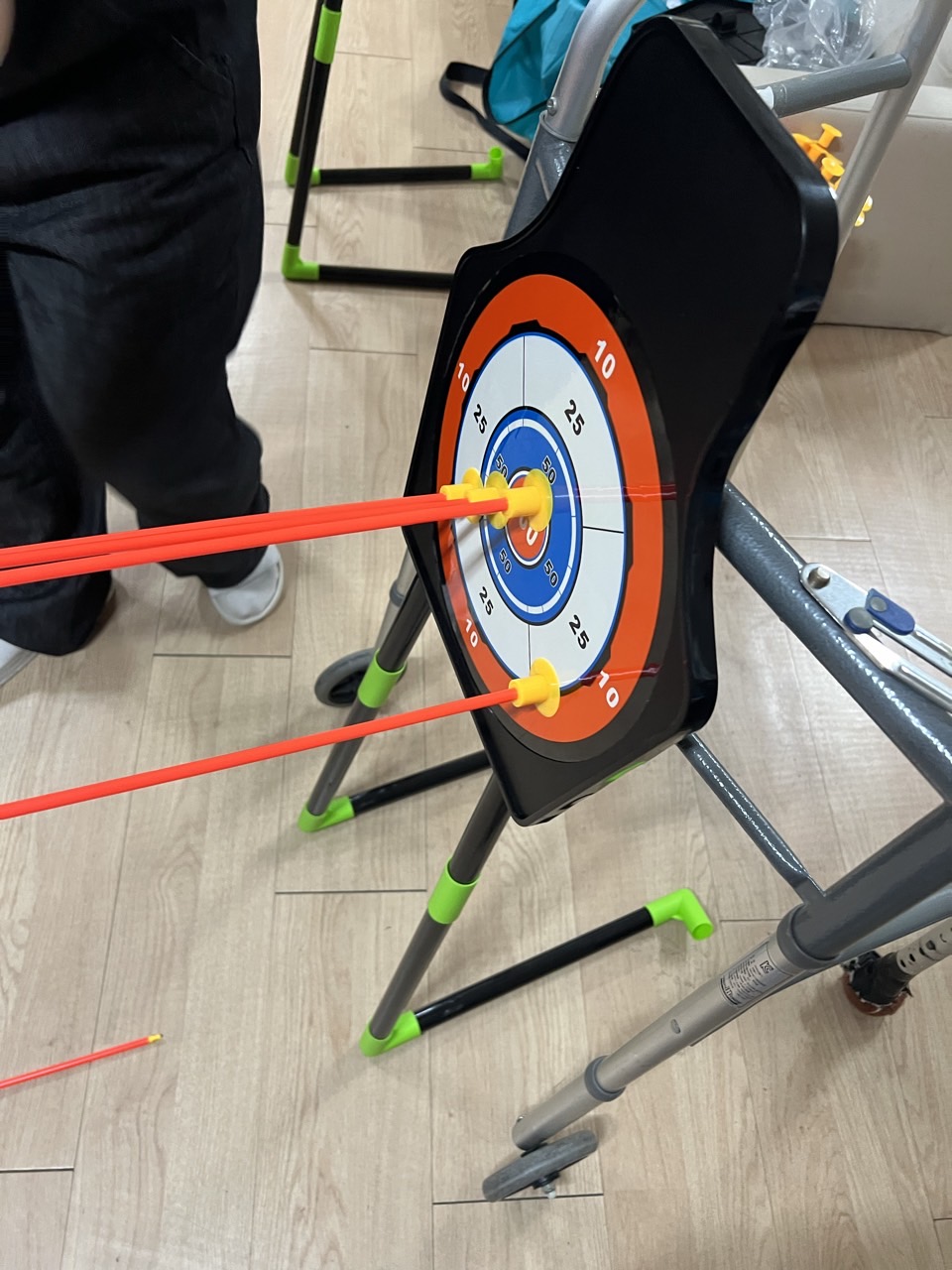 활과 화살을 이용하여 일정한 거리에 떨어져 있는 과녁을 향해 쏘아 득점을 겨루는 활동놀이를 하시며 신체조절능력 및 유연성을 향상시킨다.