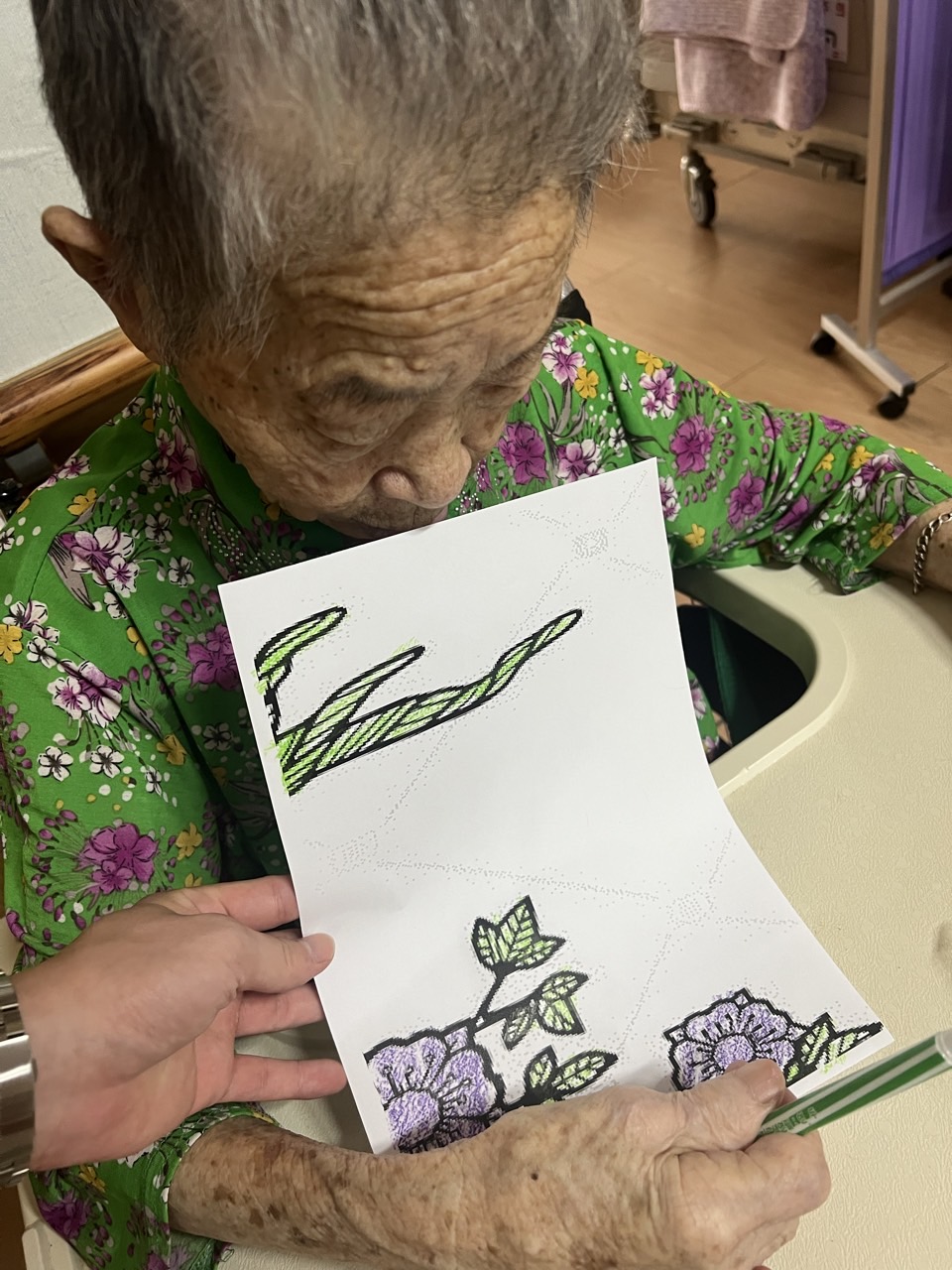 2. 준비된 그림도안과 색연필을 어르신께서 만져보게 한다.