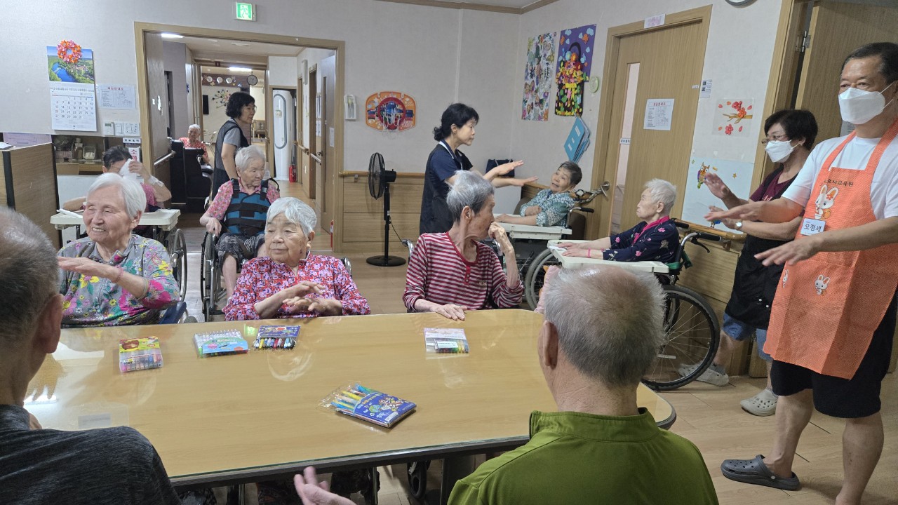 2. 준비된 그림도안과 색연필을 어르신께서 만져보게 한다.