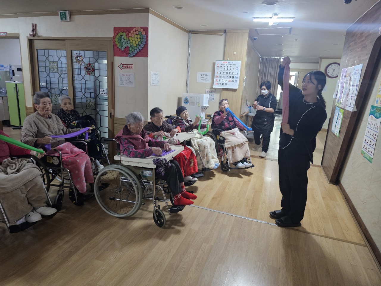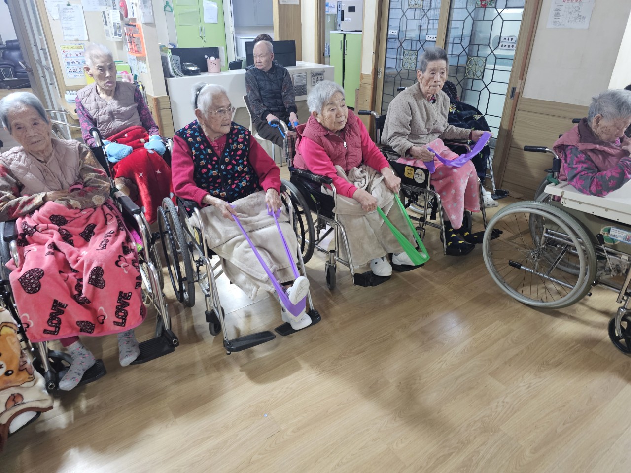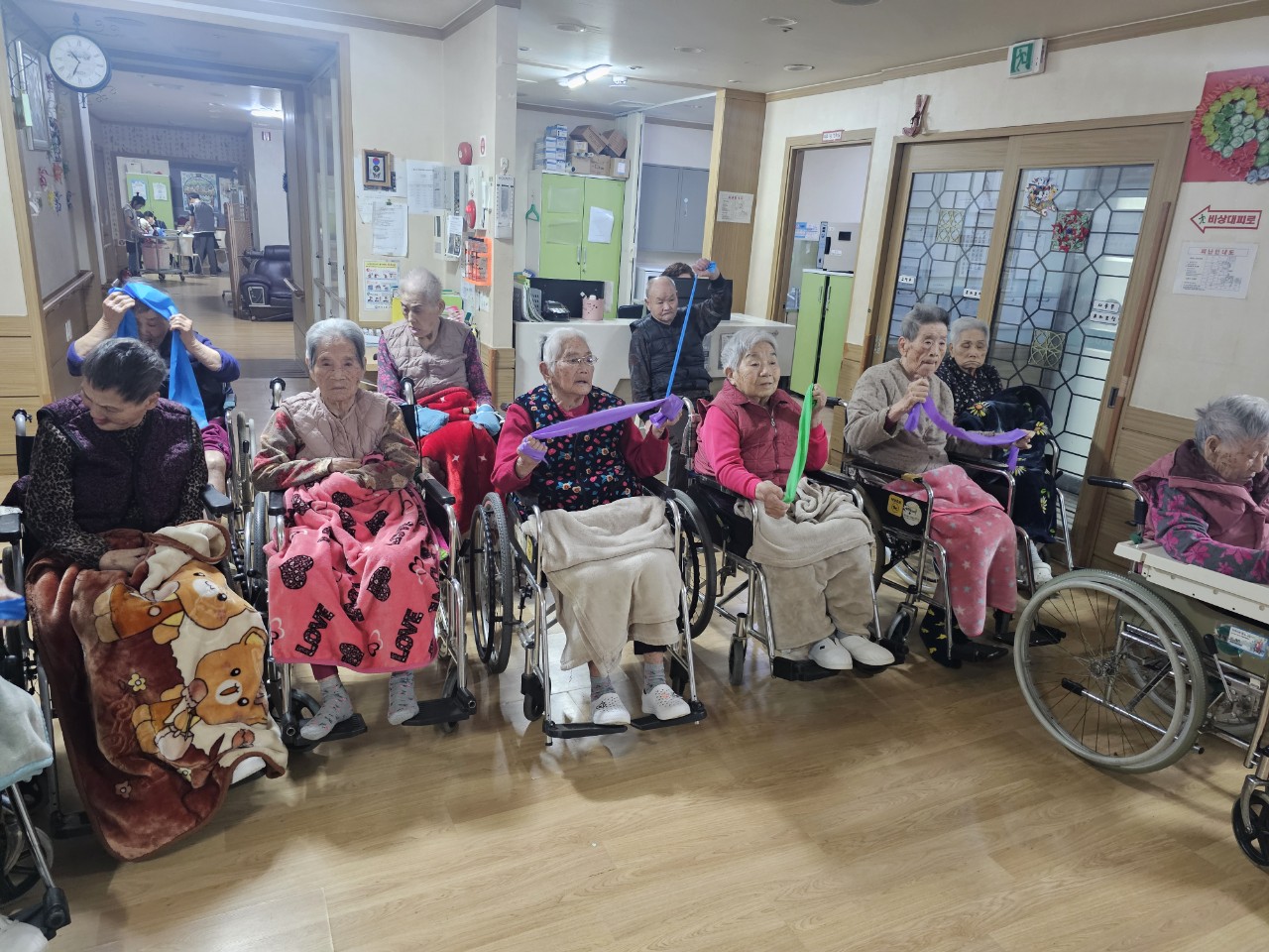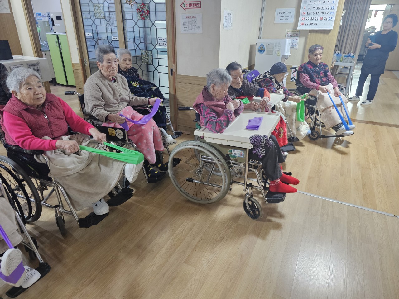 ② 어르신들에게 탄성밴드를 배분해 드린다.