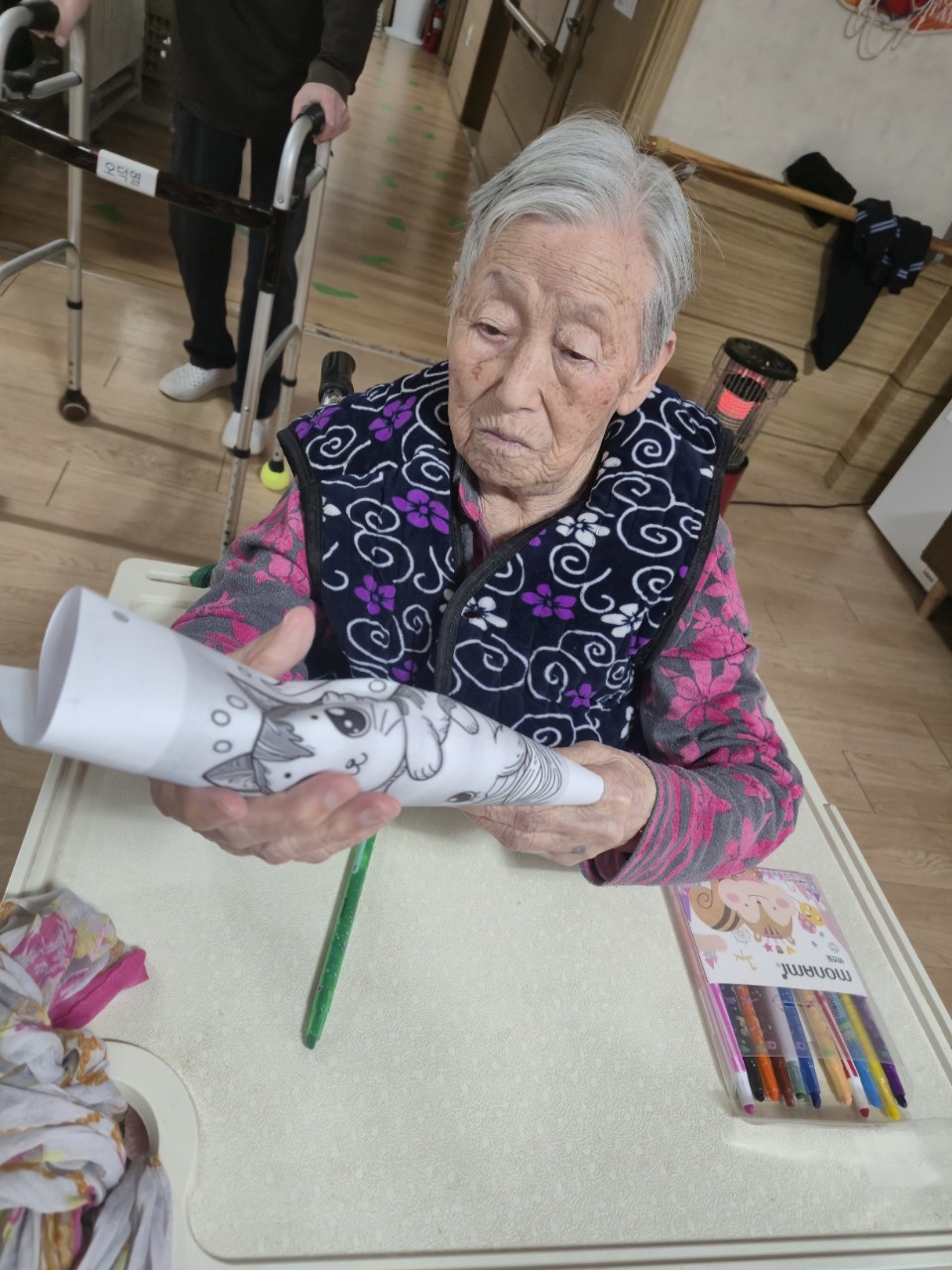 2. 준비된 그림도안과 색연필을 어르신께서 만져보게 한다.