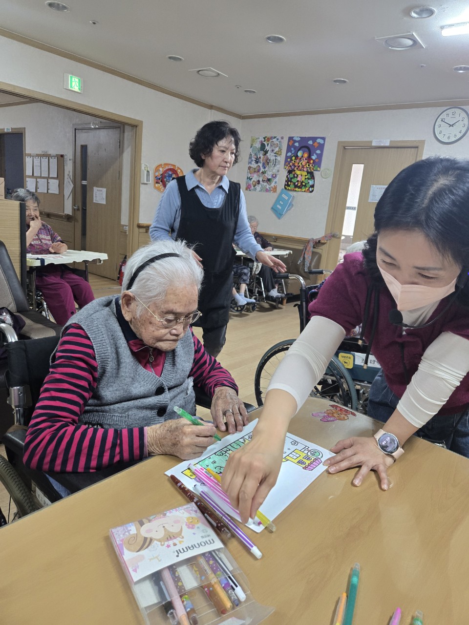 2. 준비된 그림도안과 색연필을 어르신께서 만져보게 한다.