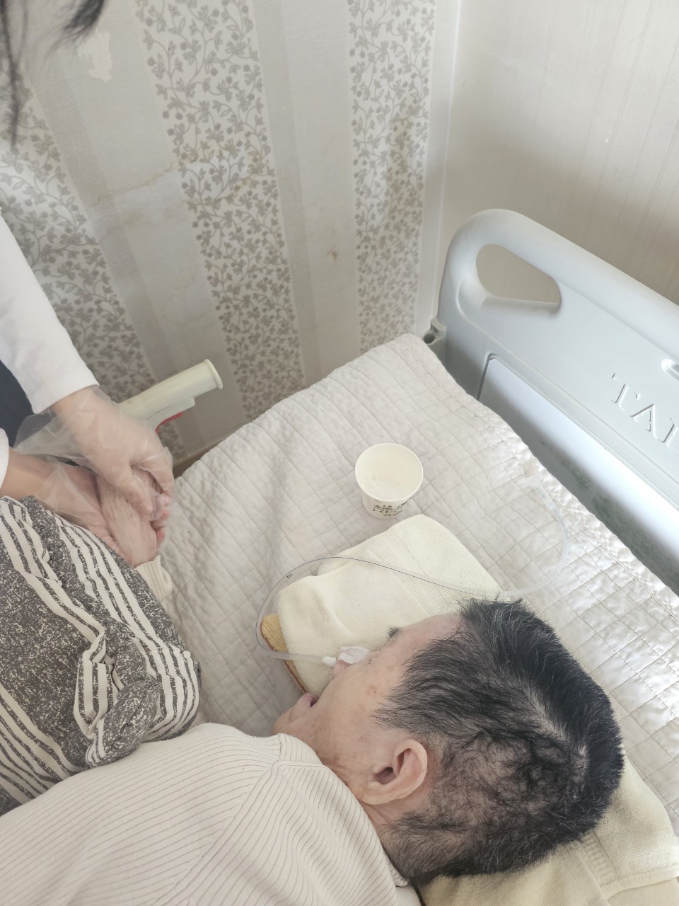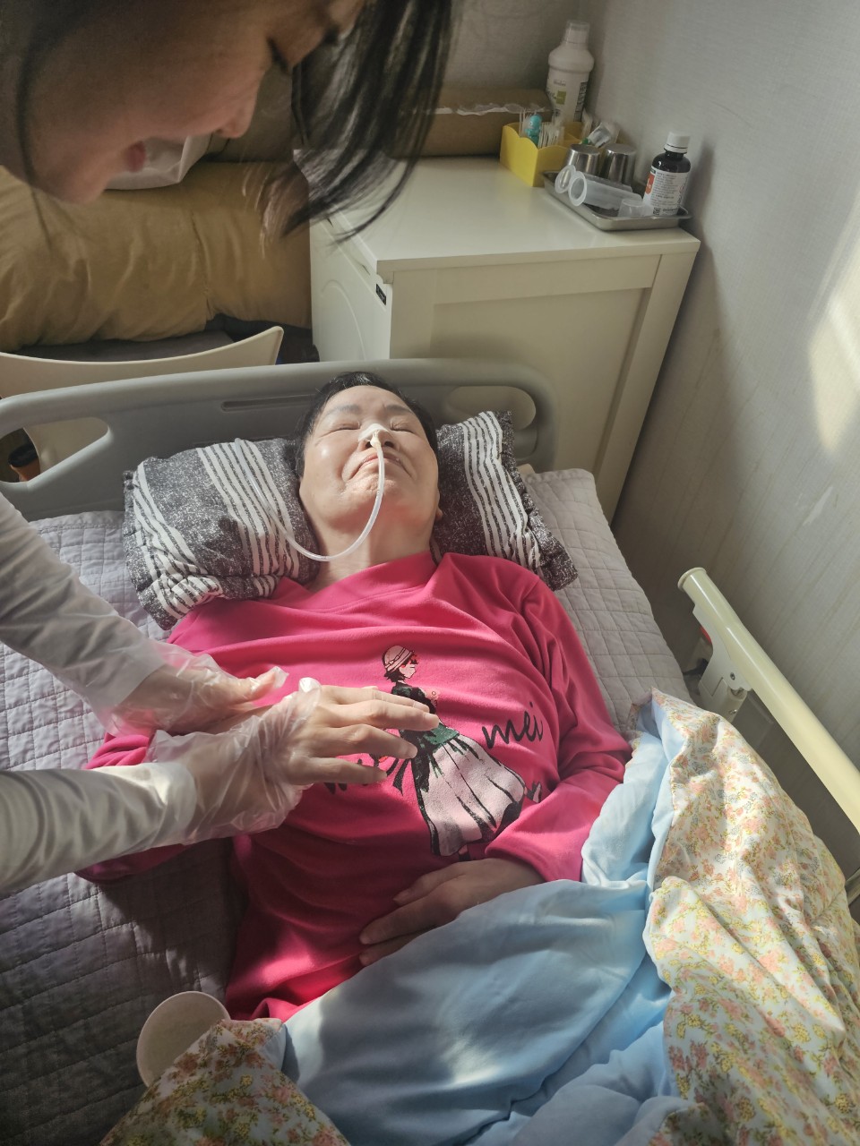 ② 진행 : 코에 오일 냄새를 맡게 하고, 관자놀이에 롤링기법으로 마사지를 해준다.