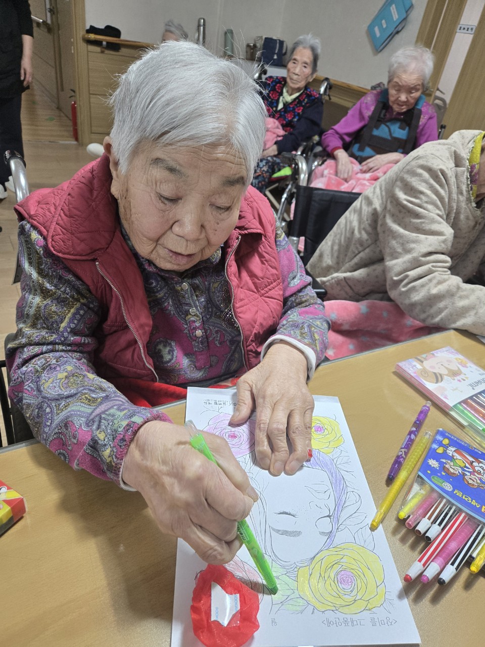 마이크커버를 이용해 도안에 간단히 장미꽃을 꾸며보며 참여 의욕과 즐거움을 경험한다.
