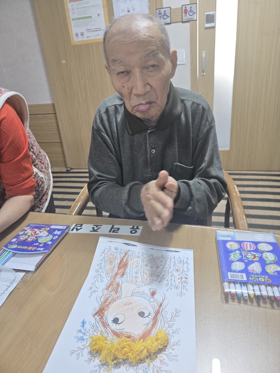 2. 준비된 그림도안과 색연필을 어르신께서 만져보게 한다.