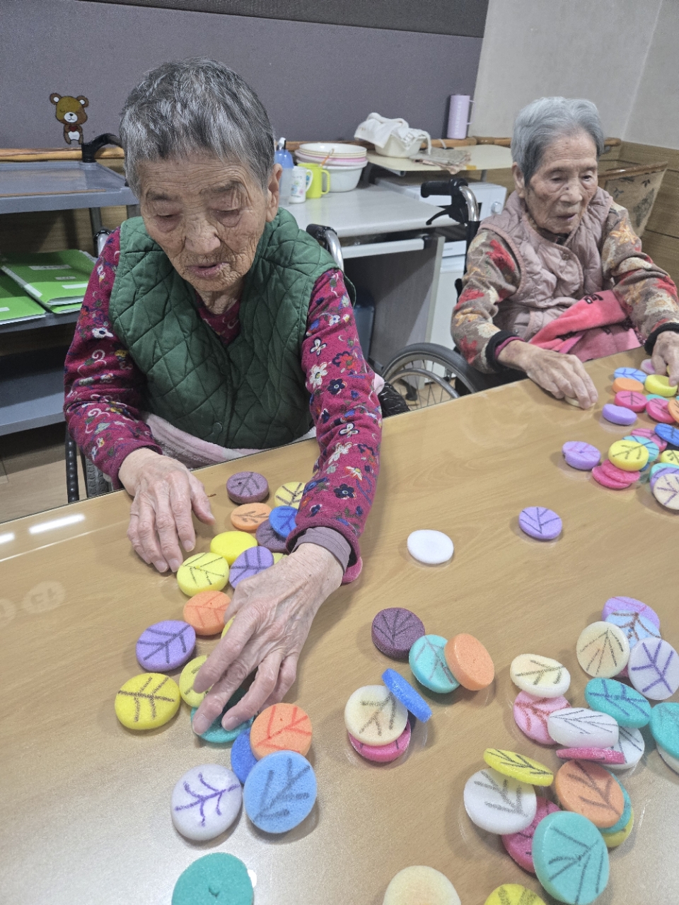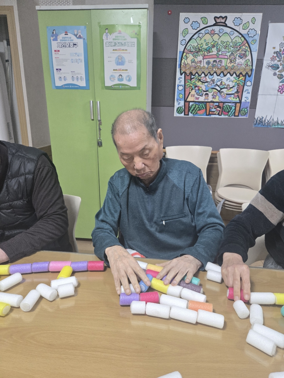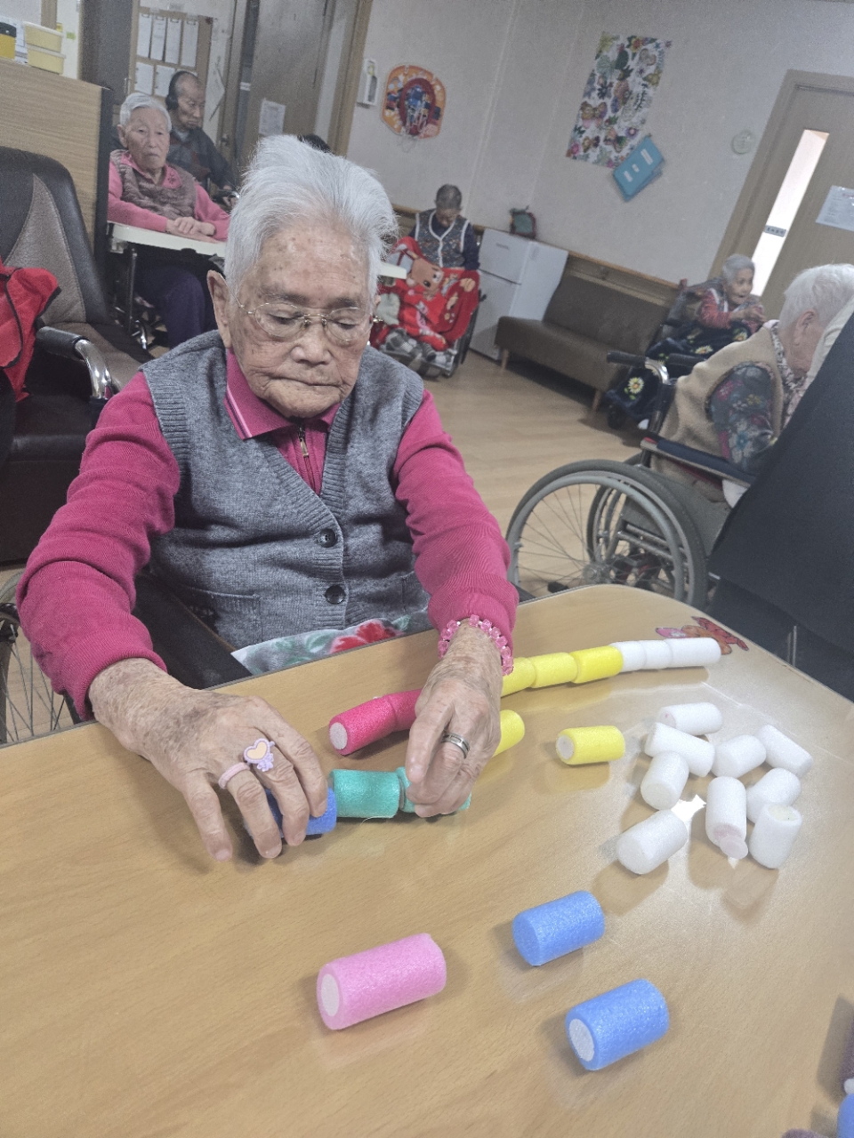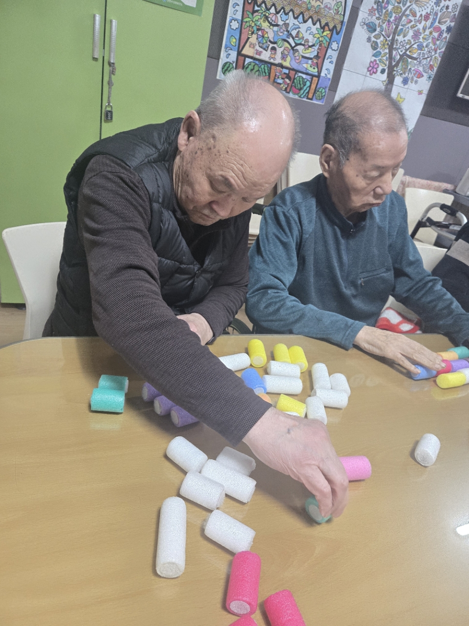 오늘 프로그램은 모형과 여러가지 색깔을 분류하여 창의적 모형을 만들어 보는 창의력 인지 프로그램 시간입니다.