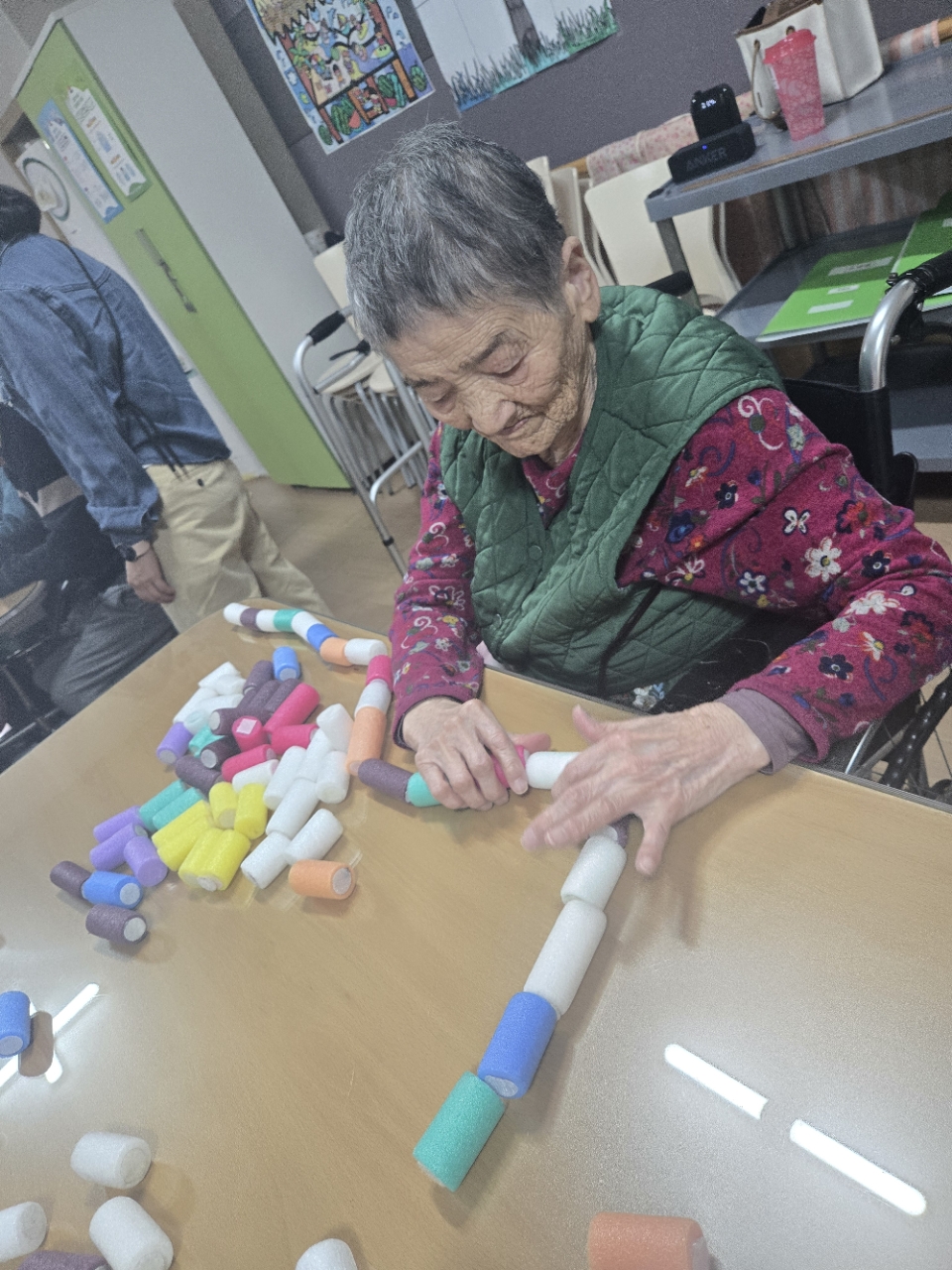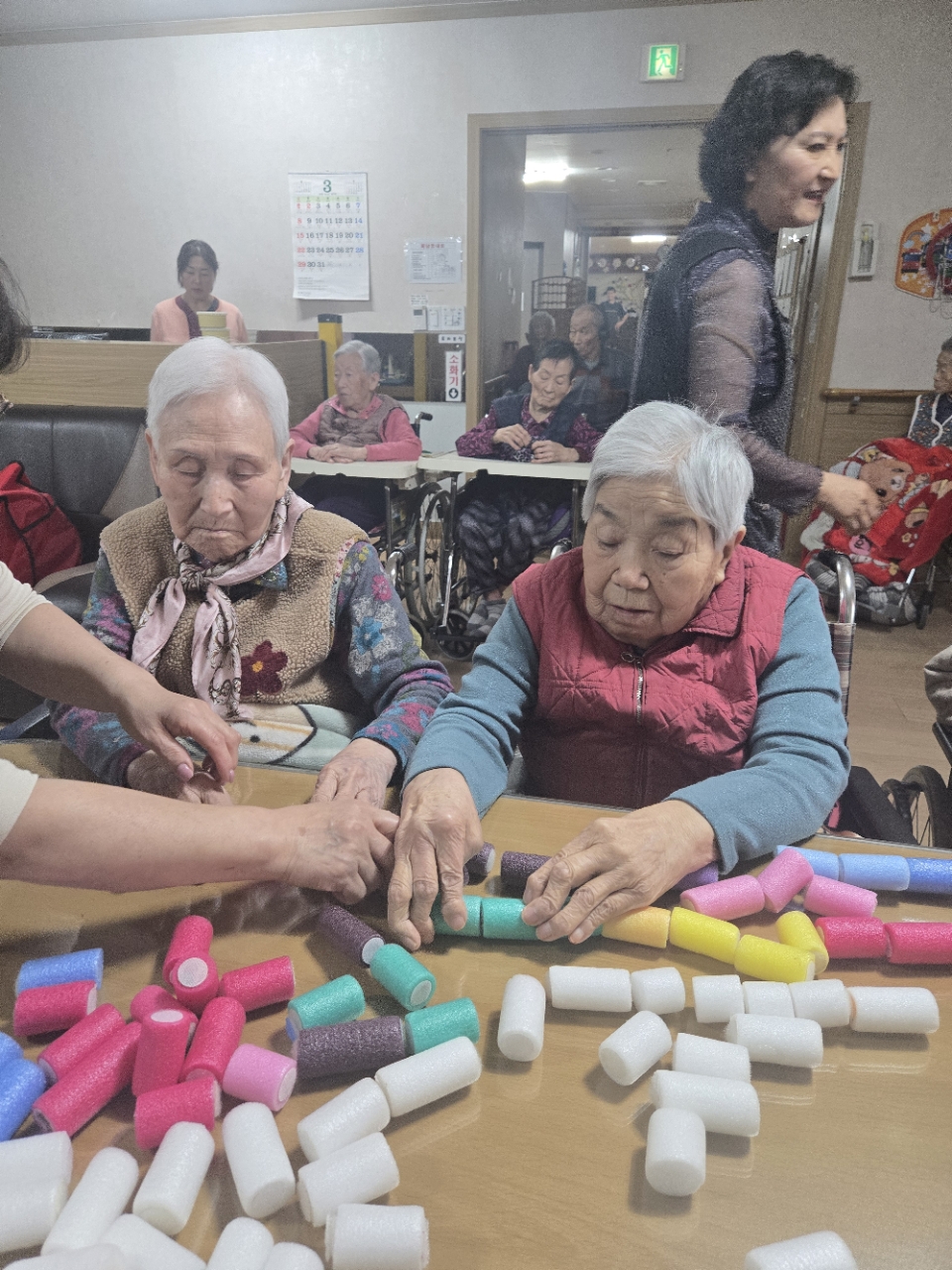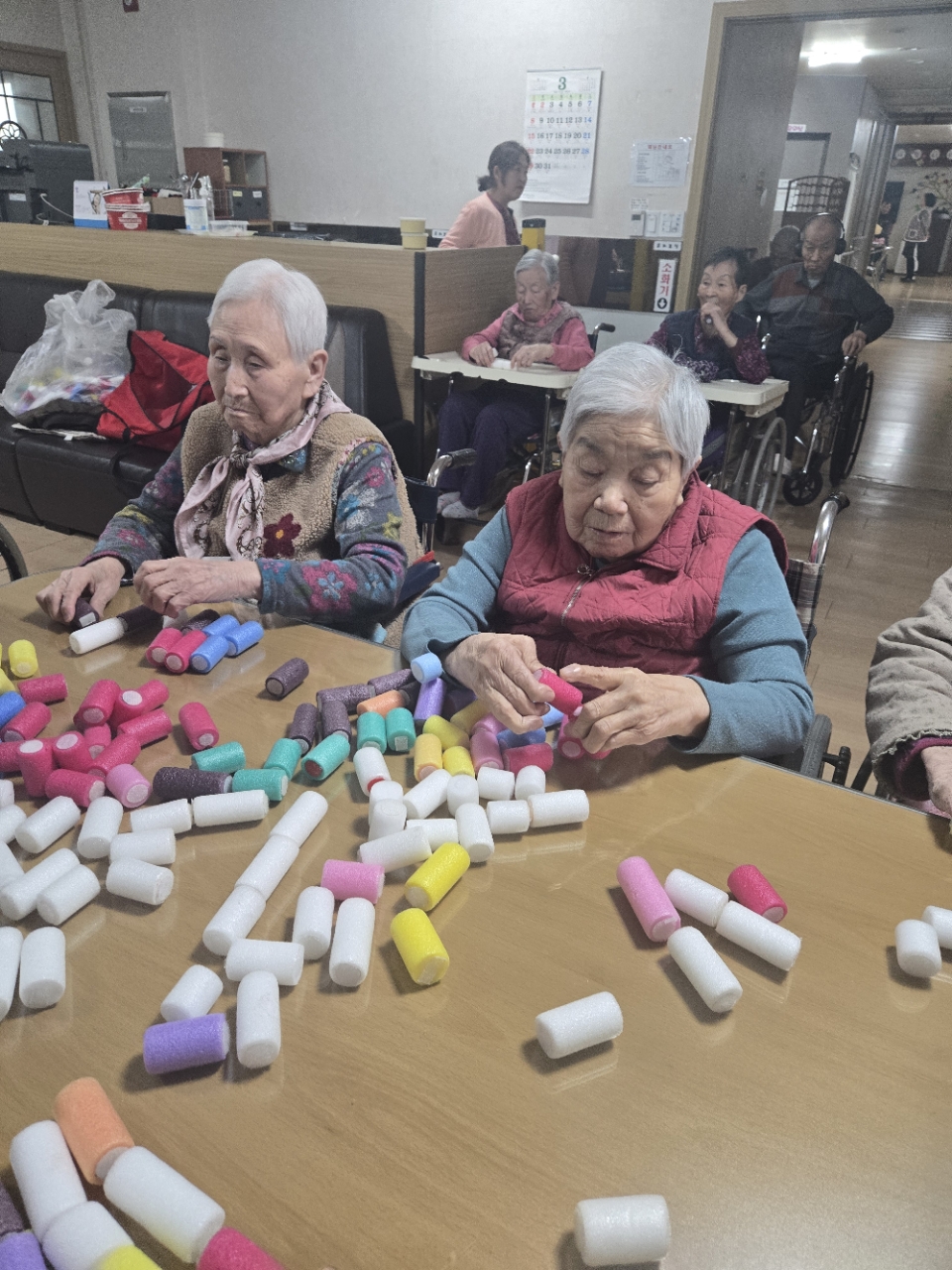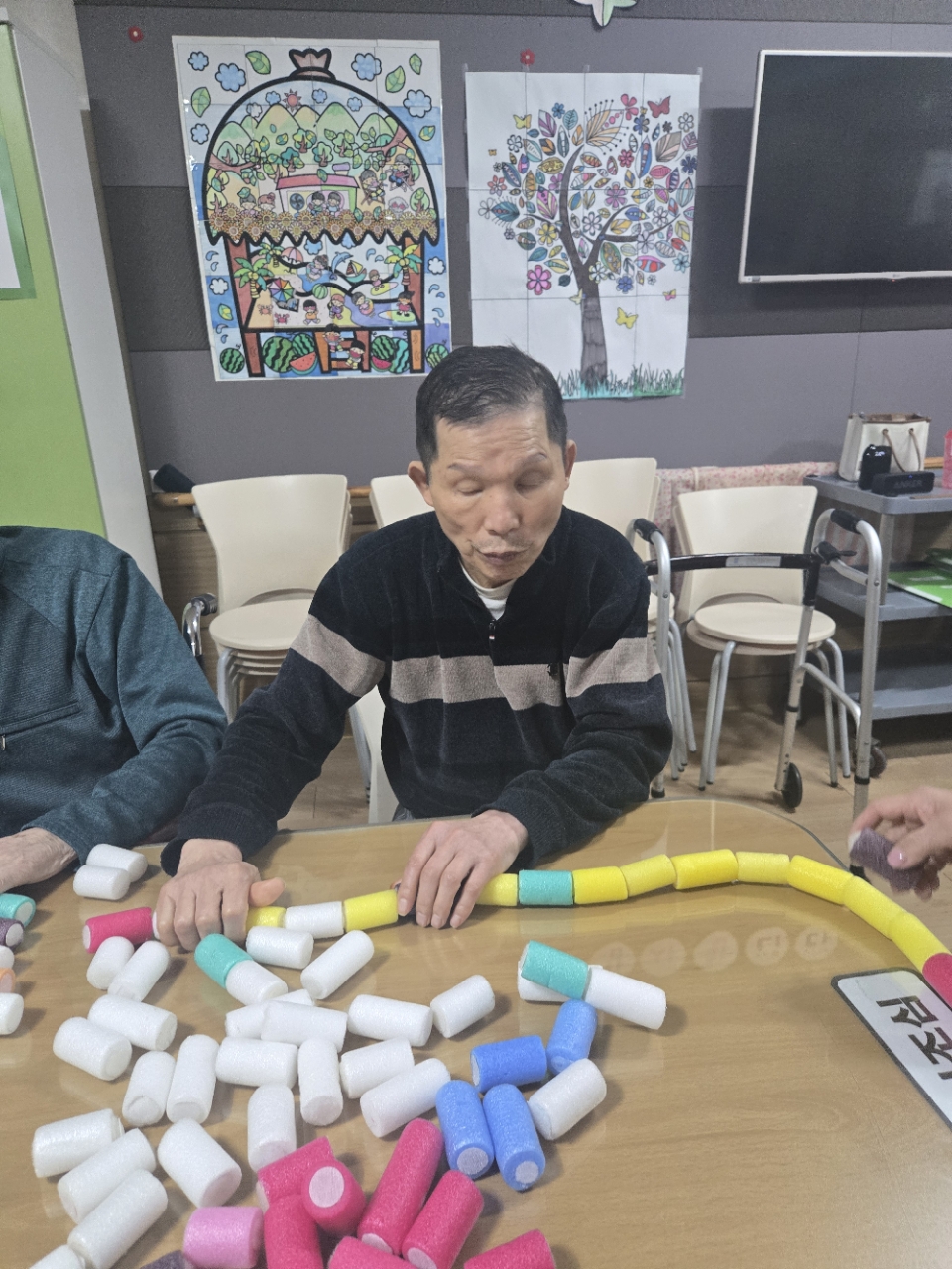 오늘 프로그램은 모형과 여러가지 색깔을 분류하여 창의적 모형을 만들어 보는 창의력 인지 프로그램 시간입니다.