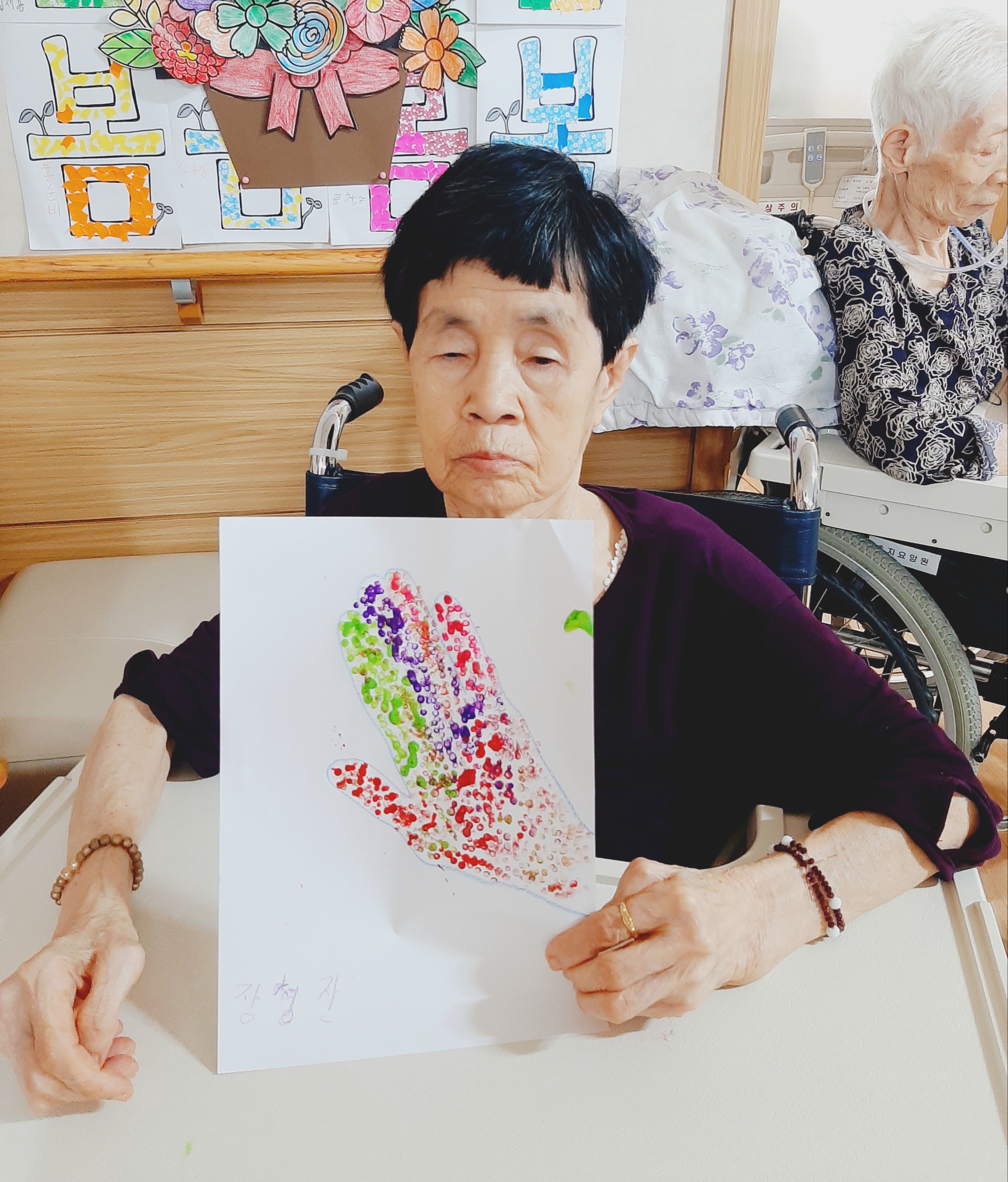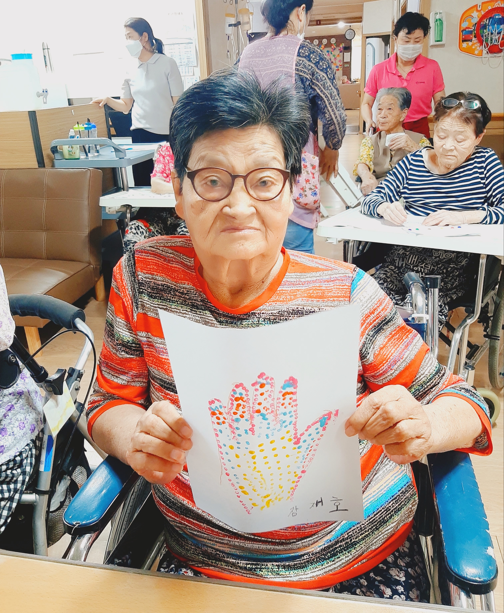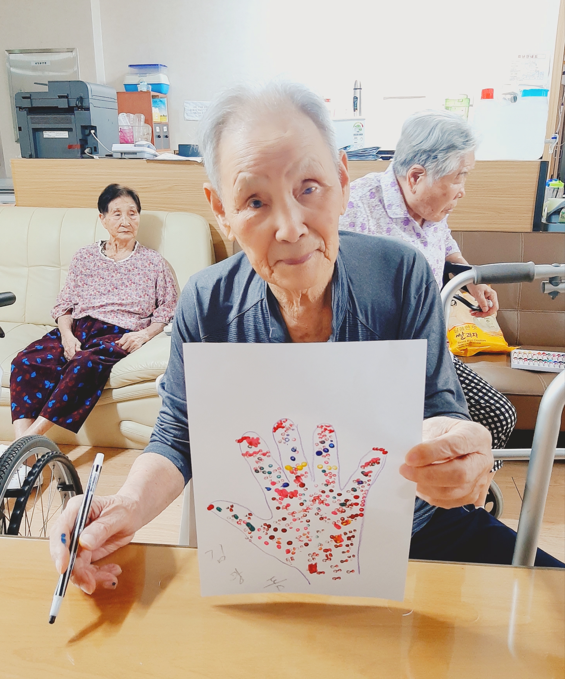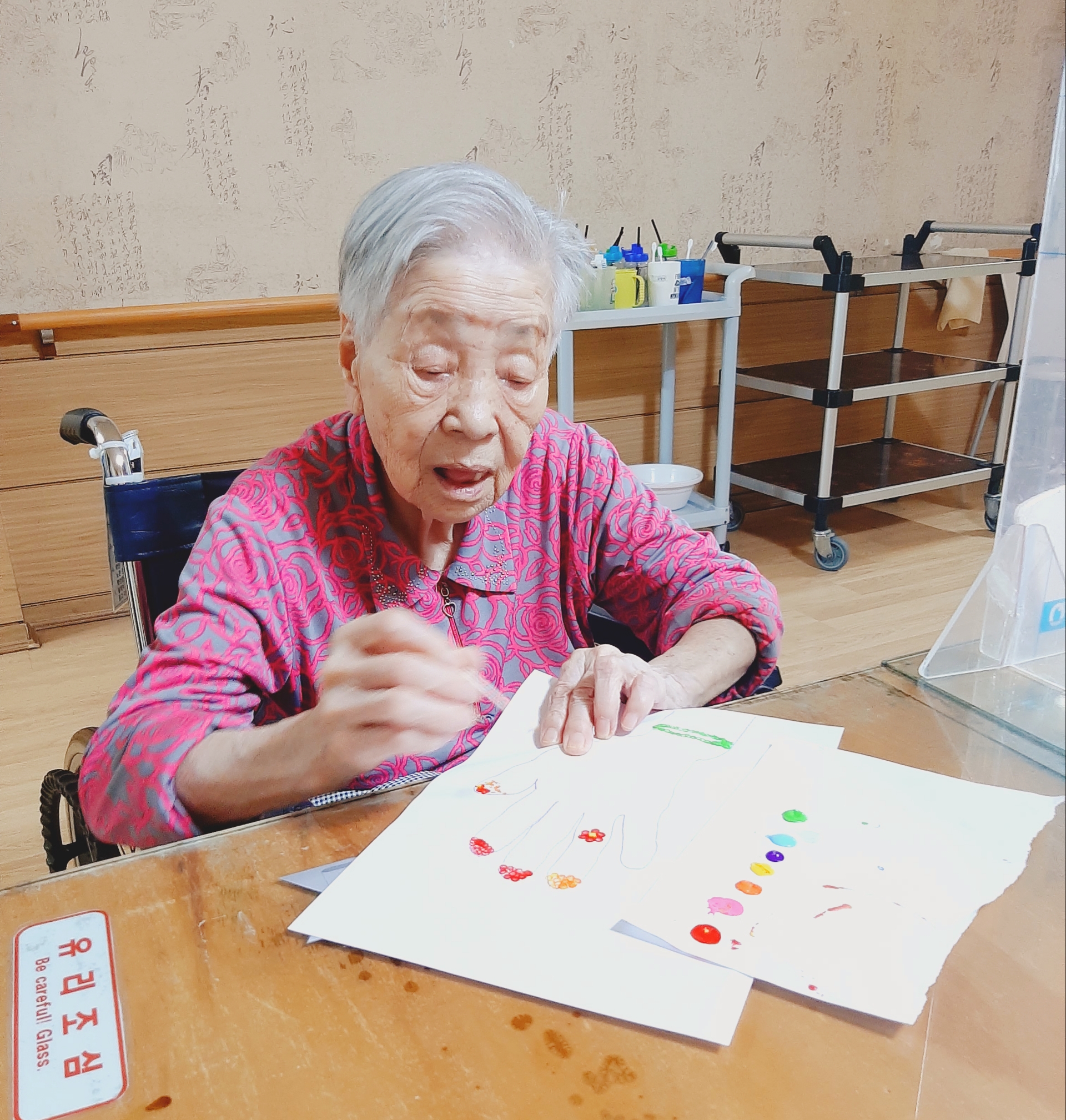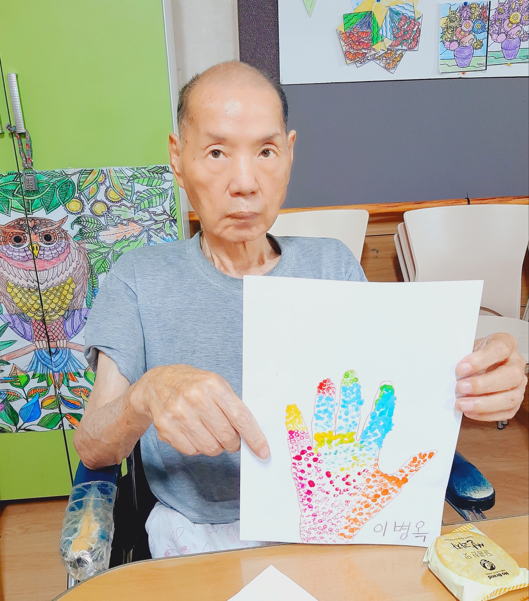 오늘 오후에는 어르신 손바닥을 대고 그려 물감으로 찍기를 하였습니다
