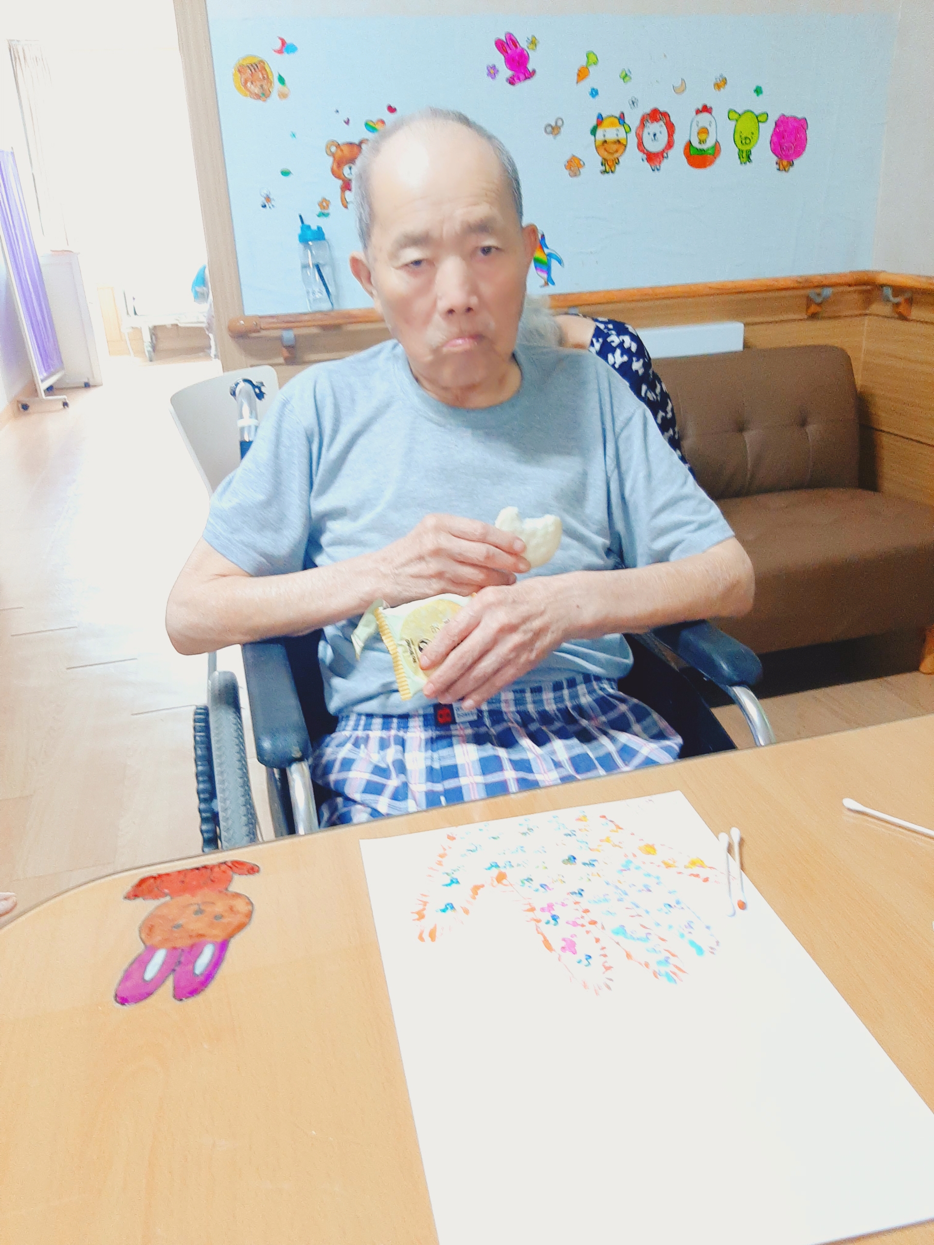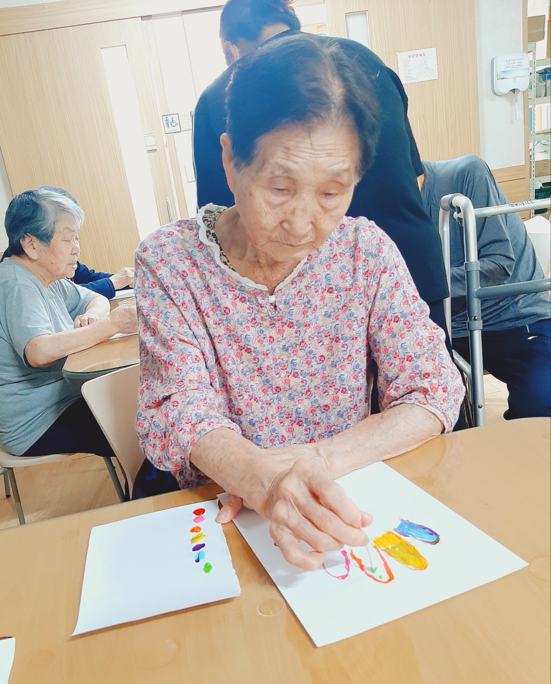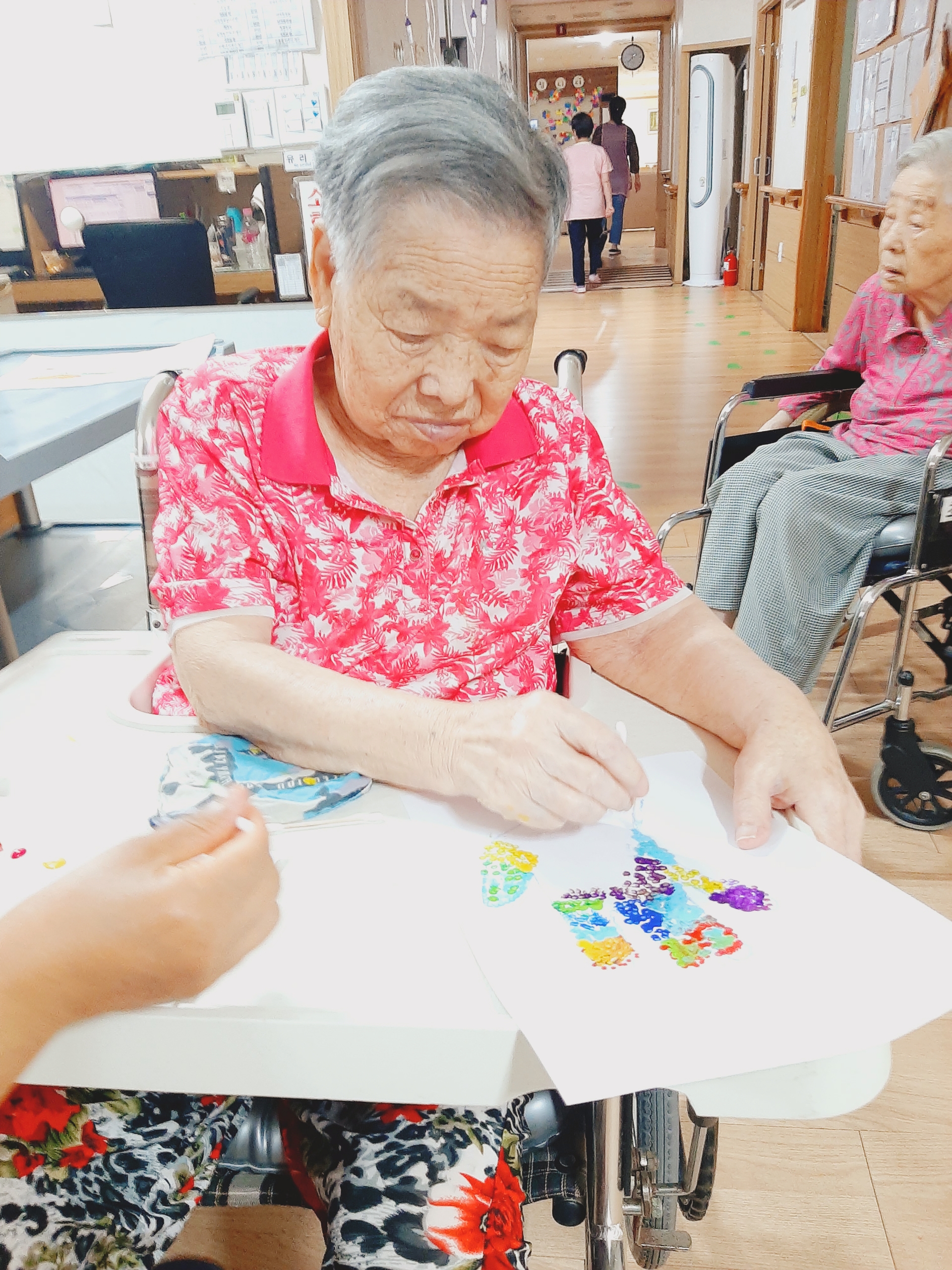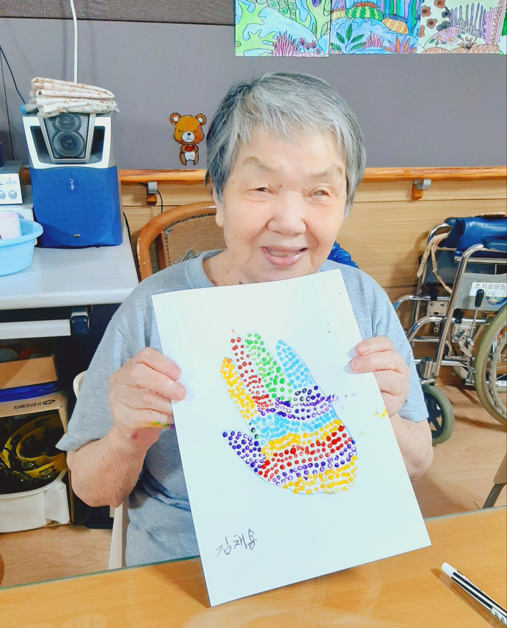 오늘 오후에는 어르신 손바닥을 대고 그려 물감으로 찍기를 하였습니다