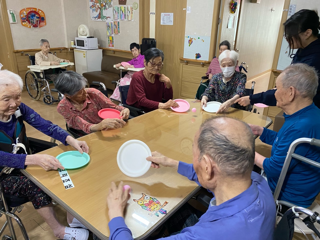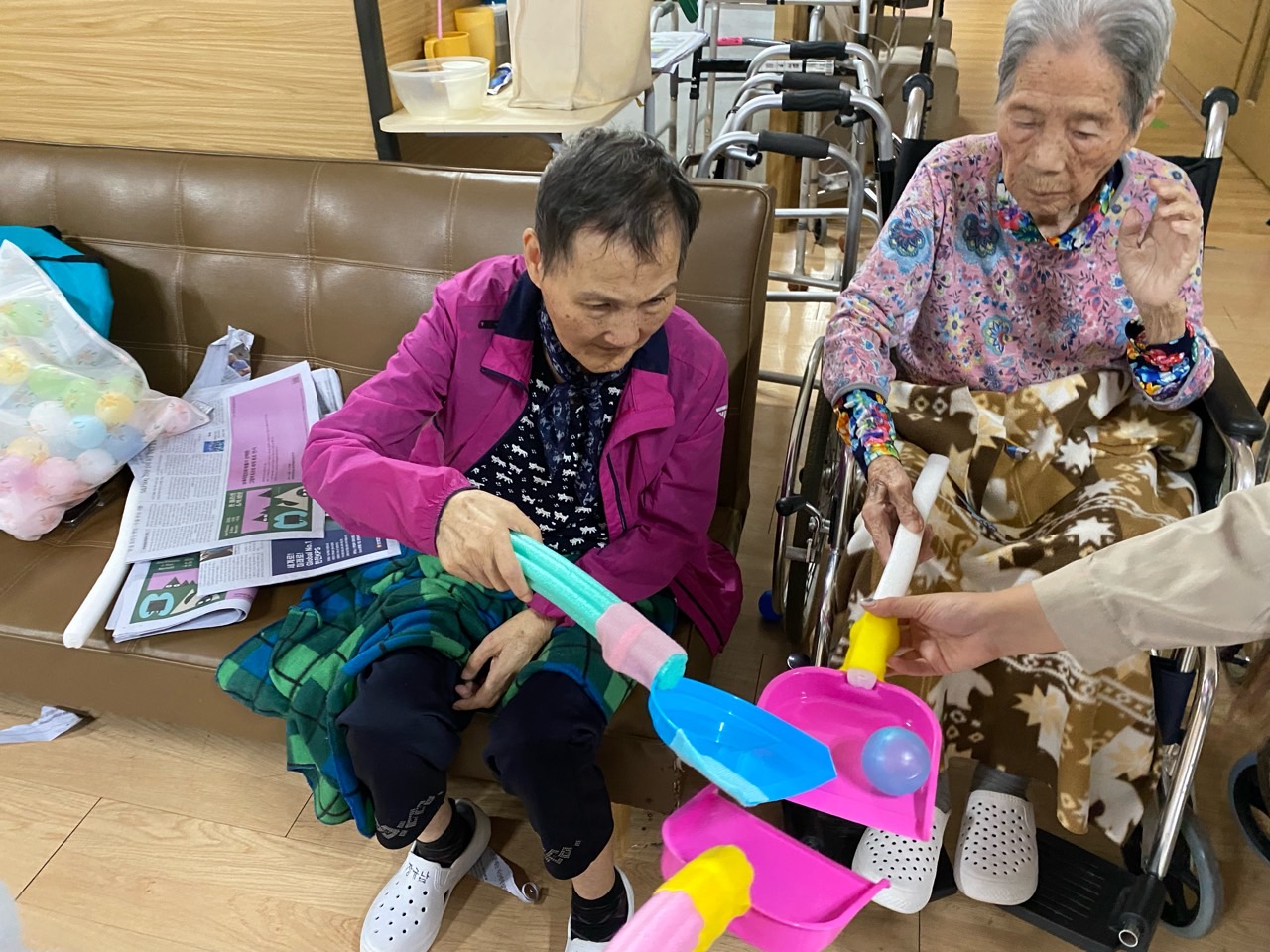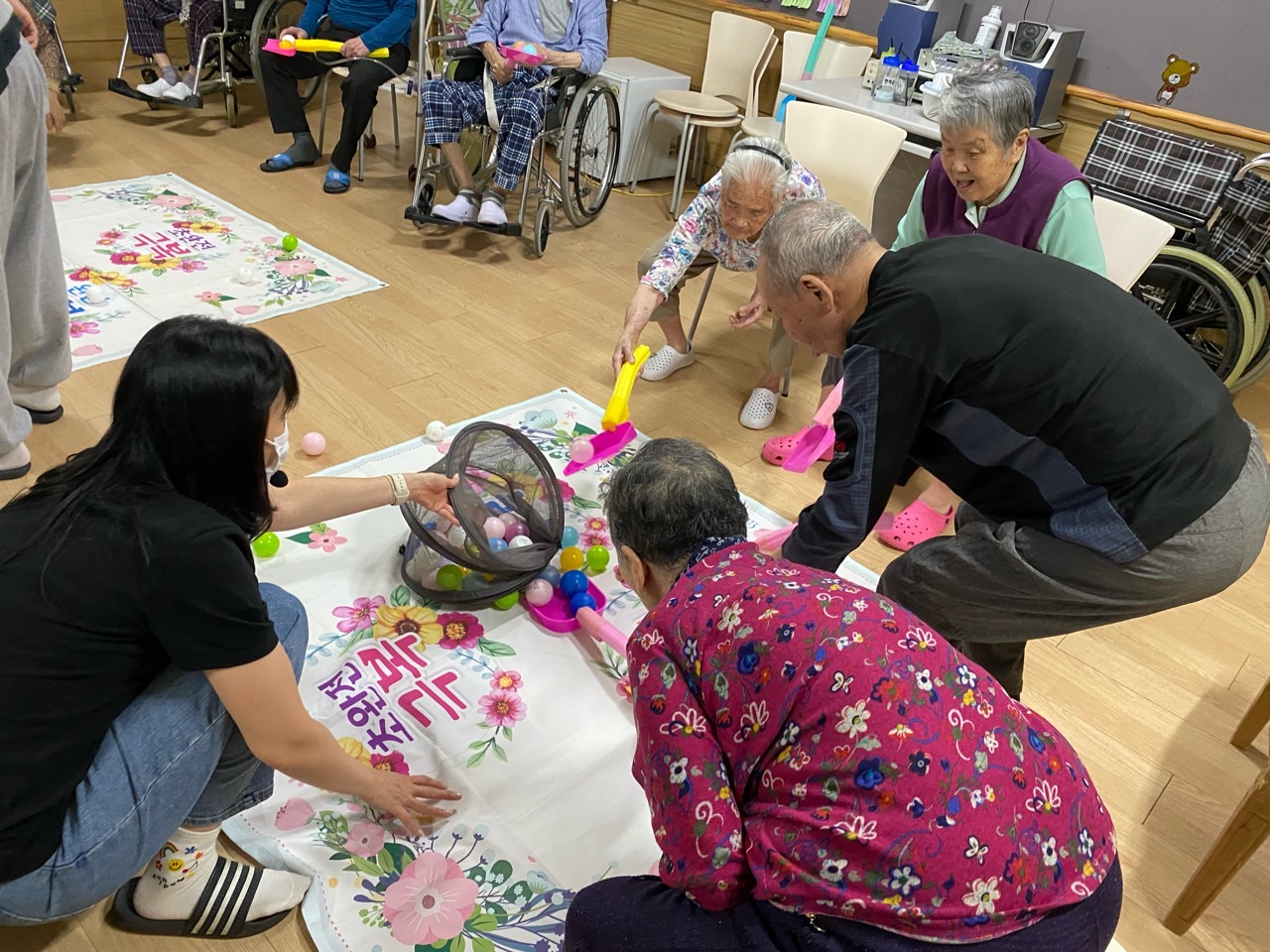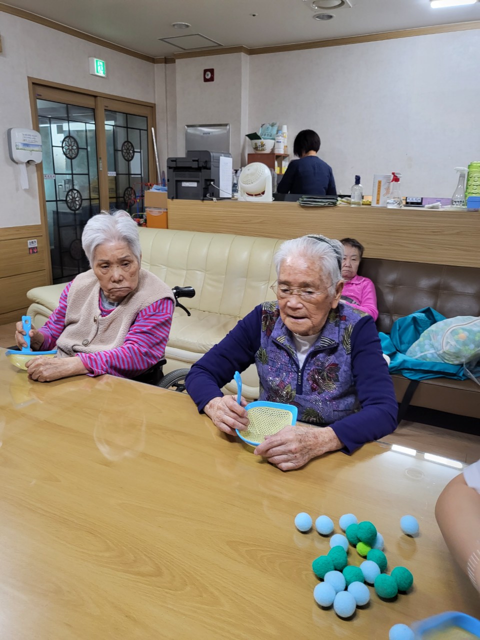 어르신들이 이제 탁구공 놀이를 제법 잘 하십니다.