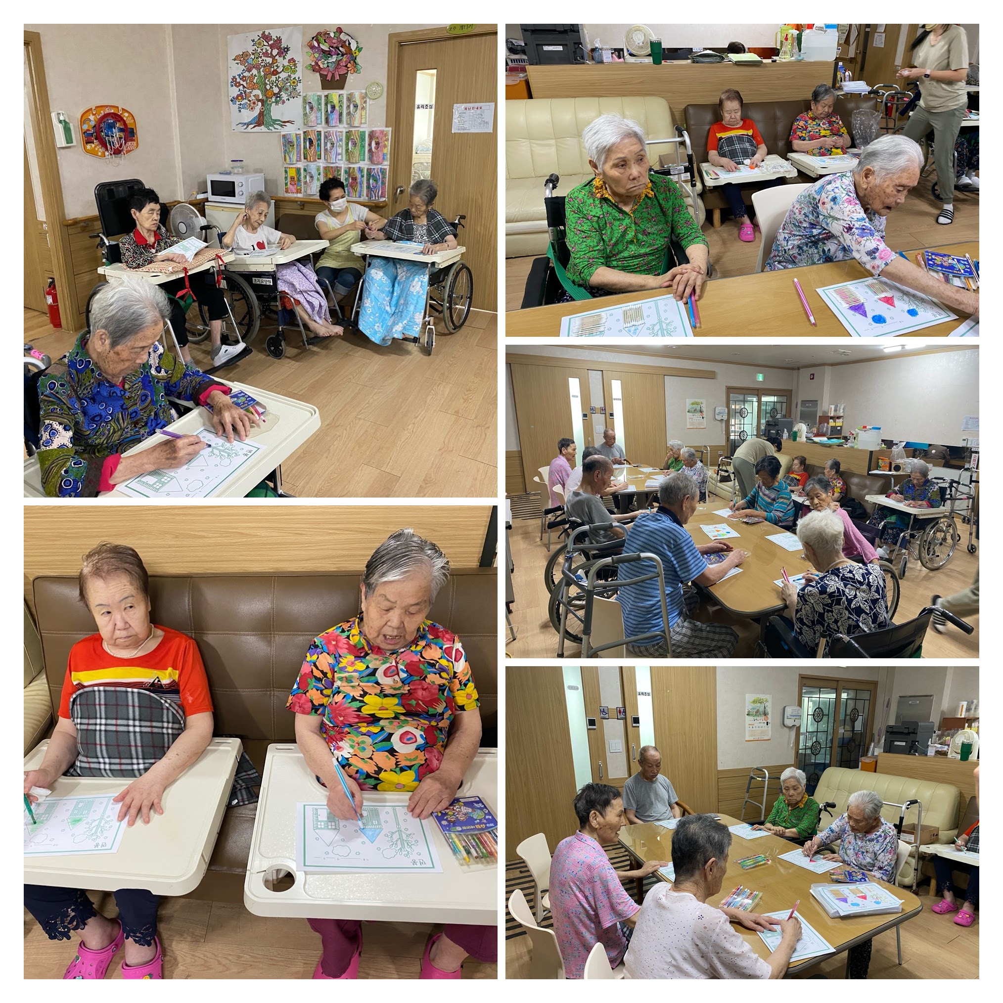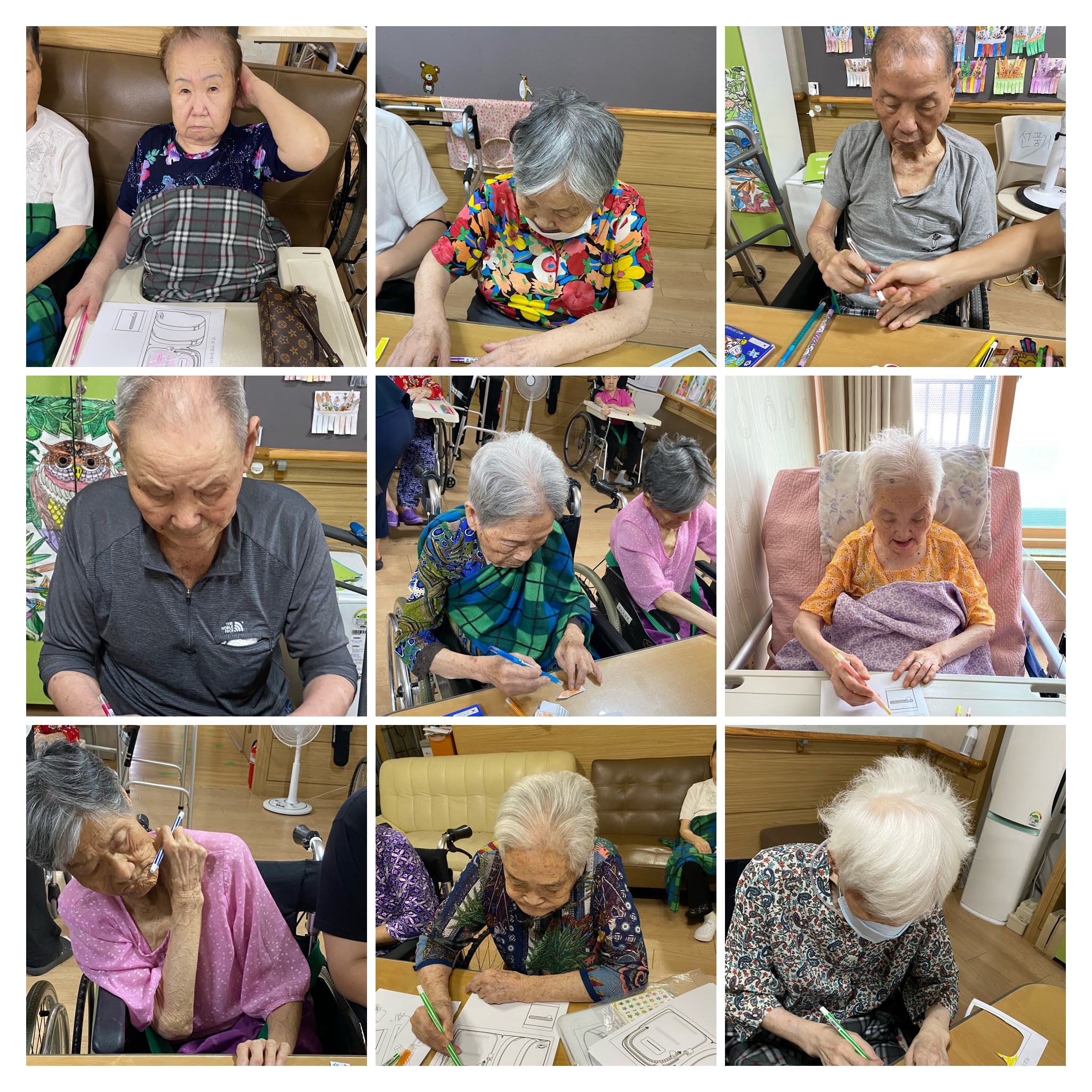 학창시절 이야기를하며 학교가방을 색칠해보고 오리고 붙이며 예쁘게 가방을 꾸며 보셨습니다. ㅎㅎ