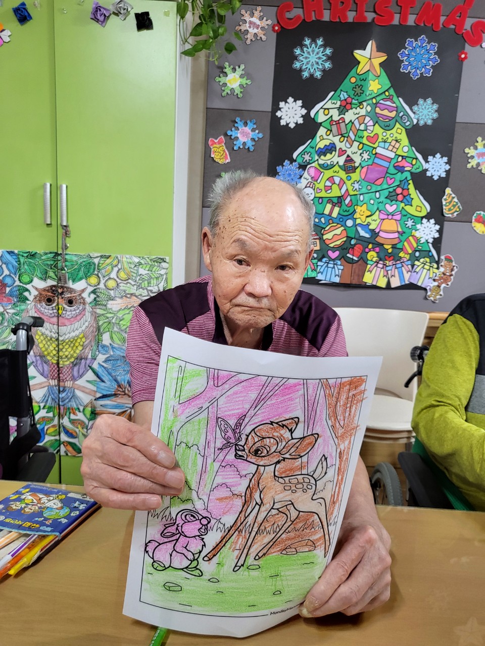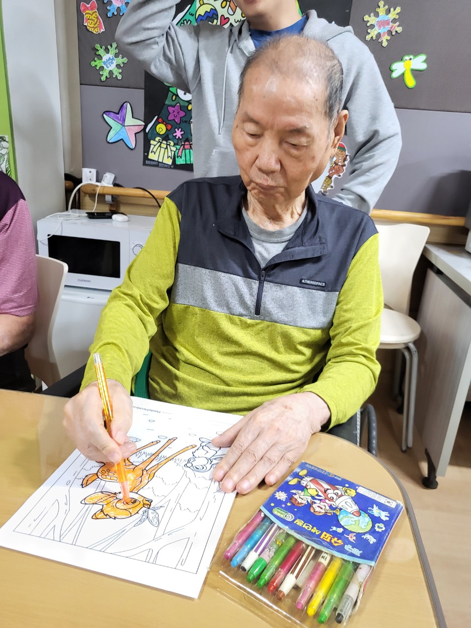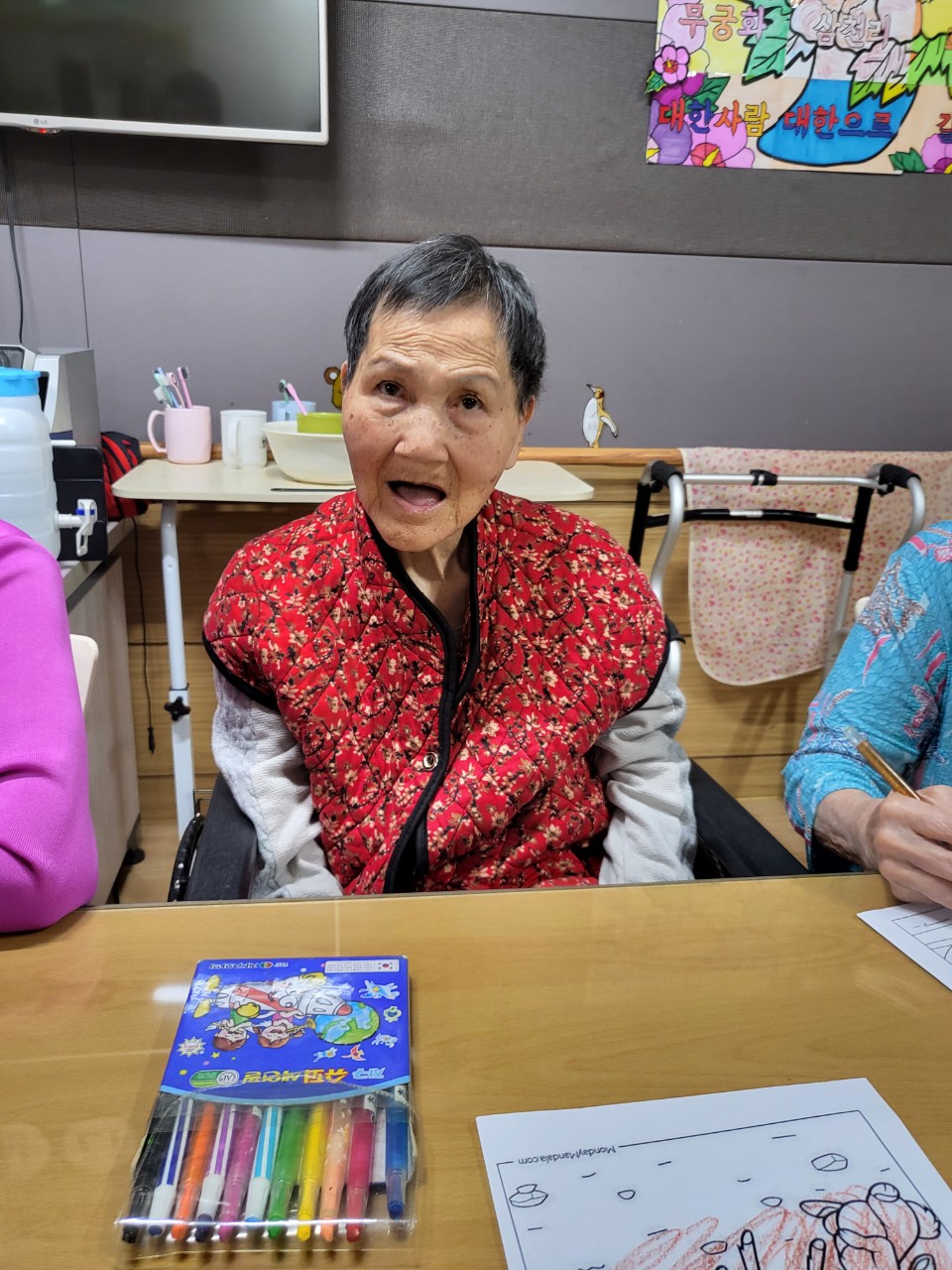 2. 준비된 그림도안과 색연필을 어르신께서 만져보게 한다.