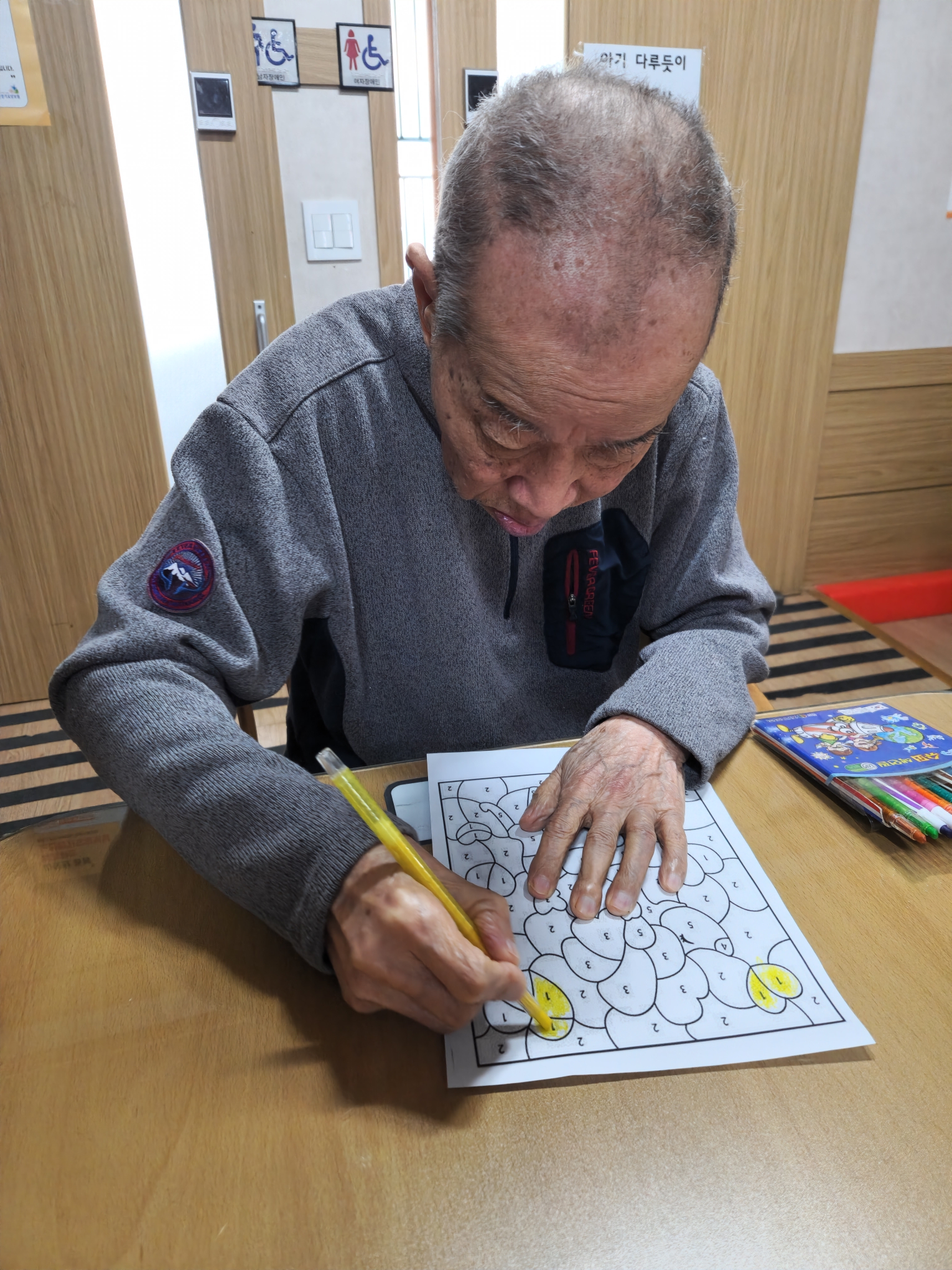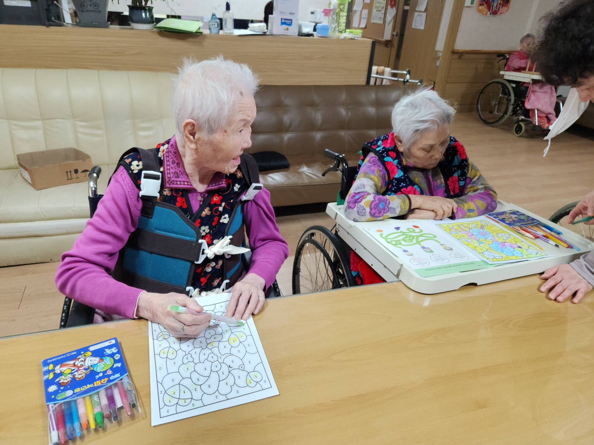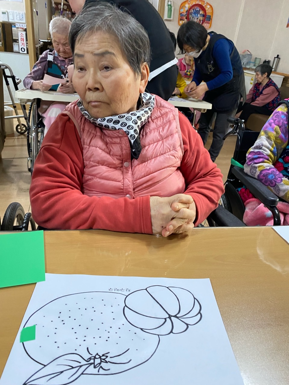 2. 준비된 그림도안과 색연필을 어르신께서 만져보게 한다.