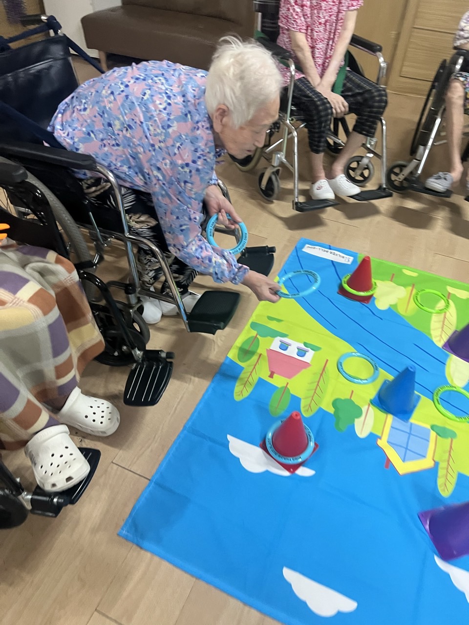 지정된 던지기 지점에서 목표 깃발에 고리를 던져 거는 활동을 해본다.