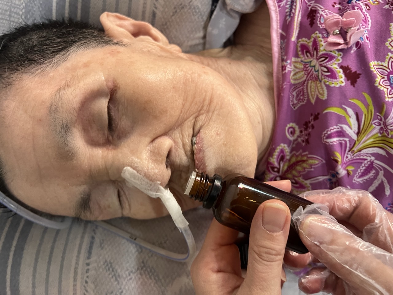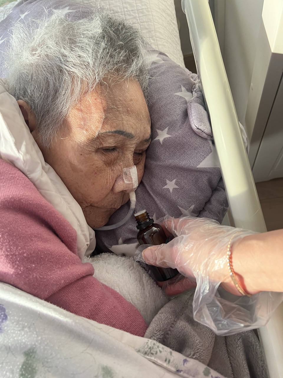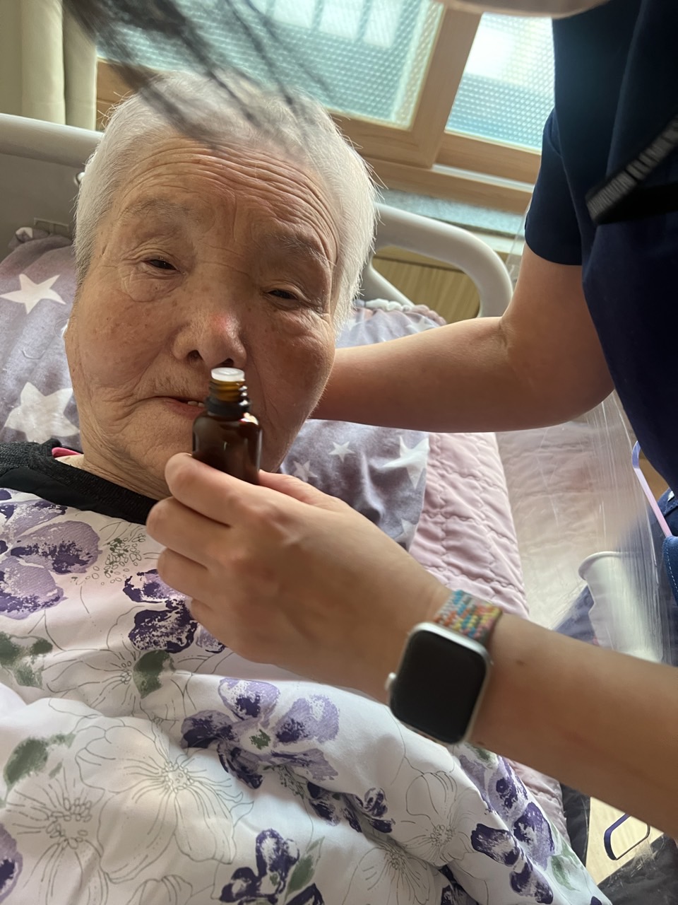 ② 진행 : 코에 오일 냄새를 맡게 하고, 관자놀이에 롤링기법으로 마사지를 해준다.