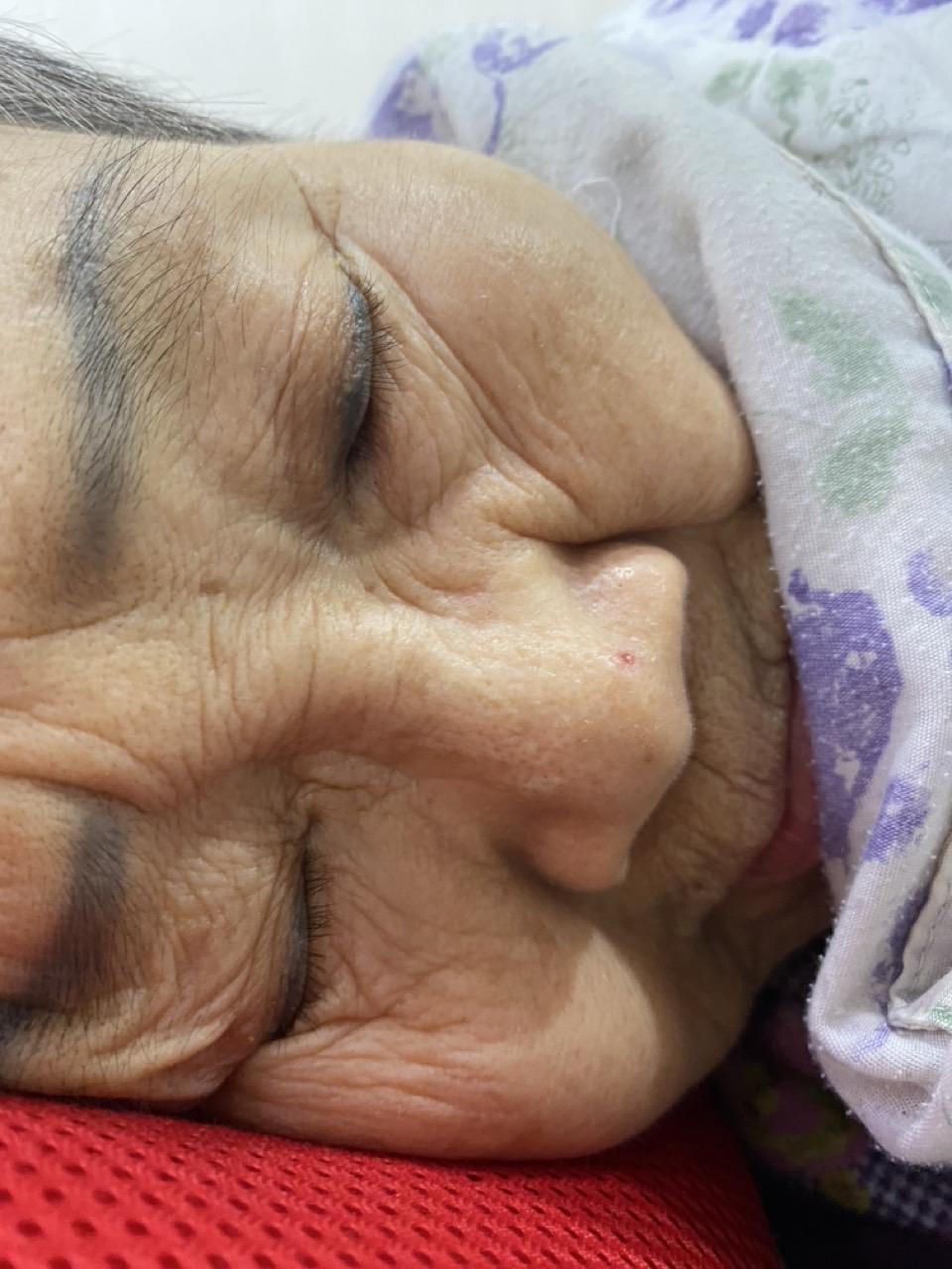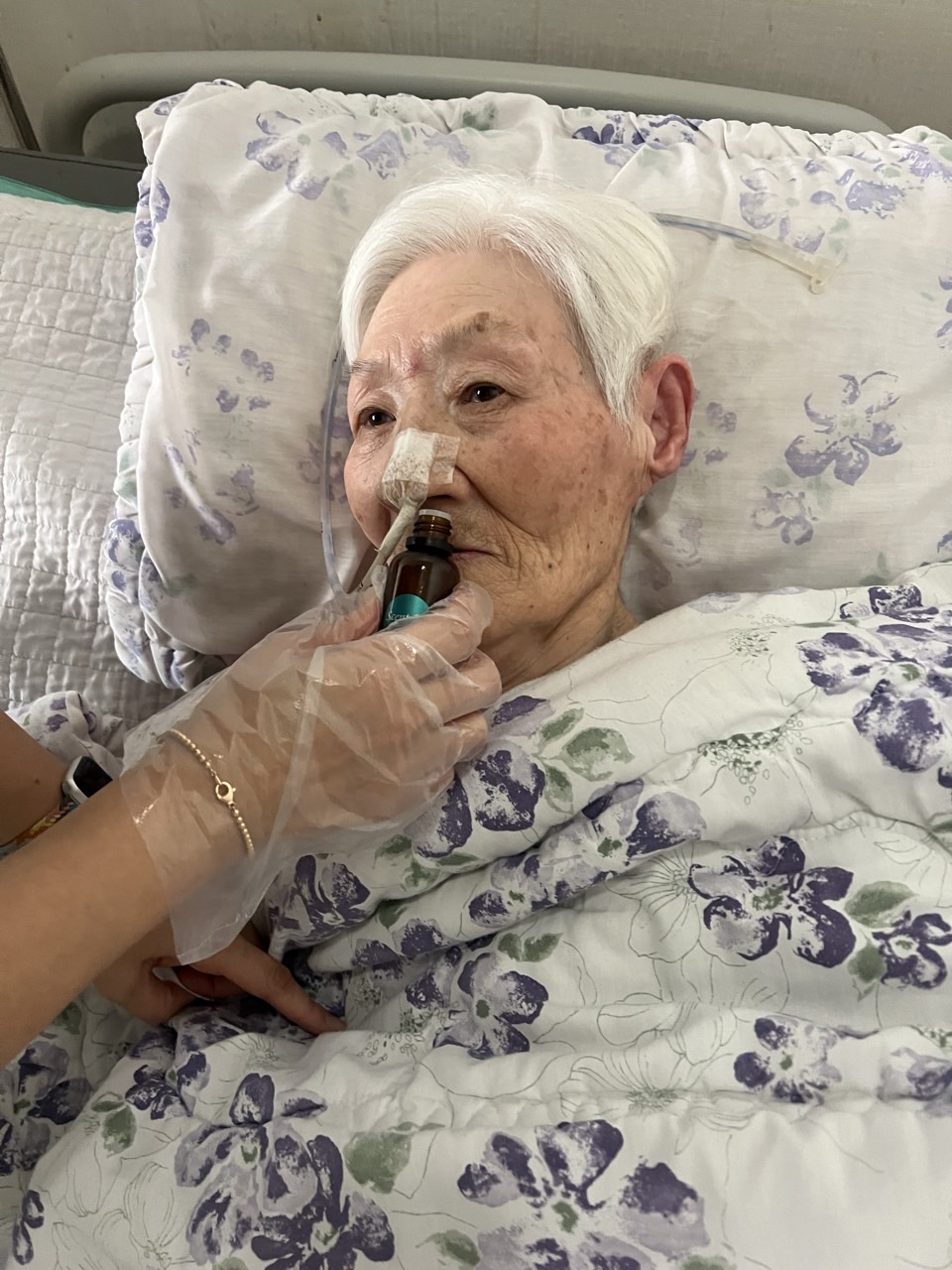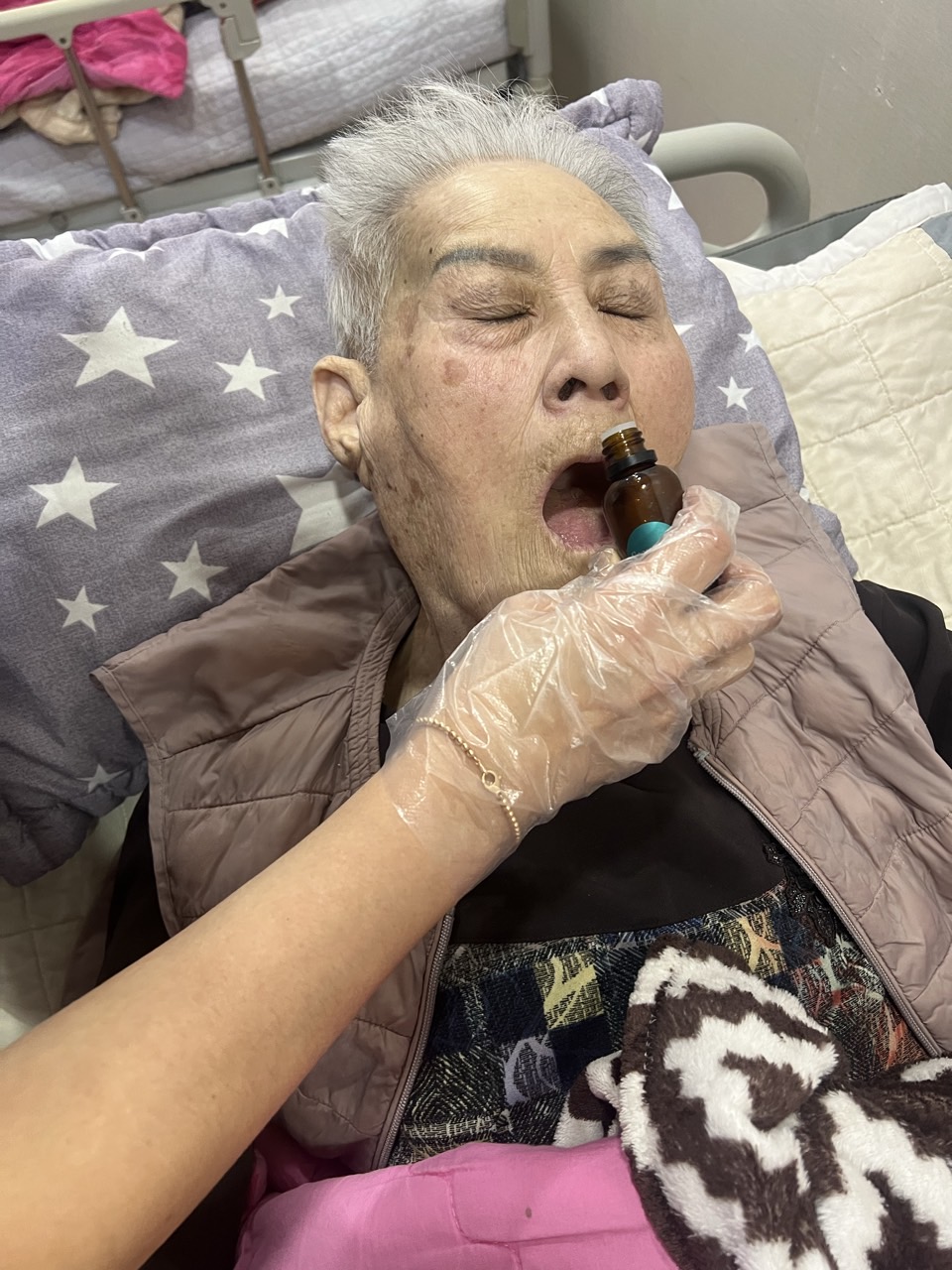 ② 진행 : 코에 오일 냄새를 맡게 하고, 관자놀이에 롤링기법으로 마사지를 해준다.