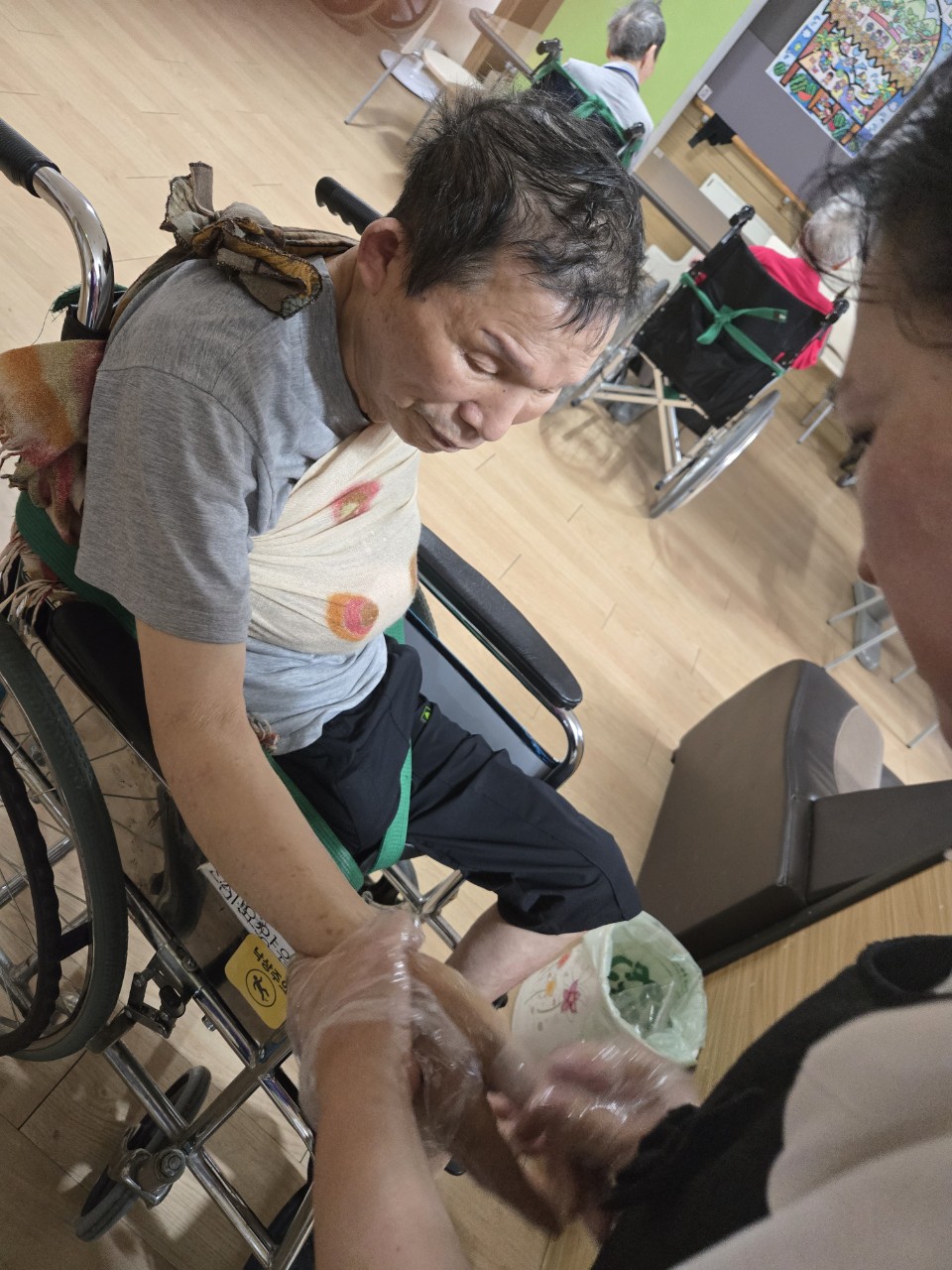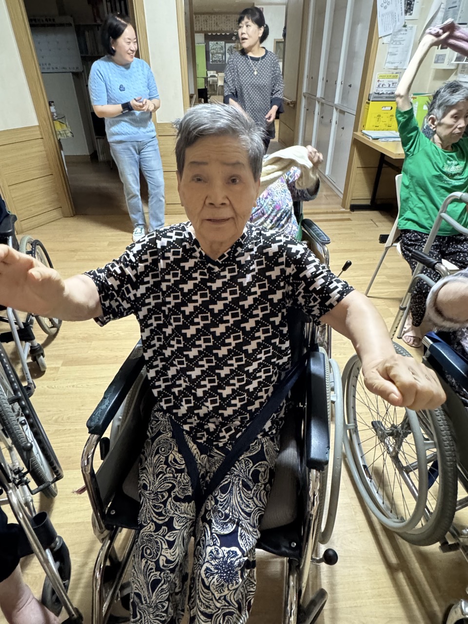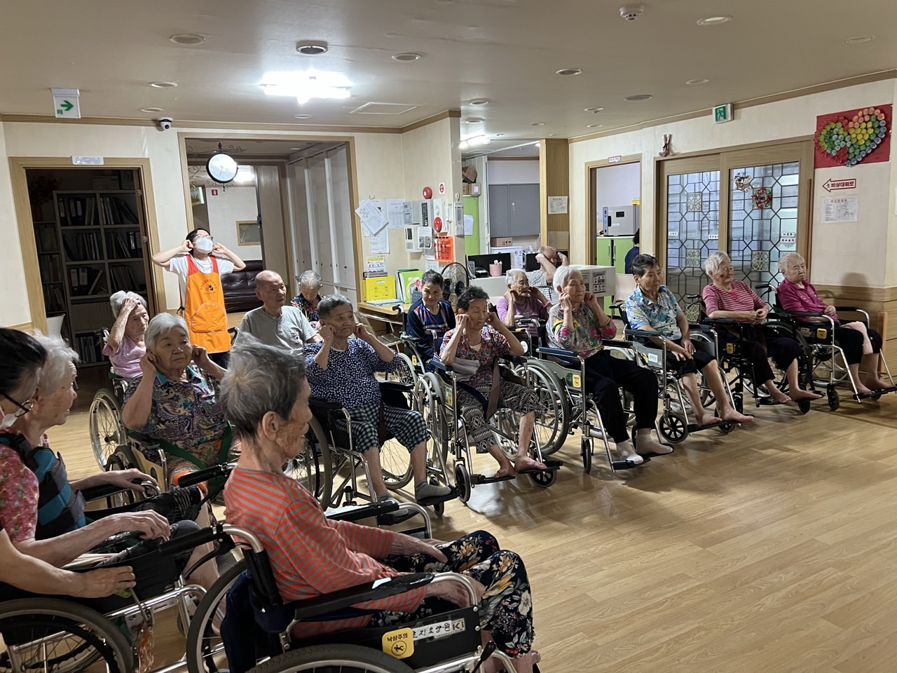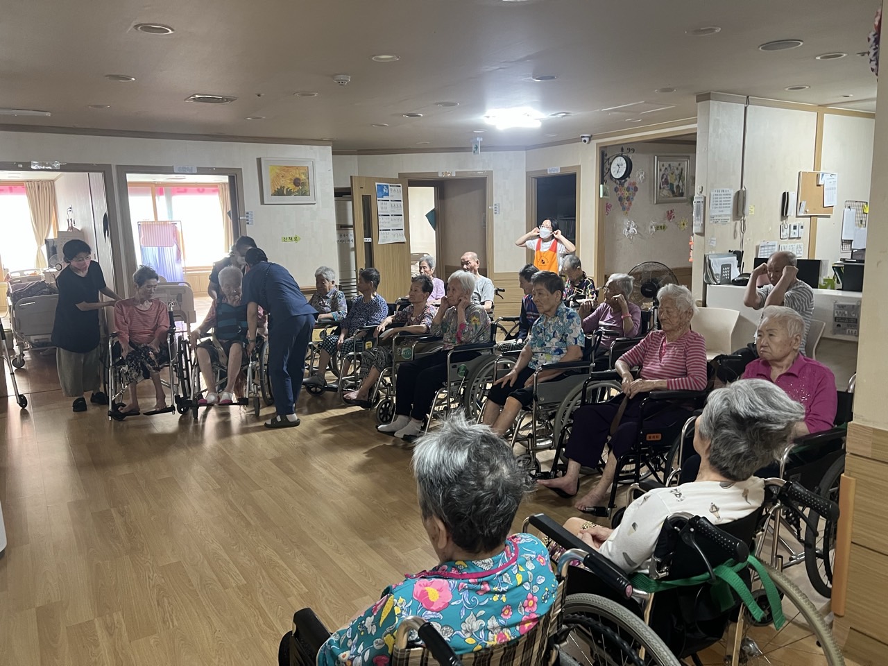 ① 어르신들을 중앙홀로 모신다. (모시기 힘든 어르신을 각 방으로 찾아간다.)