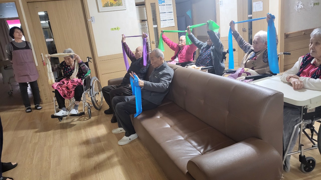 ② 어르신들에게 탄성밴드를 배분해 드린다.