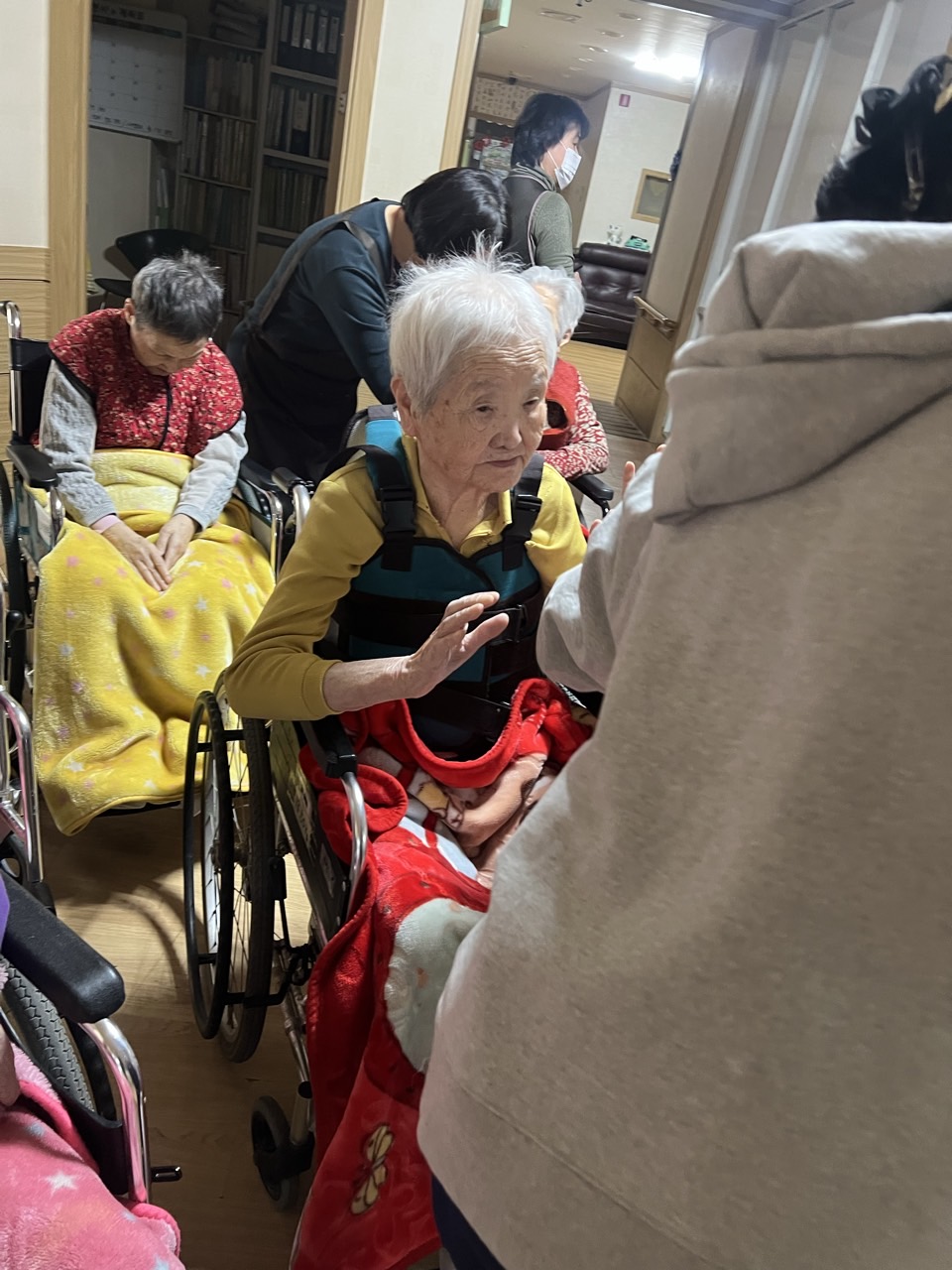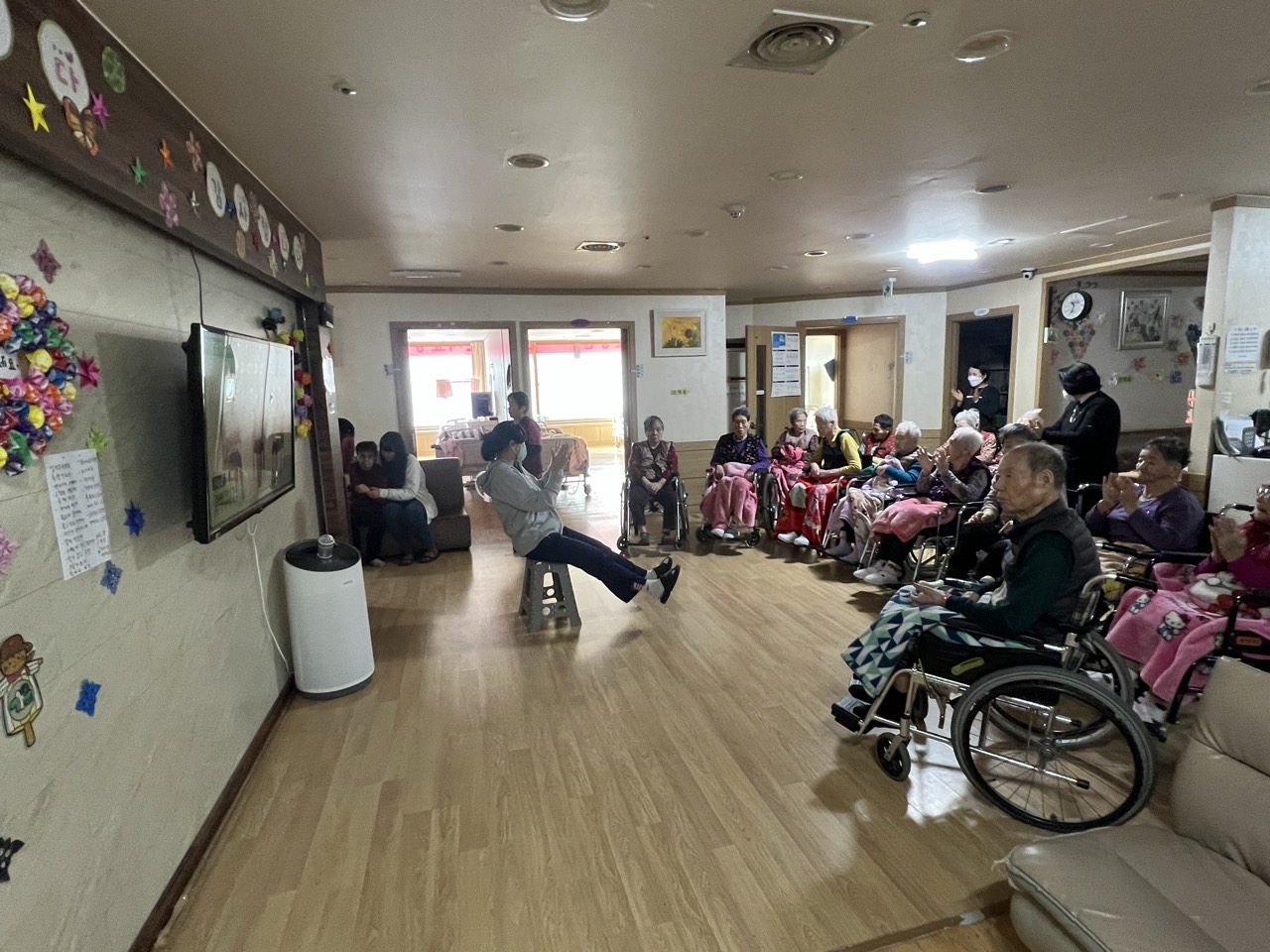 ① 어르신들을 중앙홀로 모신다. (모시기 힘든 어르신을 각 방으로 찾아간다.)