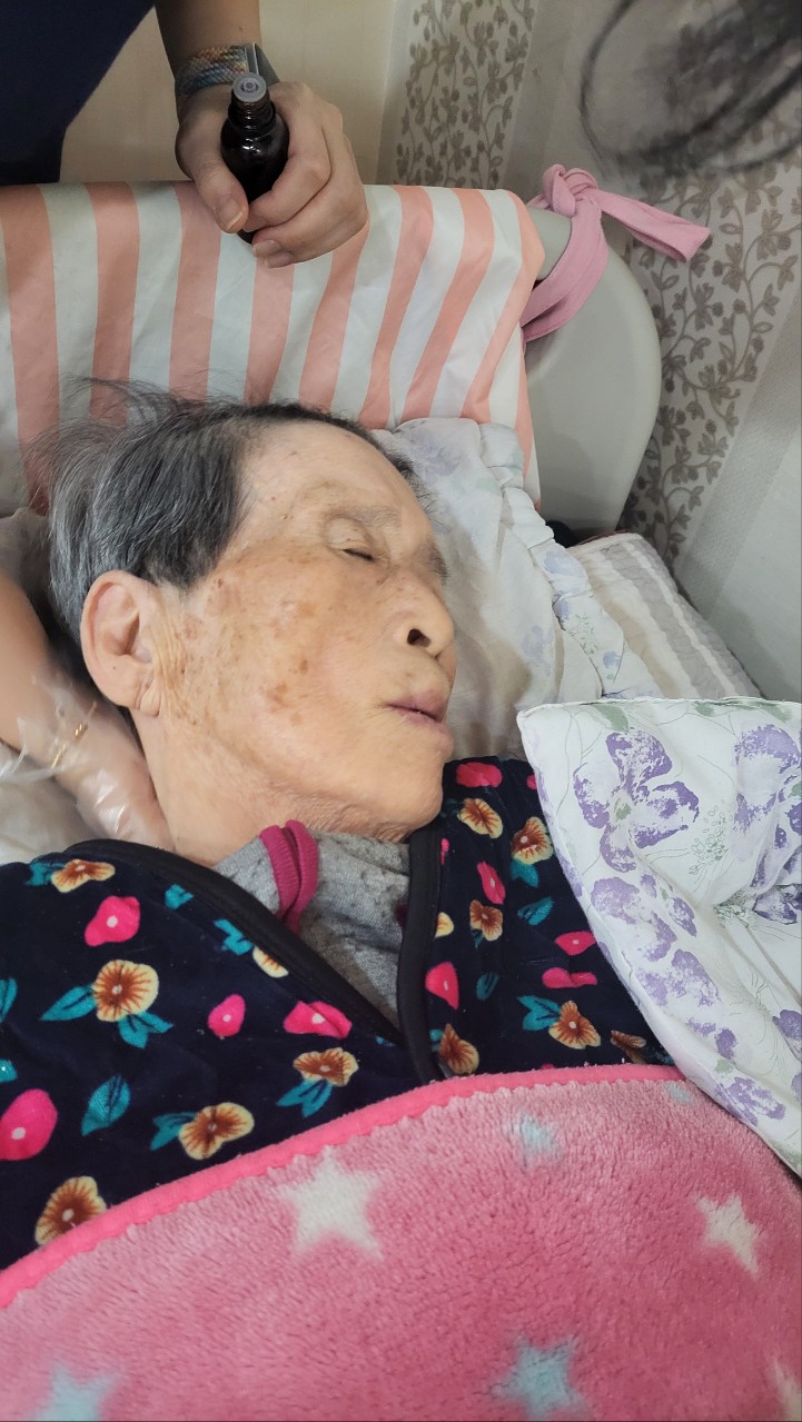 ② 진행 : 코에 오일 냄새를 맡게 하고, 관자놀이에 롤링기법으로 마사지를 해준다.