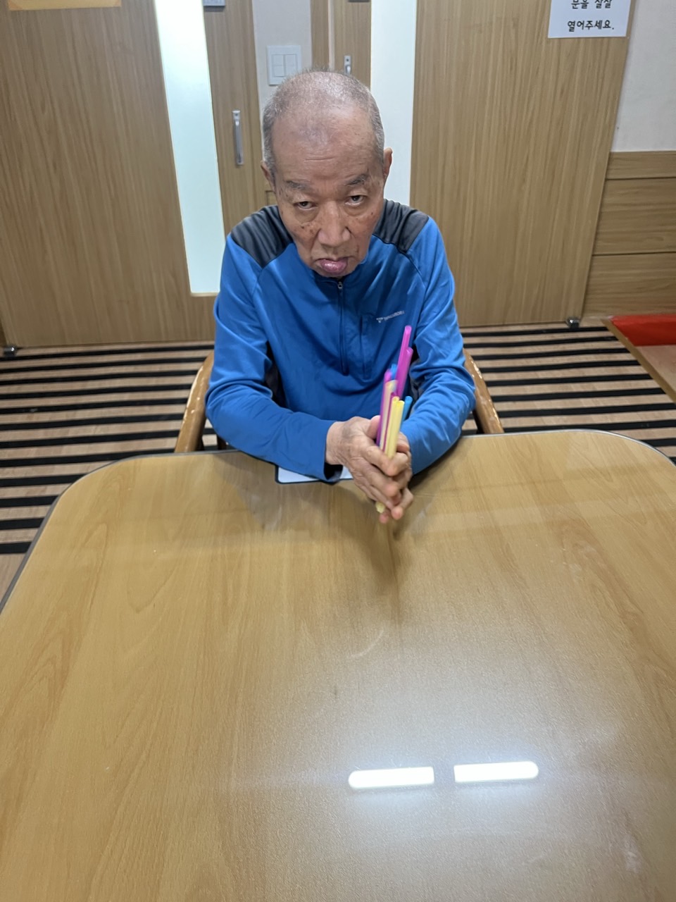 2. 준비된 그림도안과 색연필을 어르신께서 만져보게 한다.