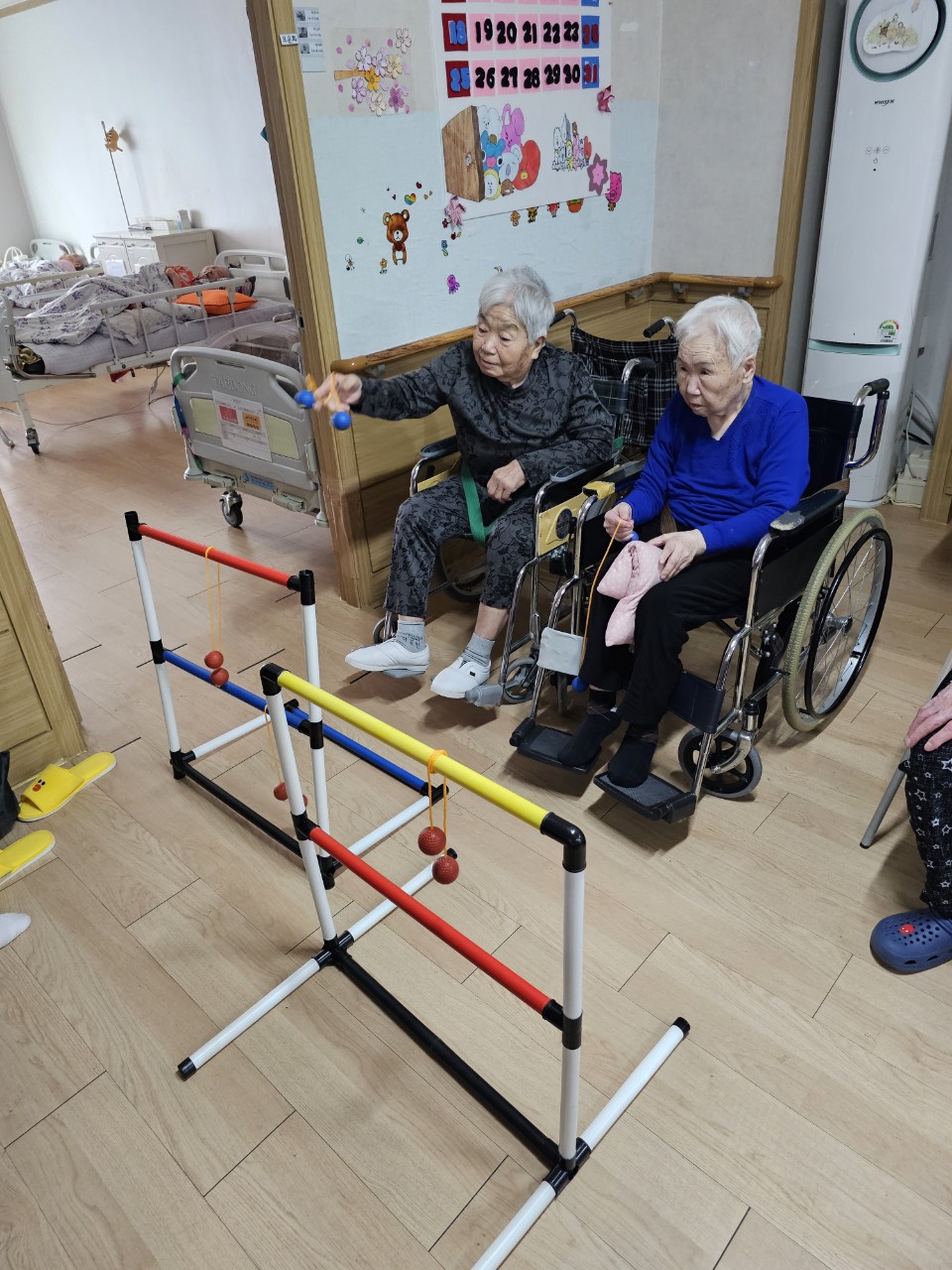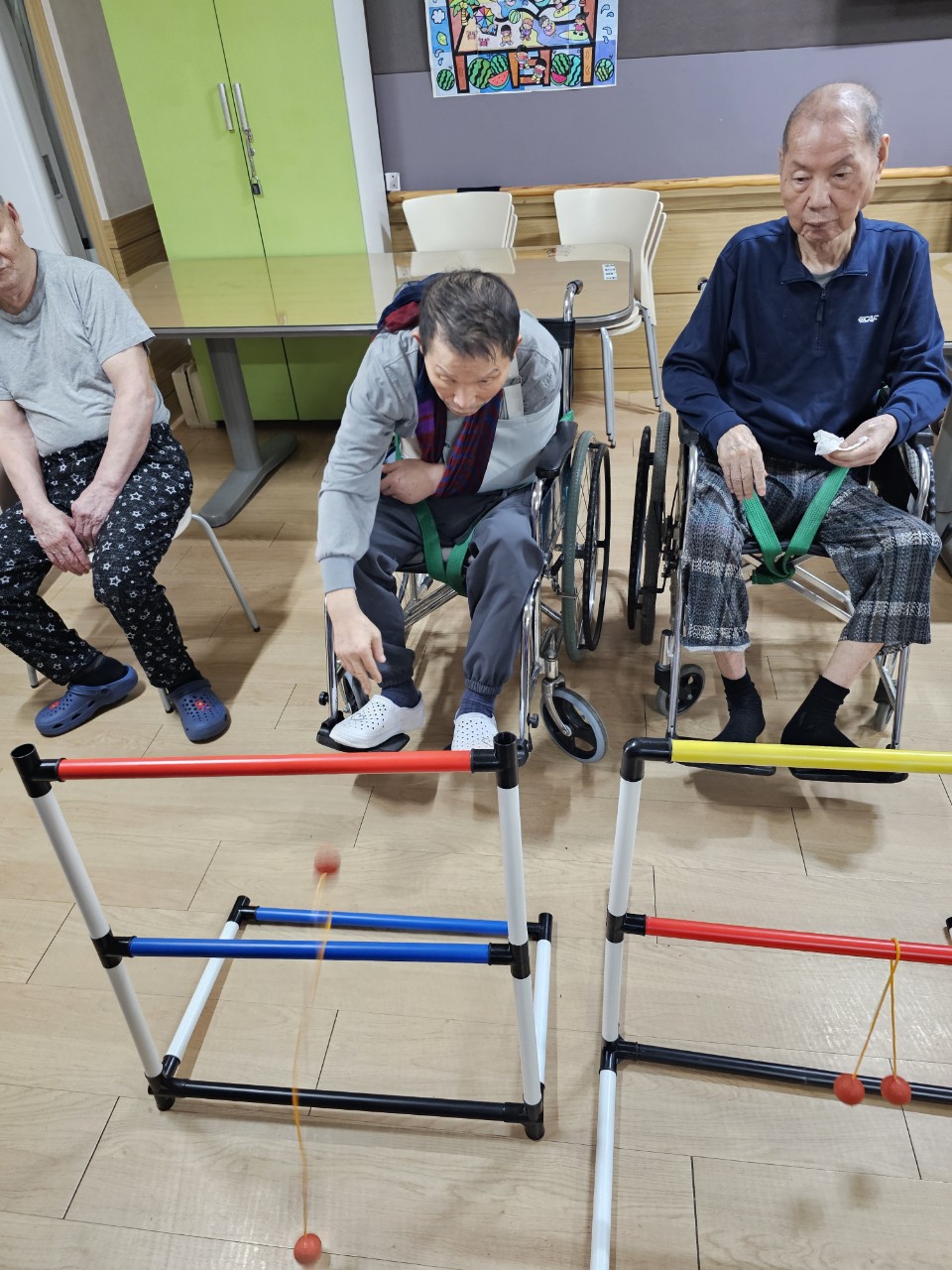 두 개의 공을 연결하여 높이가 다른 사다리에 던져 걸리게하는 신체활동을 해볼수 있다.