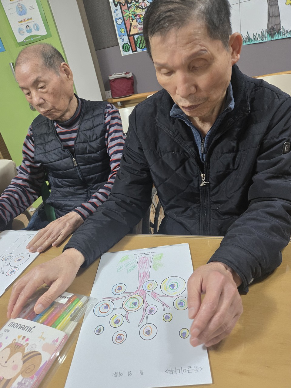 2. 준비된 그림도안과 색연필을 어르신께서 만져보게 한다.