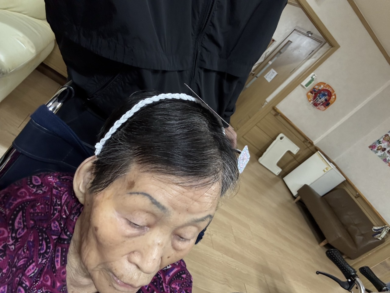 도움을 받아 고무줄로 머리를 땋아보고 머리띠에 붙여서 꾸며 볼 수 있습니다.