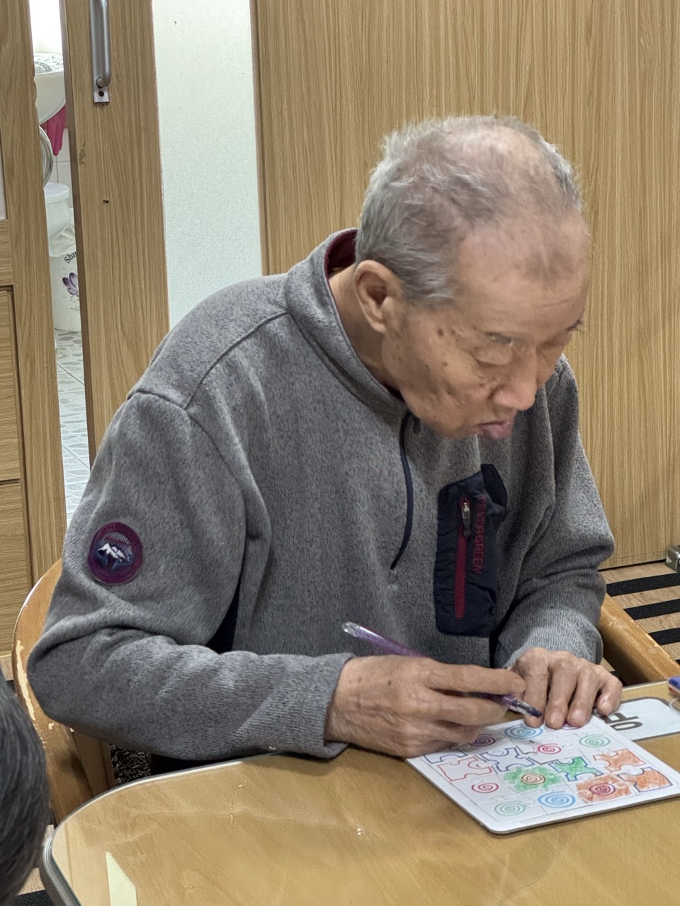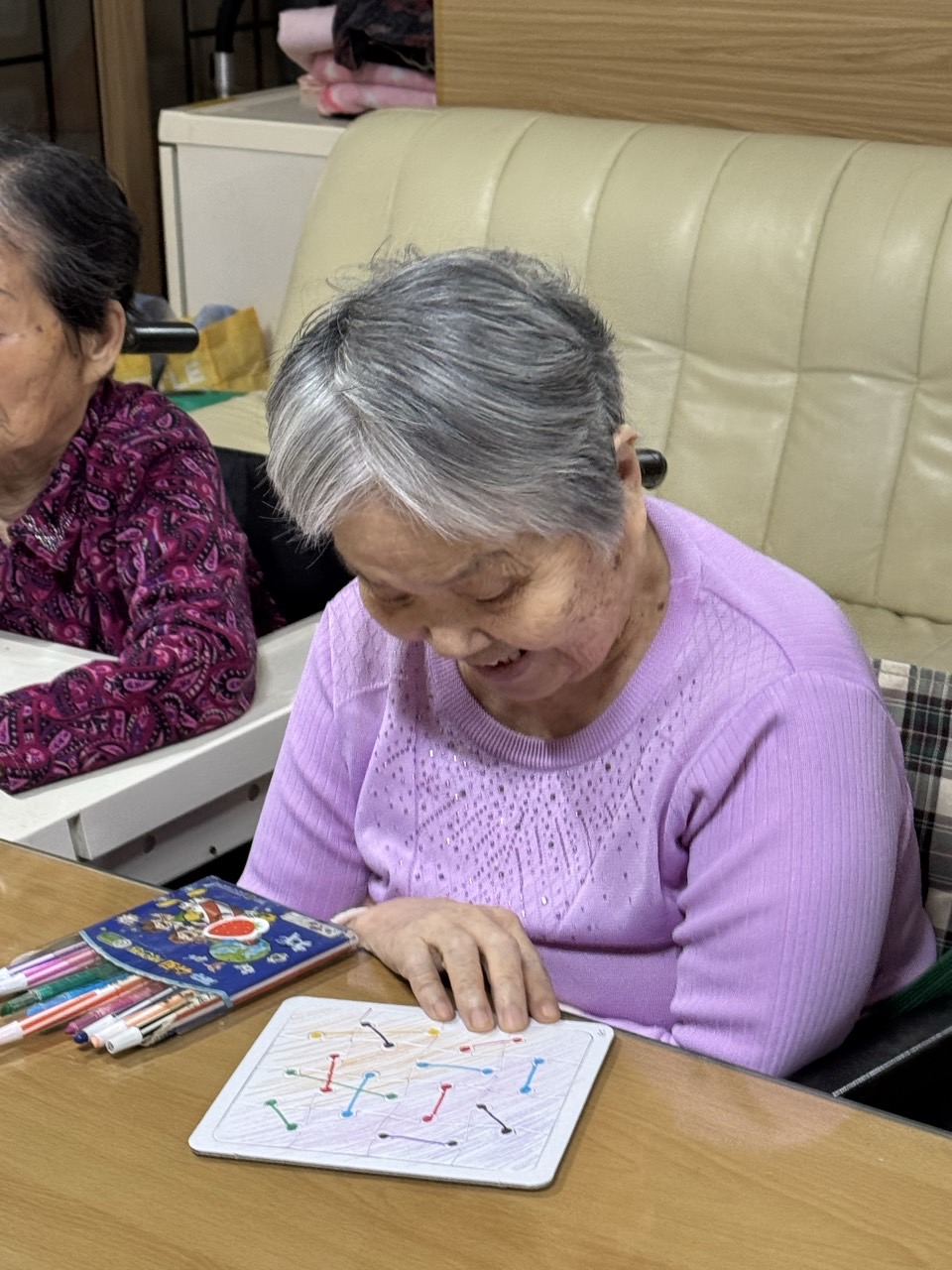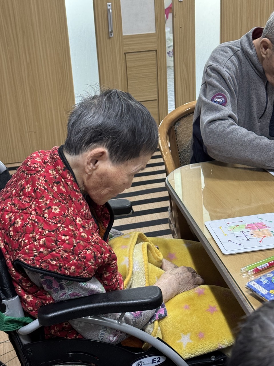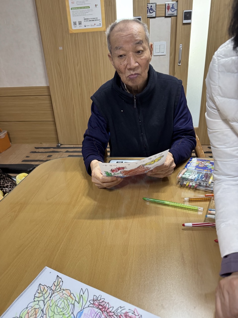 2. 준비된 그림도안과 색연필을 어르신께서 만져보게 한다.