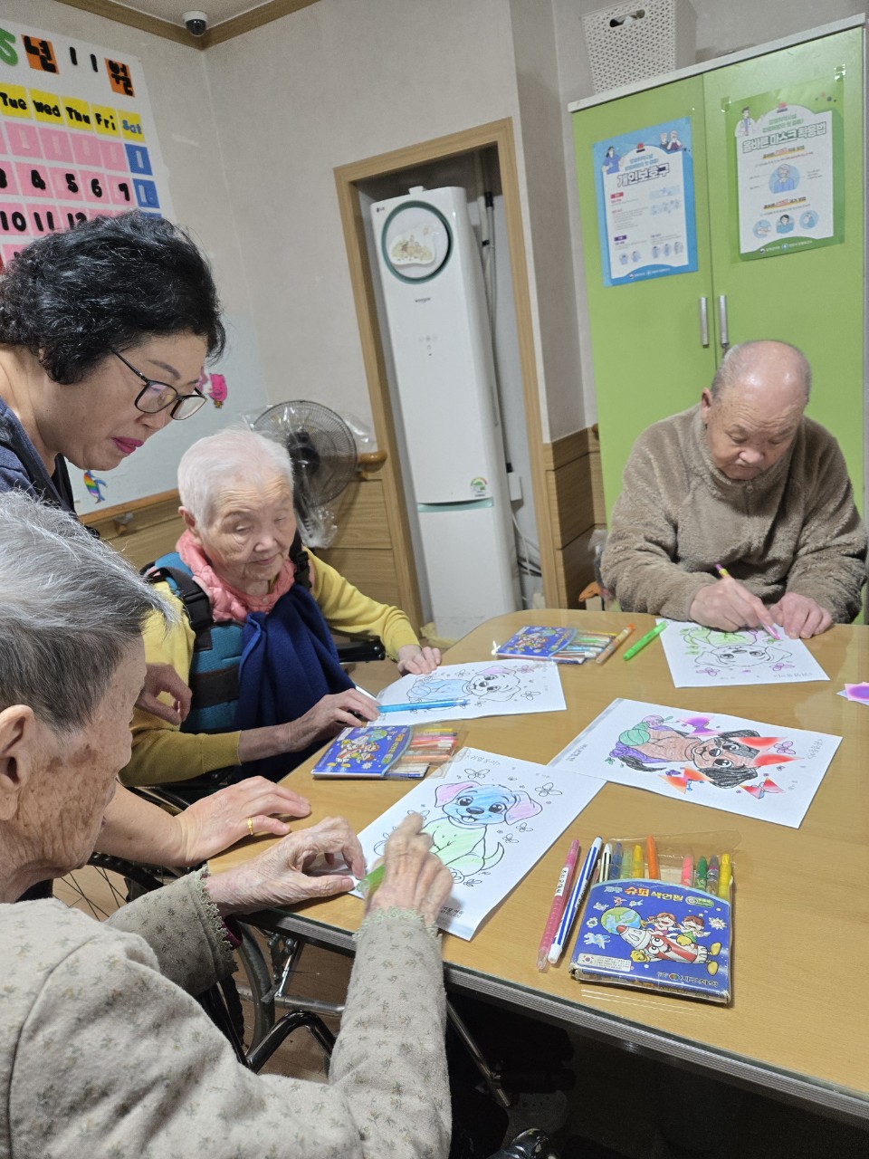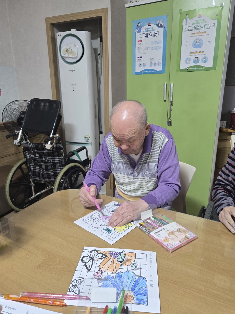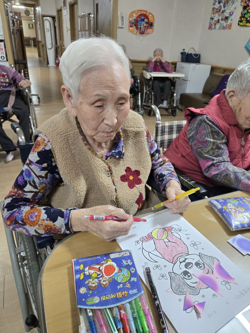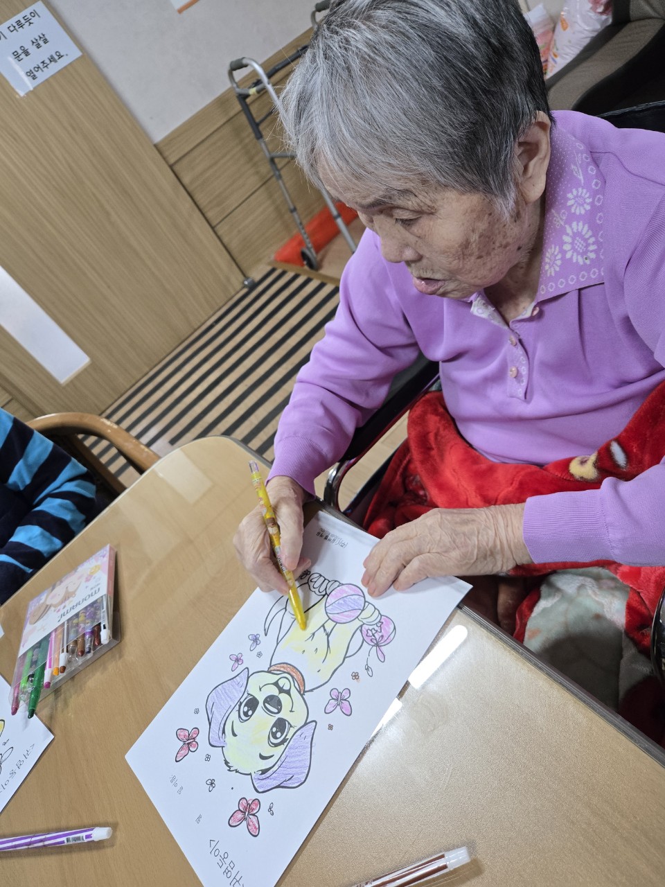 2. 준비된 그림도안과 색연필을 어르신께서 만져보게 한다.