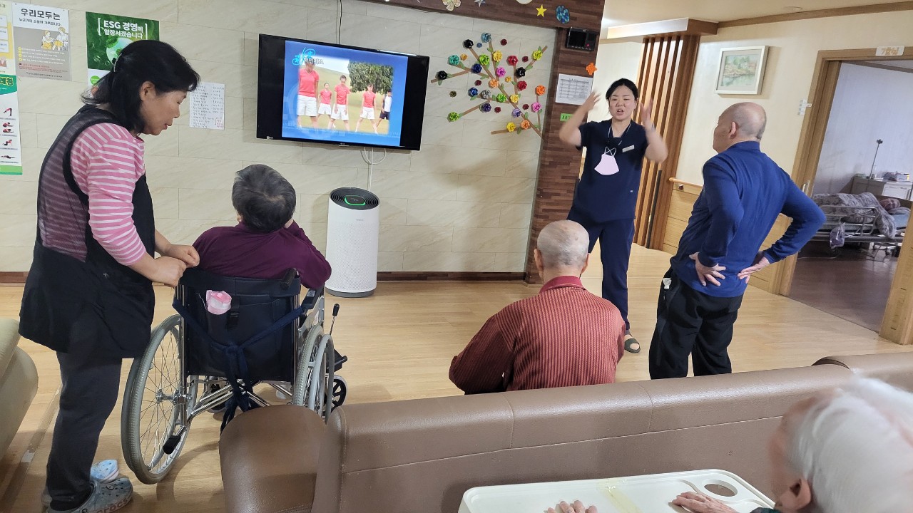 ② 음악을 틀고 체조영상을 보여드린다.