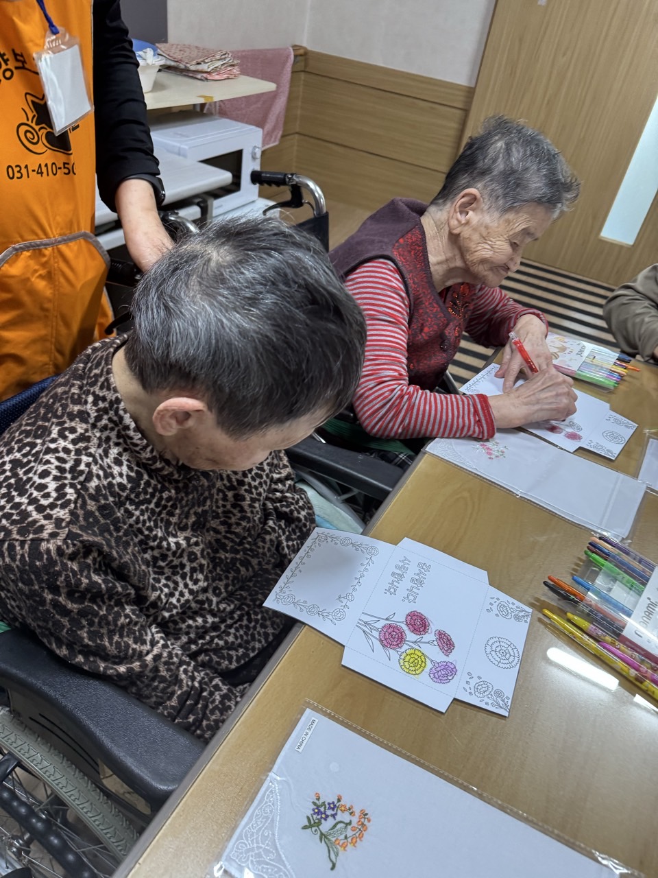 2. 준비된 그림도안과 색연필을 어르신께서 만져보게 한다.