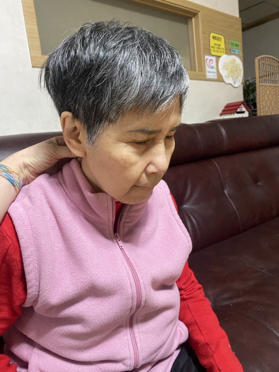 ② 진행 : 앉은자세에서 코에 오일냄새를 맡게 하고, 목 뒤쪽 후두하부를 롤링기법으로 마사지를 해준다