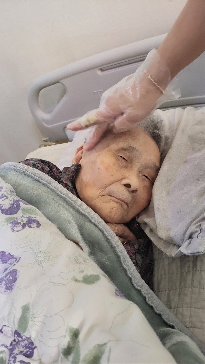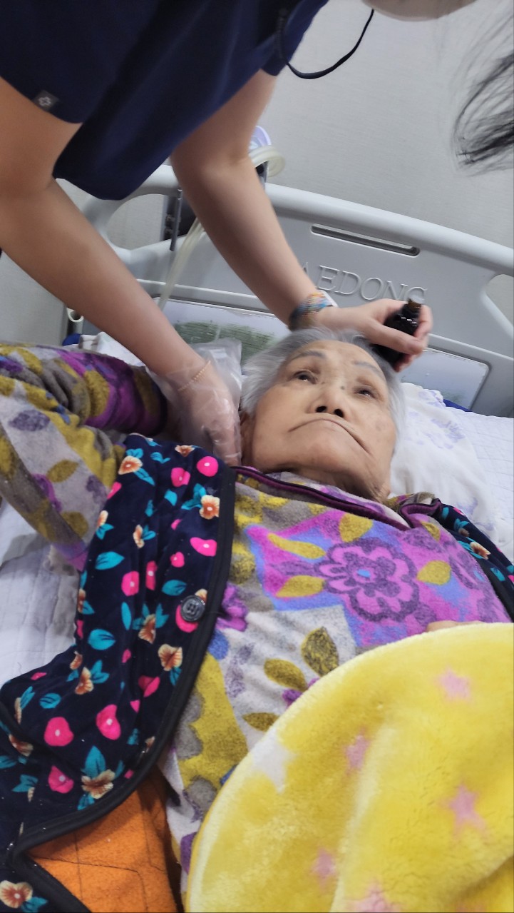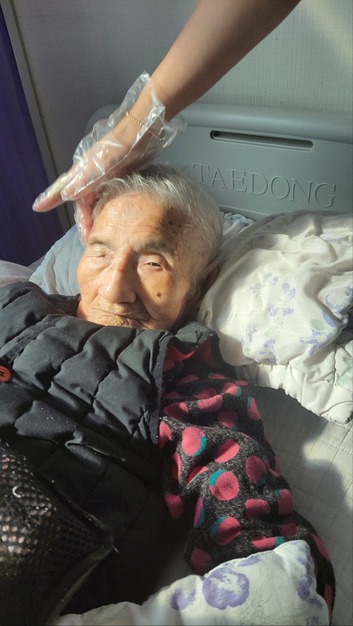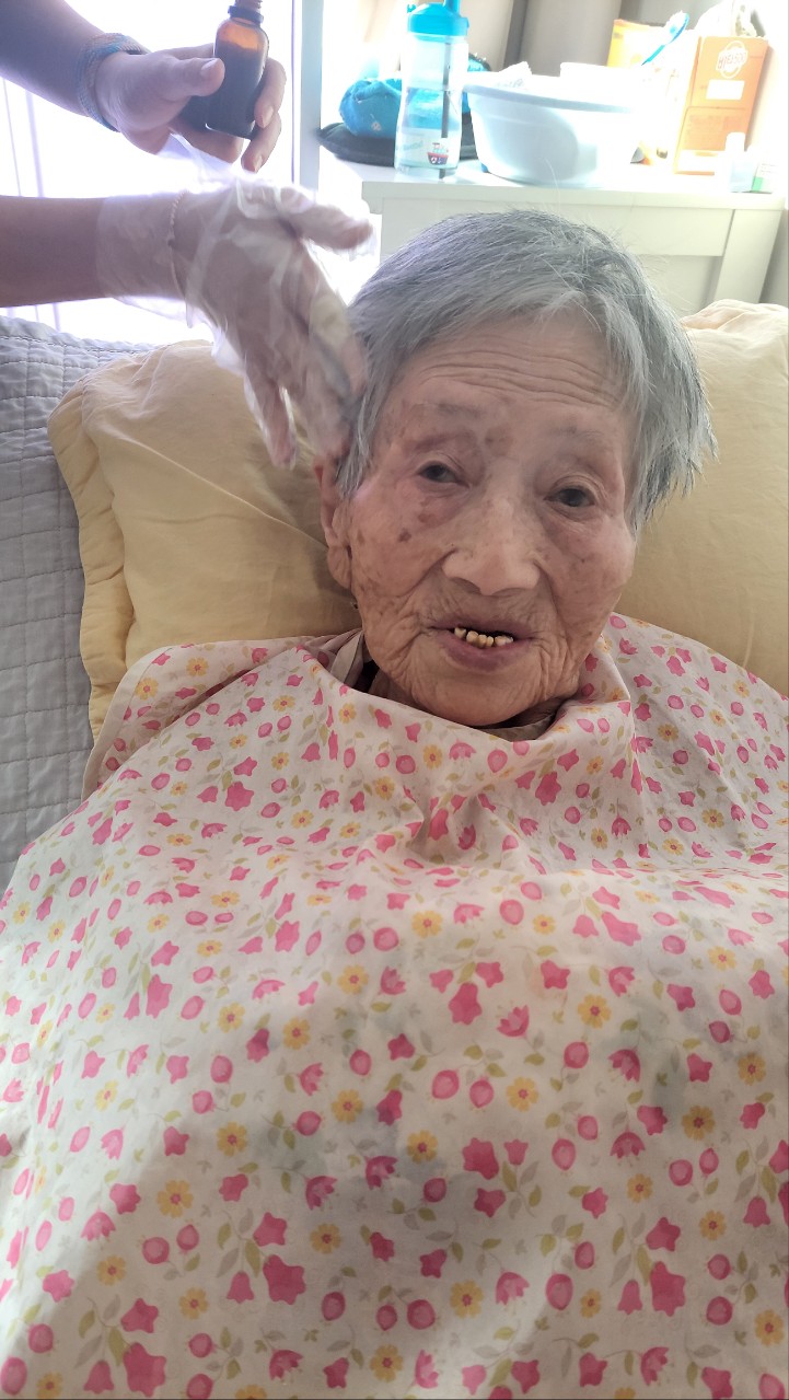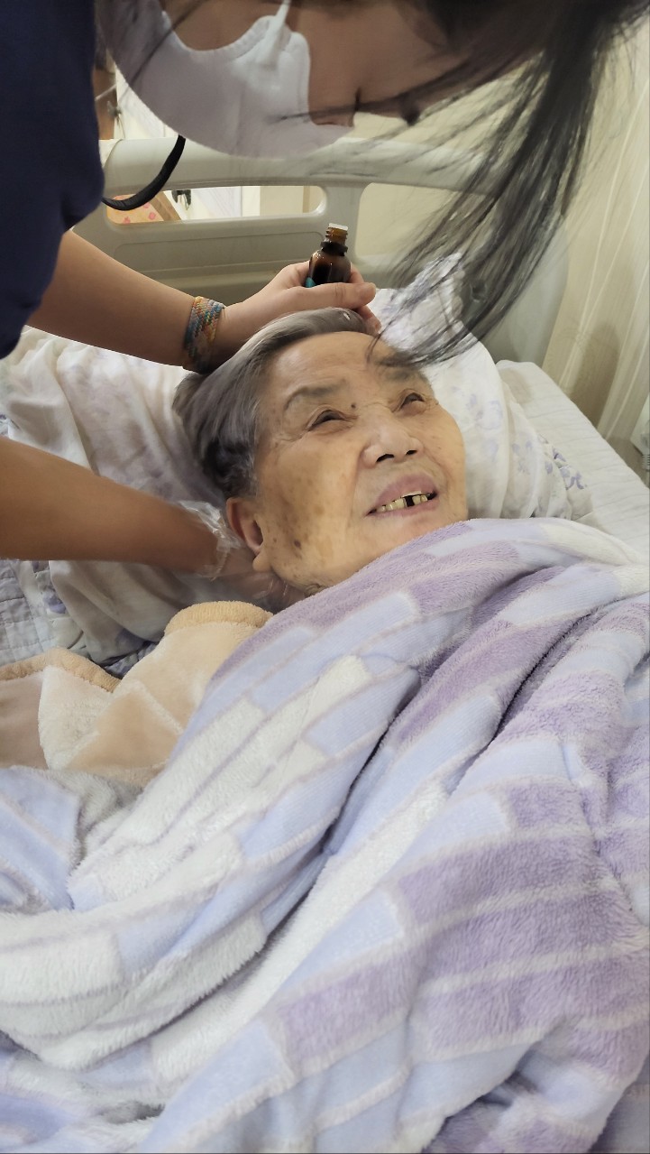 ② 진행 : 코에 오일 냄새를 맡게 하고, 관자놀이에 롤링기법으로 마사지를 해준다.